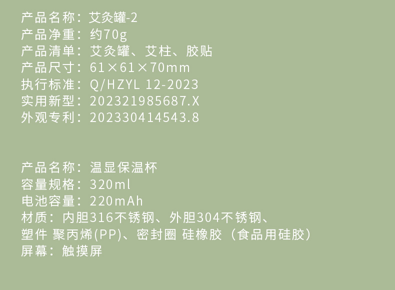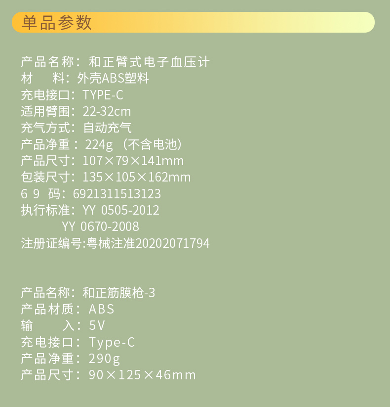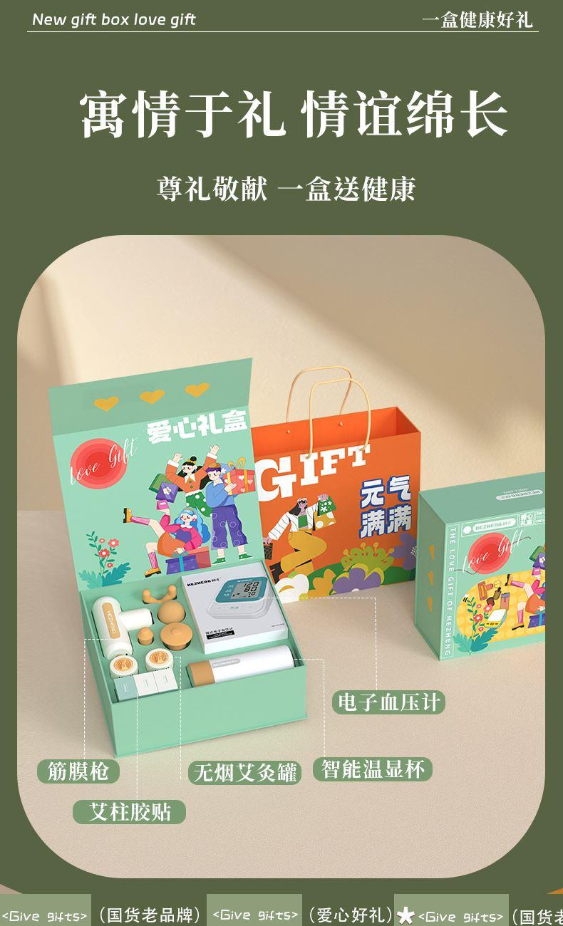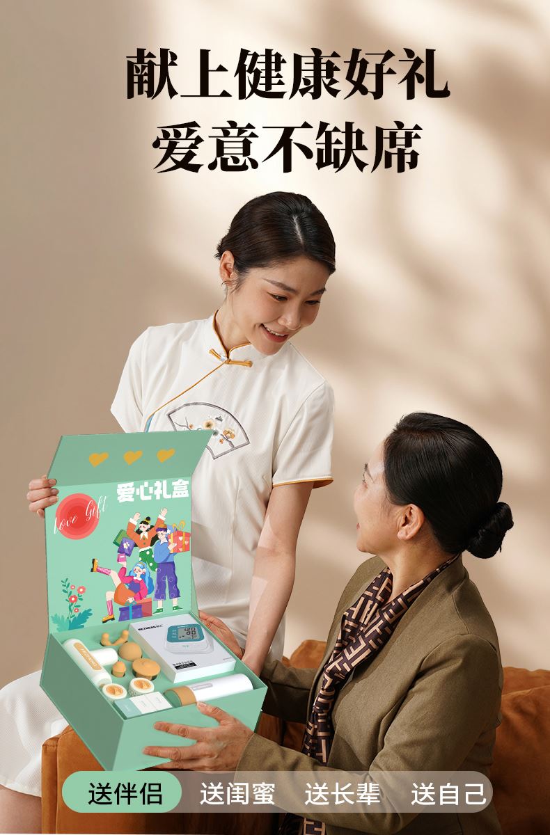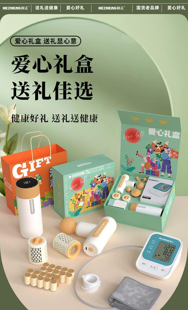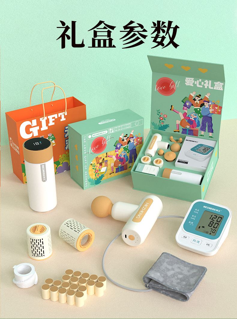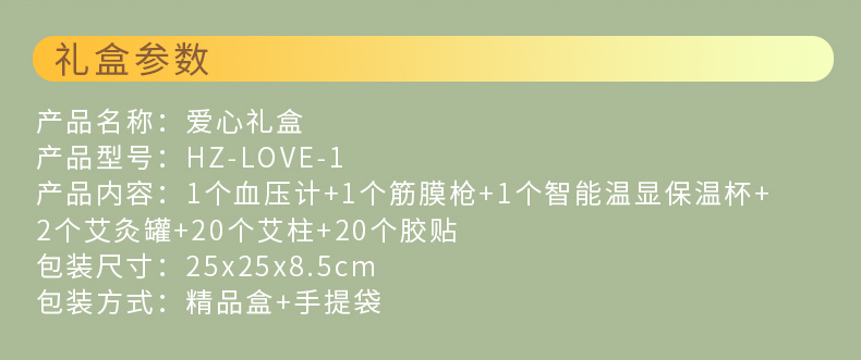产品内容: 1个血压计+1个筋膜枪+1个智能温显保温杯 +2个艾灸罐+20个艾柱+20个胶贴 包装尺寸:30.5×26×11.5cm 69码:6921311513352 包装方式:精品盒+手提袋 臂式电子血压计AES-U171 材 料:外壳ABS塑料 电 源:4节7号电池(DC6V) 测量方式:示波法 测量范围:0-280mmHg(0-37.33kPa) 脉搏范围:(40-199)次/分钟 血压精度:±3mmHg/ ±0.4kPa(血压) 脉搏精度:±5%(脉搏数)