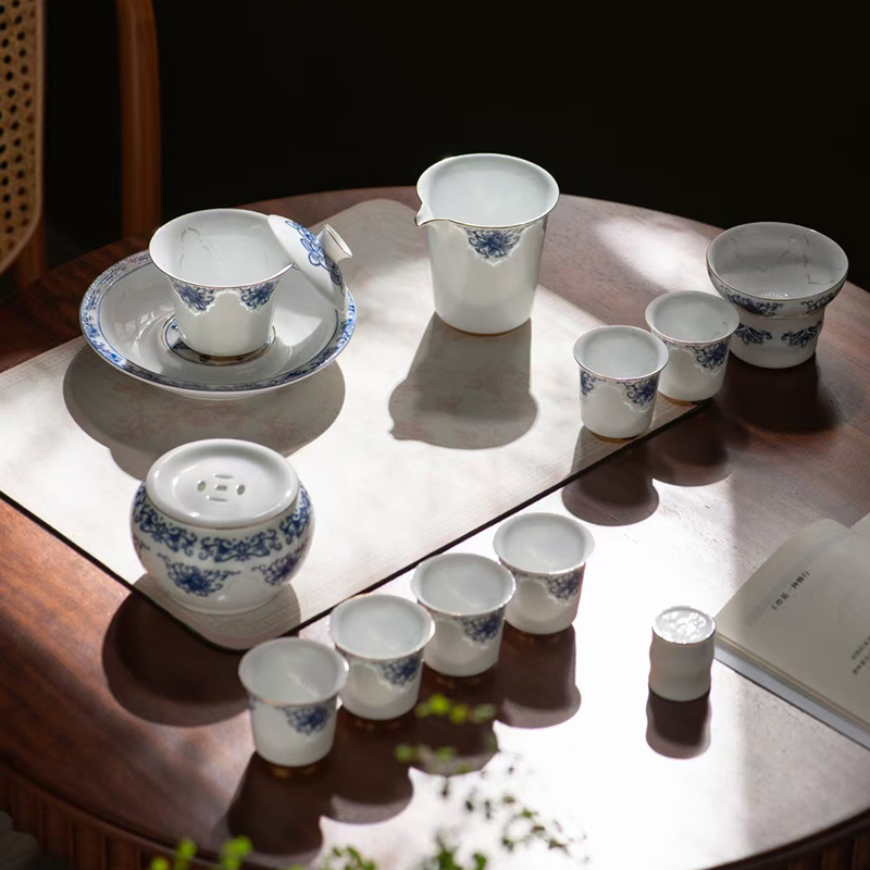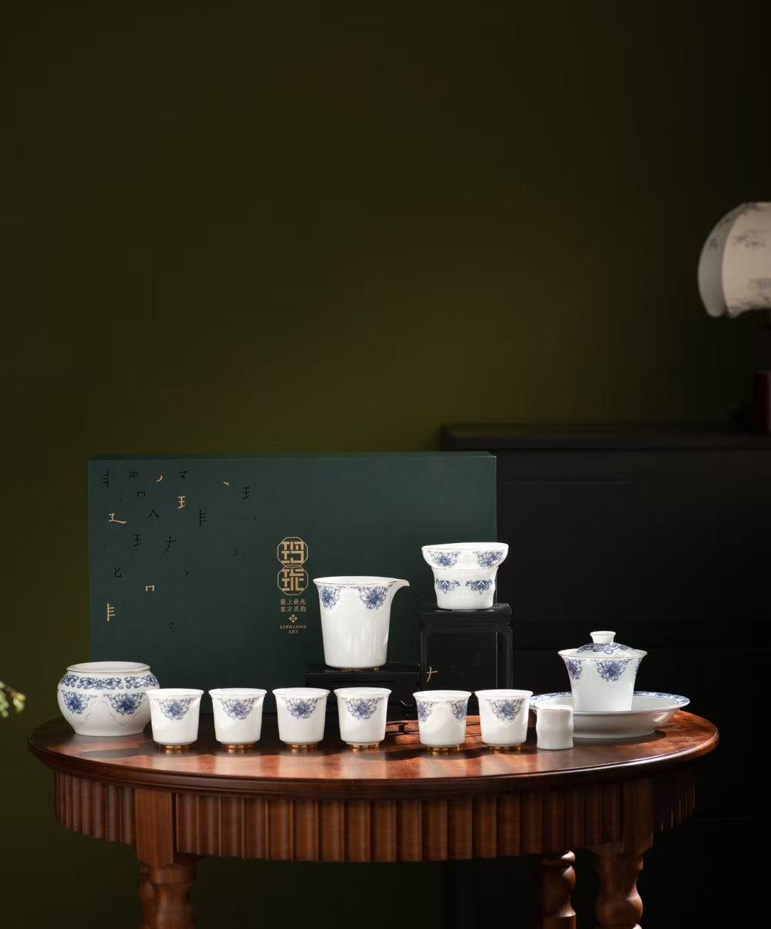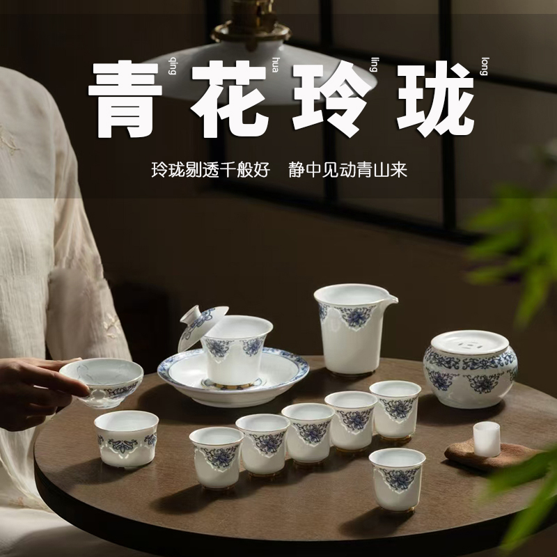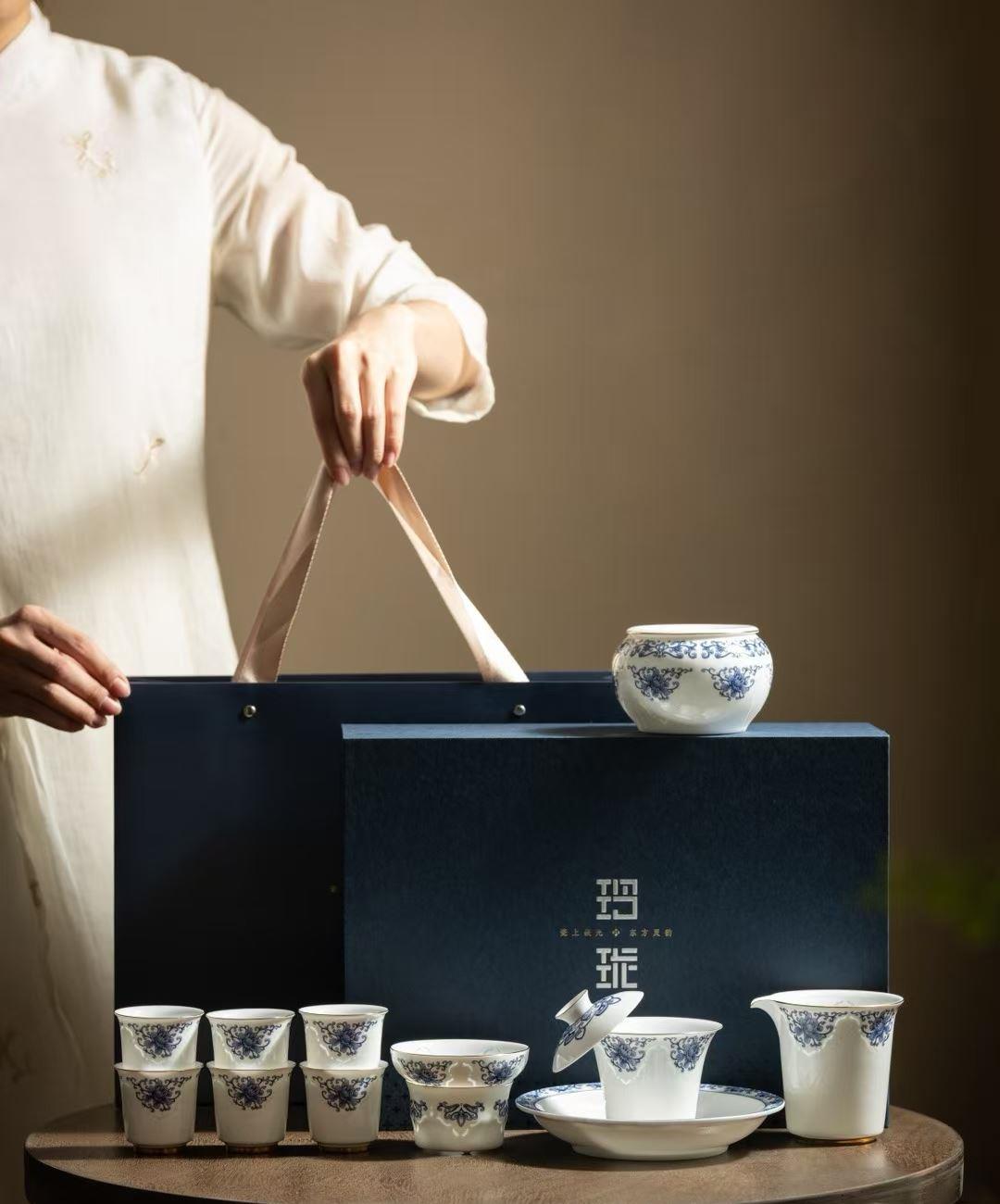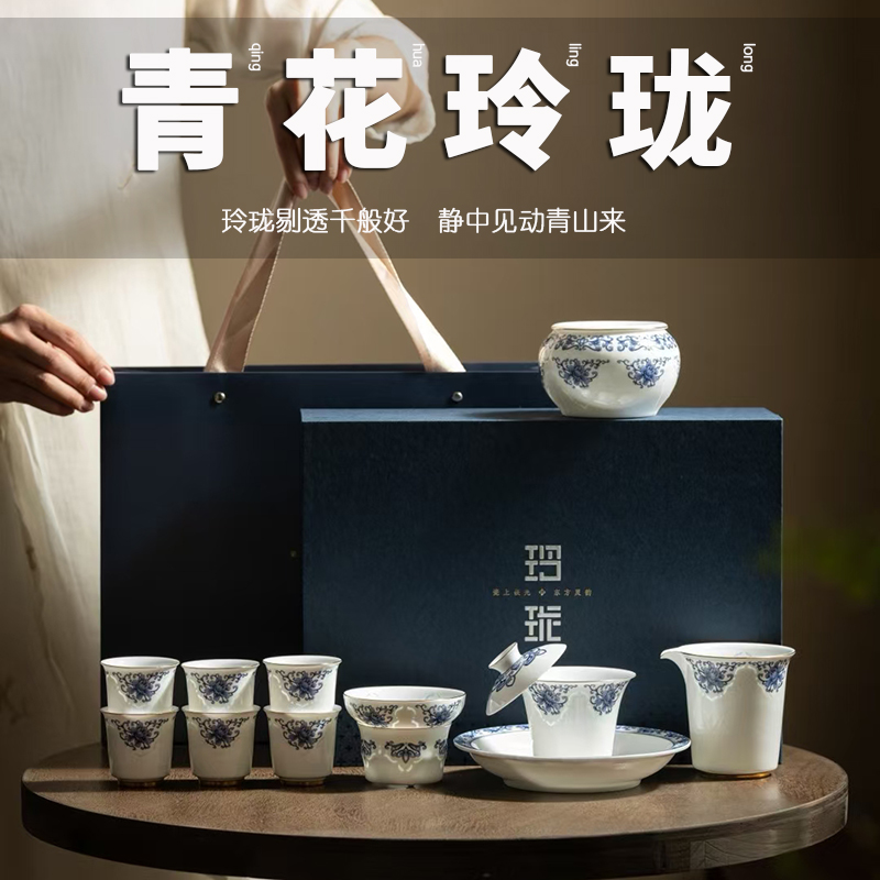 尾桥下窑青花玲珑瓷功夫茶具大套装商务会议礼品开门红节日伴手礼