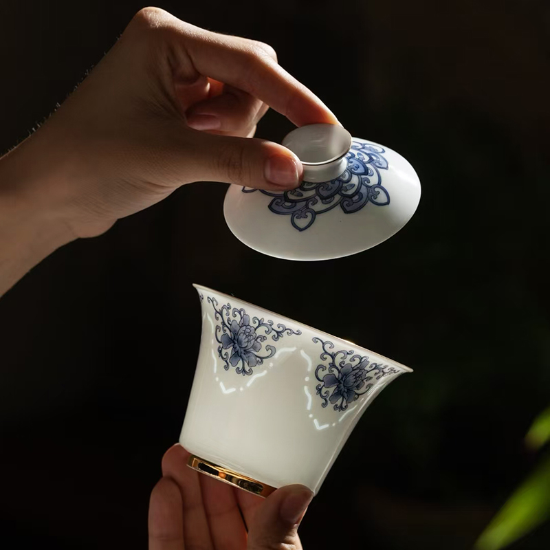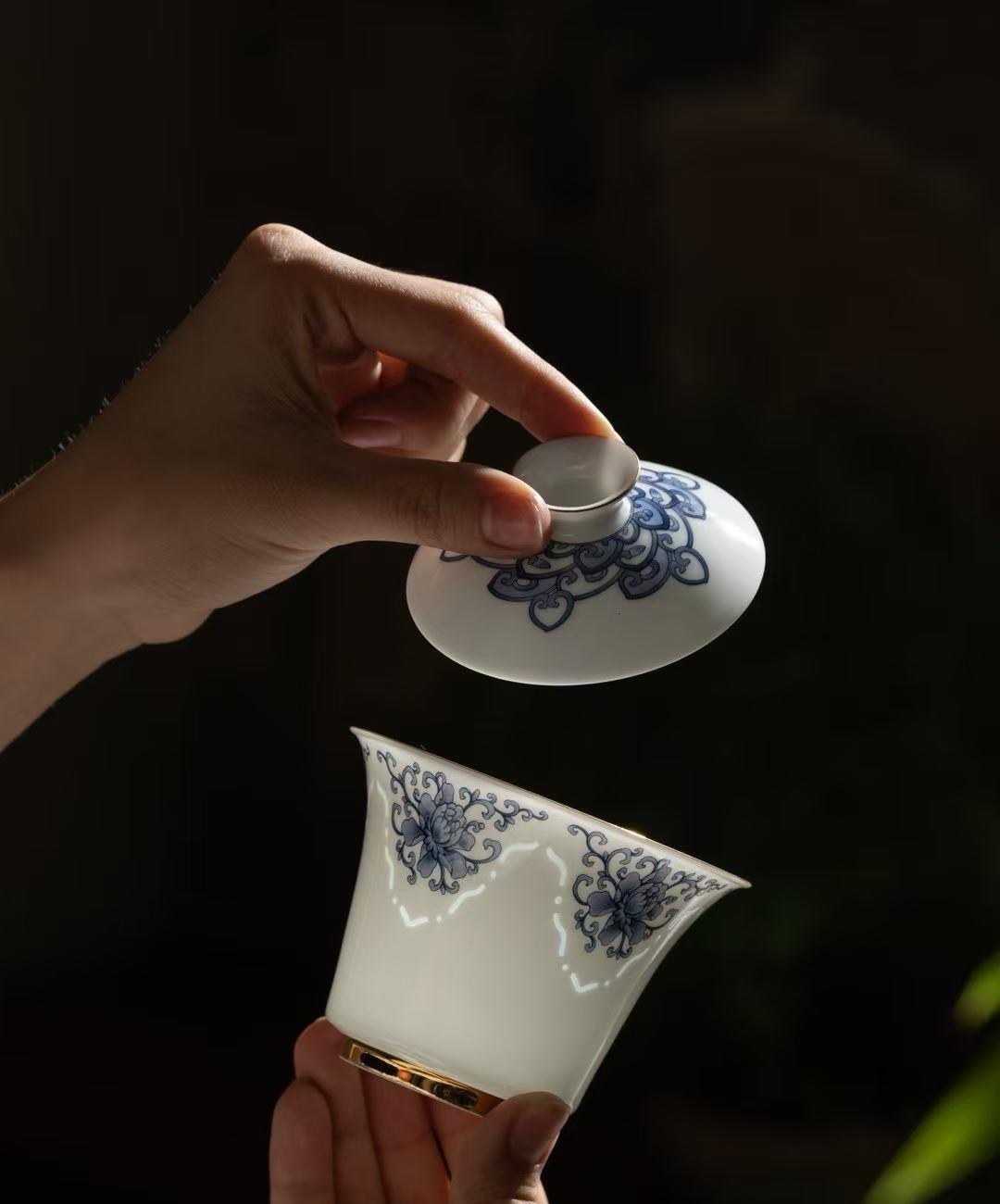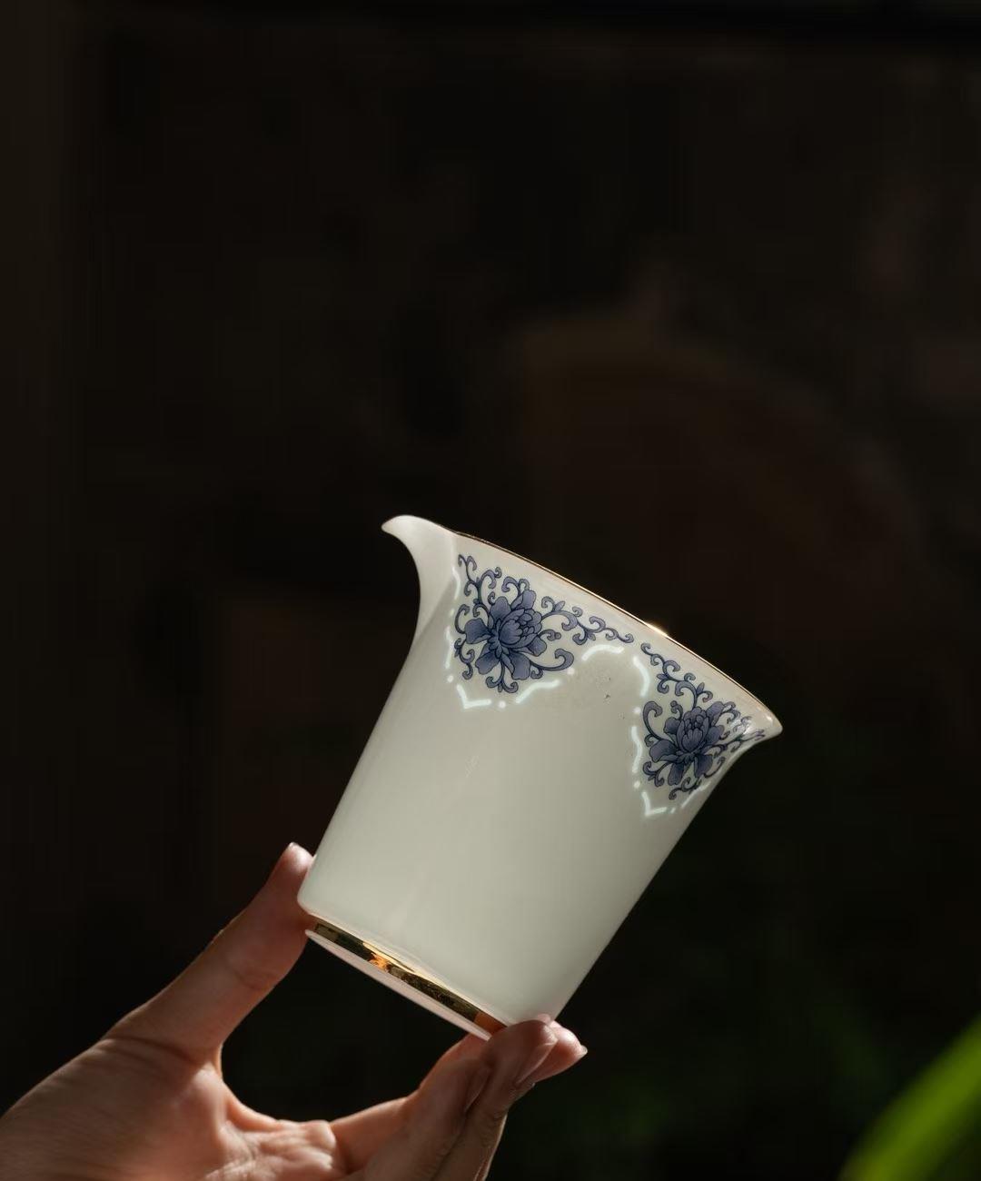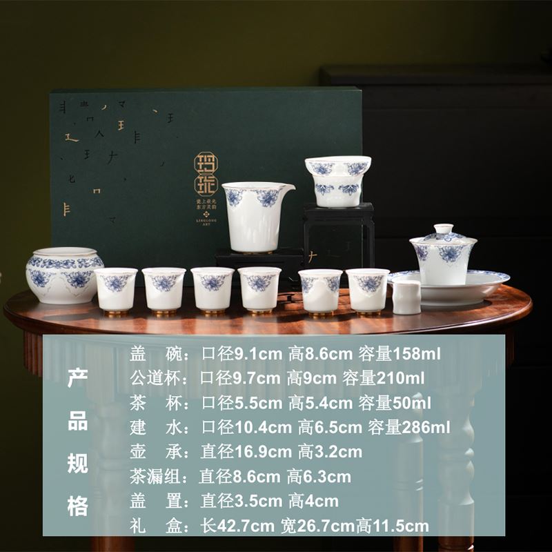 款式:青花缠枝莲/福言吉语 配置:盖碗:口径9.1cm 高8.6cm 容量158ml, 公道杯:口径9.7cm 高9cm 容量210ml, 茶杯:口径5.5cm 高5.4cm 容量50ml, 建水:口径10.4cm 高6.5cm 容量286ml, 壶承:直径16.9cm 高3.2cm, 茶漏组:直径8.6cm 高6.3cm, 盖 置:直径3.5cm 高4cm, 礼 盒:长42.7cm 宽26.7cm高11.5cm。