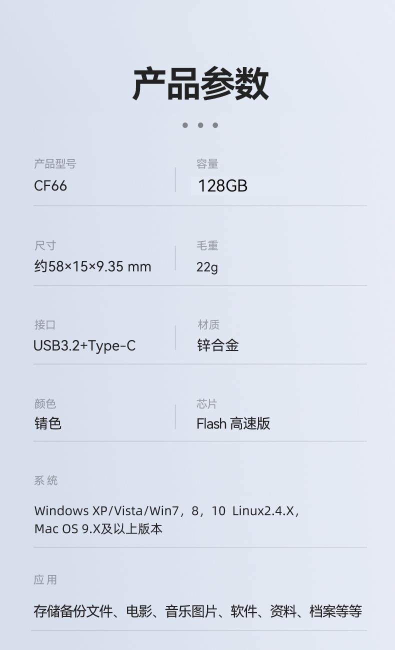 接口采用USB3.2,高速接口协议传输文件高效稳定, Flash 芯片高速版,360°旋转保护安全堡垒, 锖色电镀金属效果,坚固耐用, 原厂包装,送礼佳品。 产品尺寸:64.7x15x9.35 mm 单品重量:22g