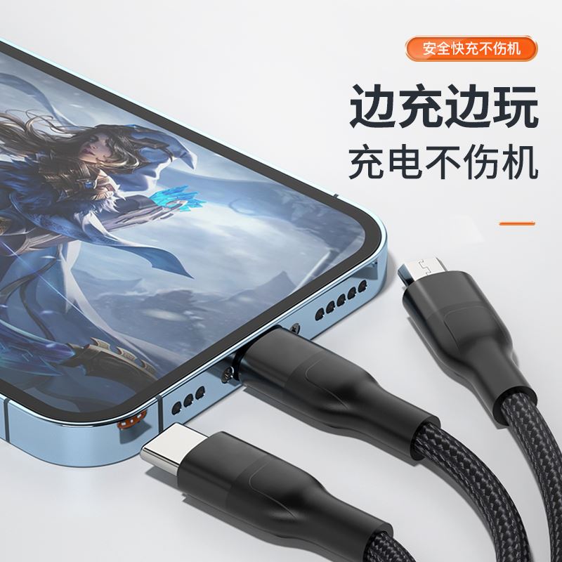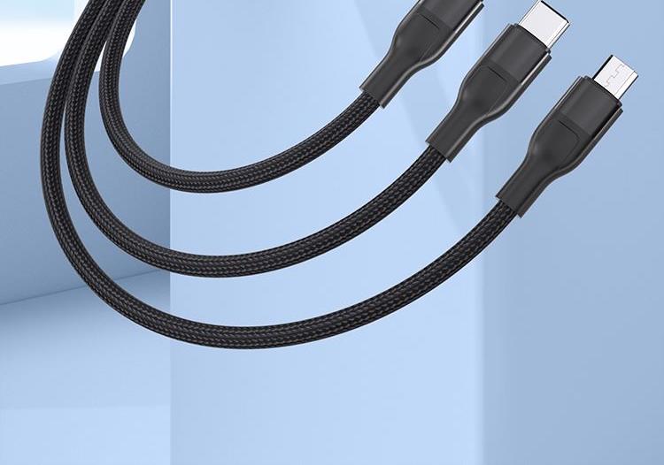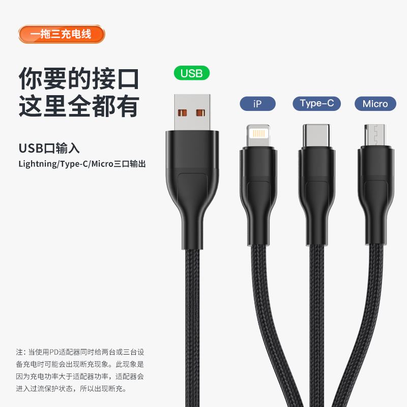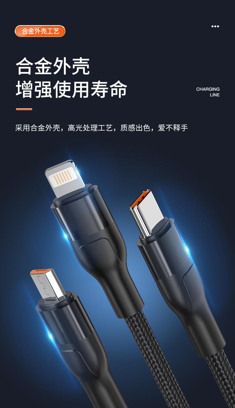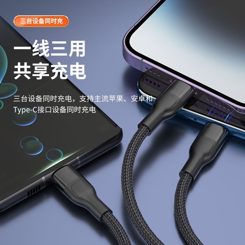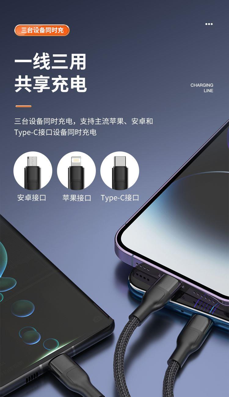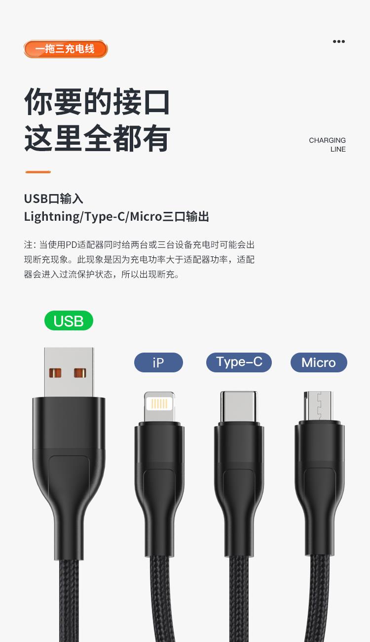 接口类型: USB TO Mirco+Lightning+Type-C 产品材质:编织 zui大功率:66W 单口zui大输出:T口11V/6A,M口5V/2A,i口5V/2.4A 双口/三口同时zui大输出: 5V/3.5A 整机重量: 67g,长度: 1.5M 包装尺寸:150*60*20mm
