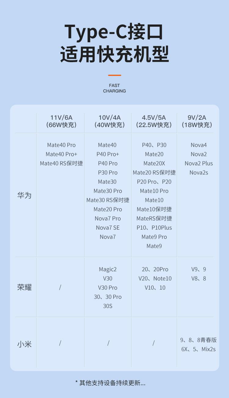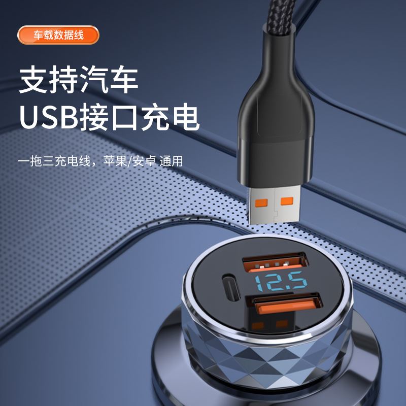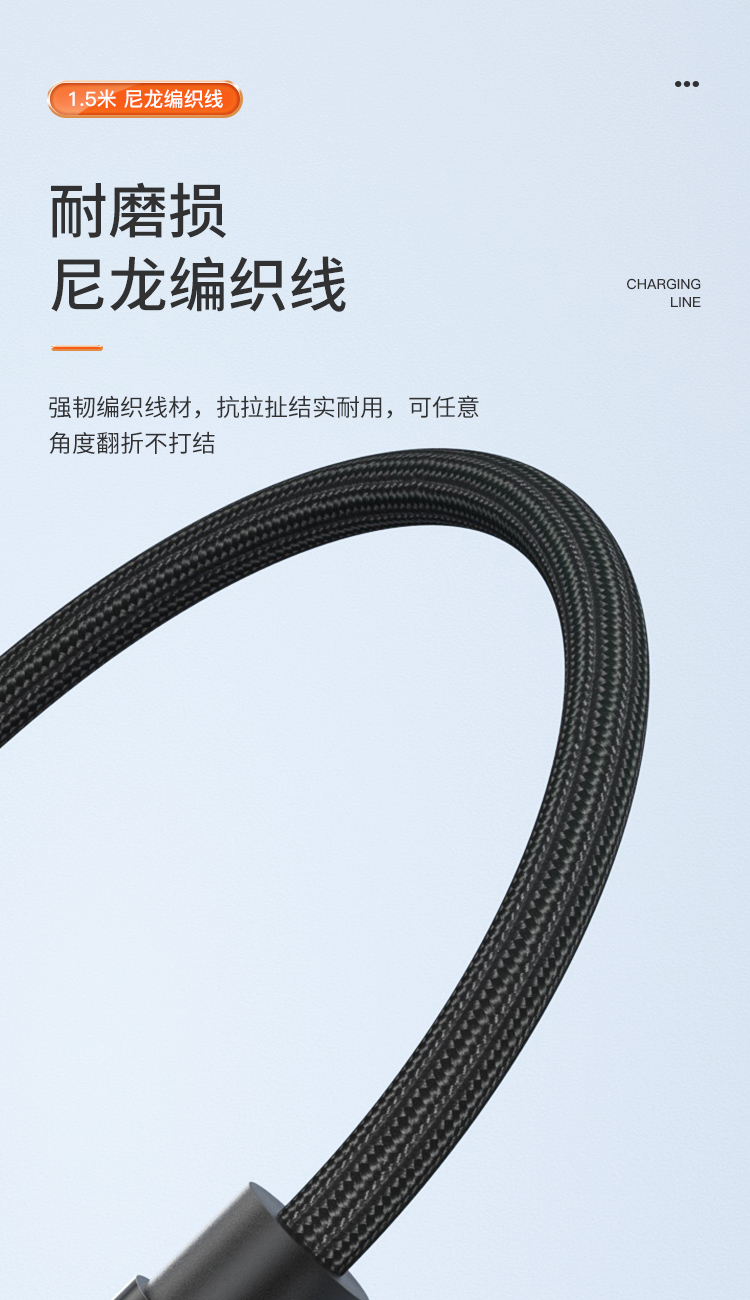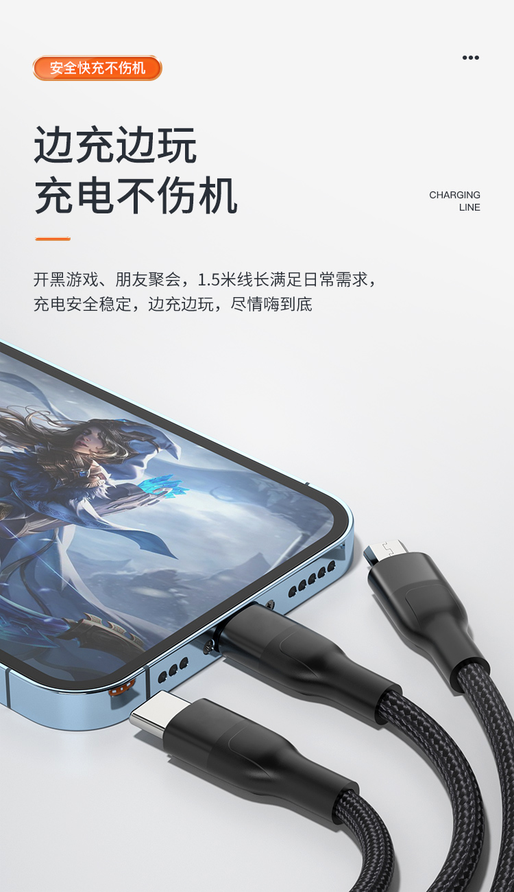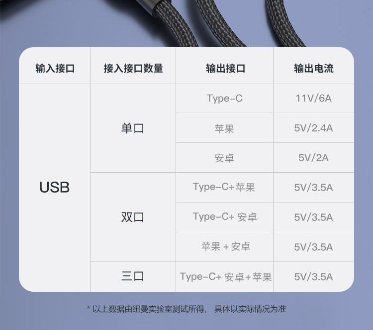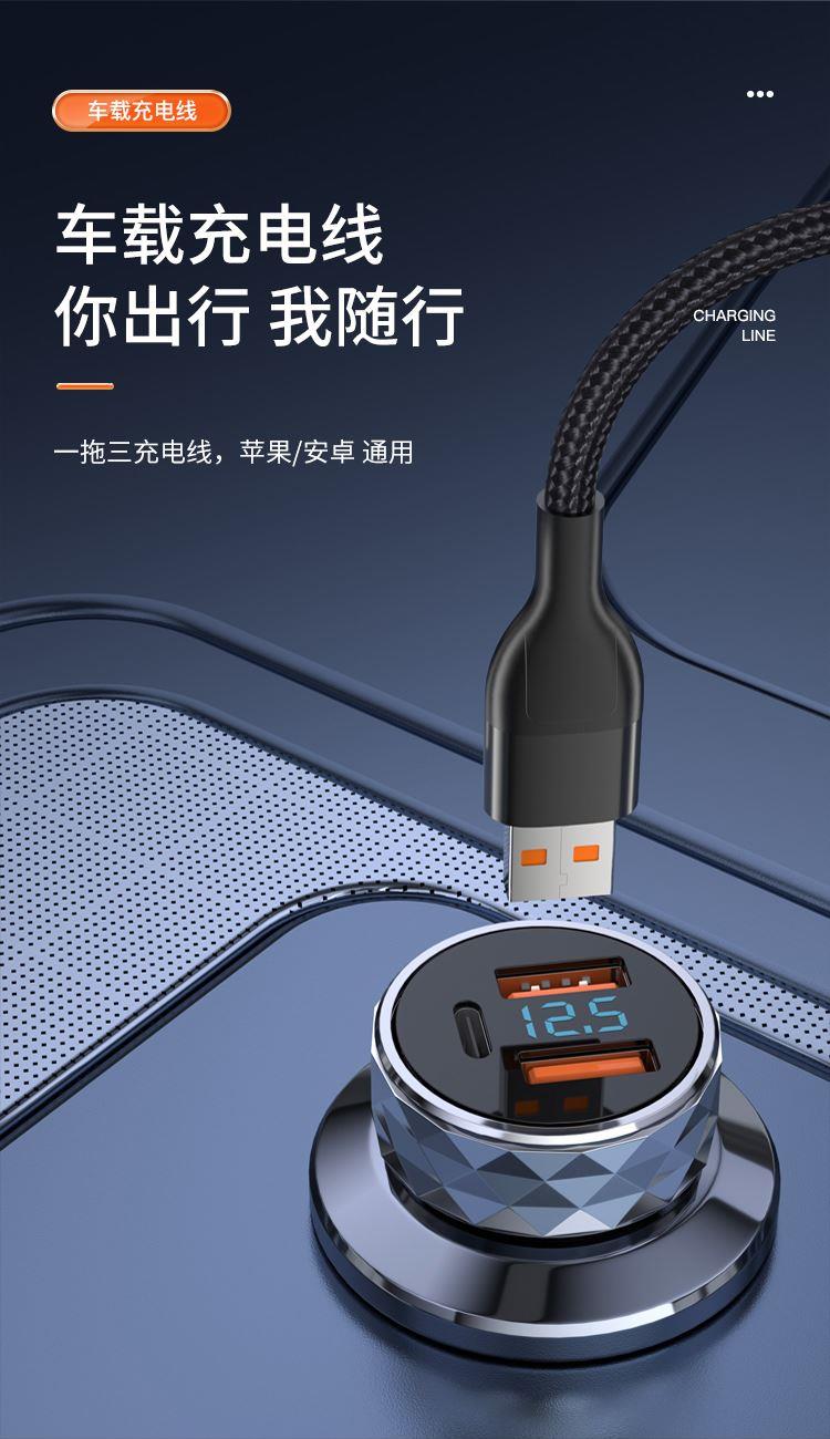 接口类型: USB TO Mirco+Lightning+Type-C 产品材质:编织 zui大功率:66W 单口zui大输出:T口11V/6A,M口5V/2A,i口5V/2.4A 双口/三口同时zui大输出: 5V/3.5A 整机重量: 67g,长度: 1.5M 包装尺寸:150*60*20mm