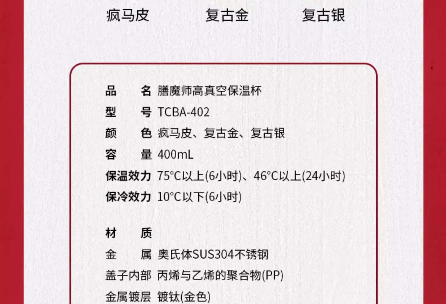 【注意3个颜色原价不一样】 颜 色:复古金GD 复古银SBK 疯马皮CHL 容 量:400ml 类 型:复古保温杯 定 制:可以定制 材 质:304 保 温:6小时约60°C 保 冷:6小时约11°C以下