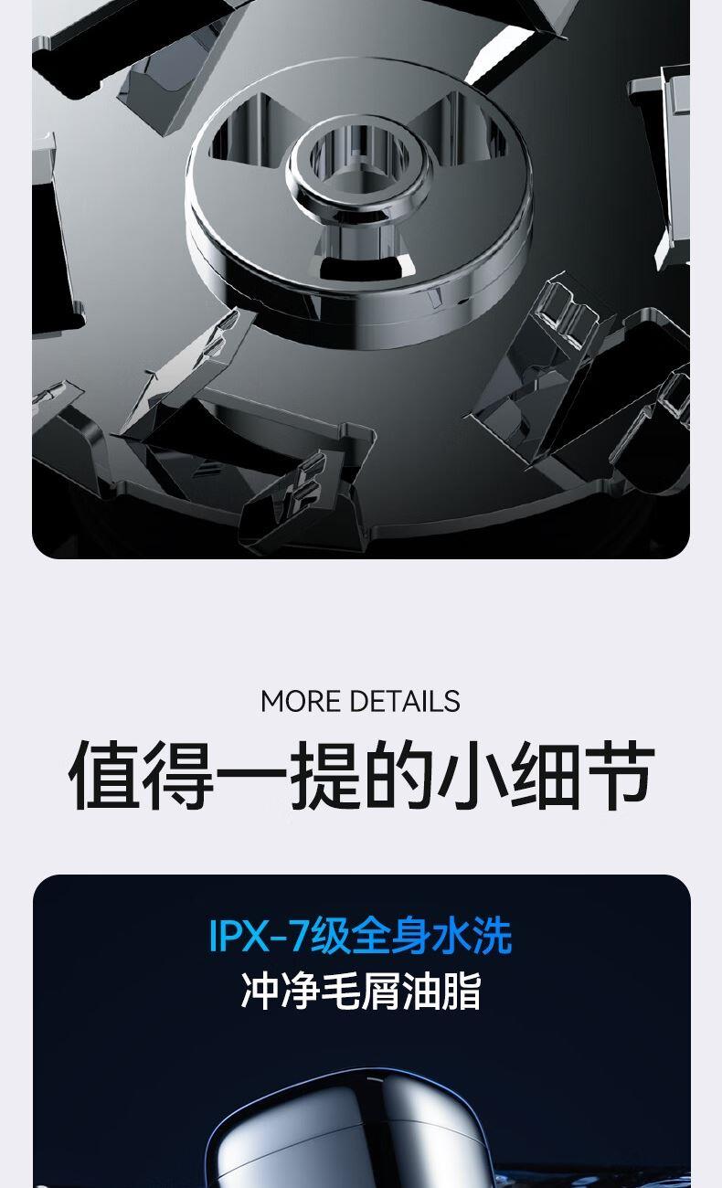 机身材质:PC+ABS 刀网类型:单环弧面刀网 电池容量:360毫安 电池材质:集成式双电芯锂电池 电机材料:精细强磁悬浮电机,6800转/分 充电接口:Tpye-C 续航时间:50分钟 充电时长:1小时 防水等级:ipx7级别 刀片材质:航空级马氏体不锈钢 刀片工艺:动刀工艺 刀头设计:磁吸式耐高温 特殊技术:三种转速调校设计