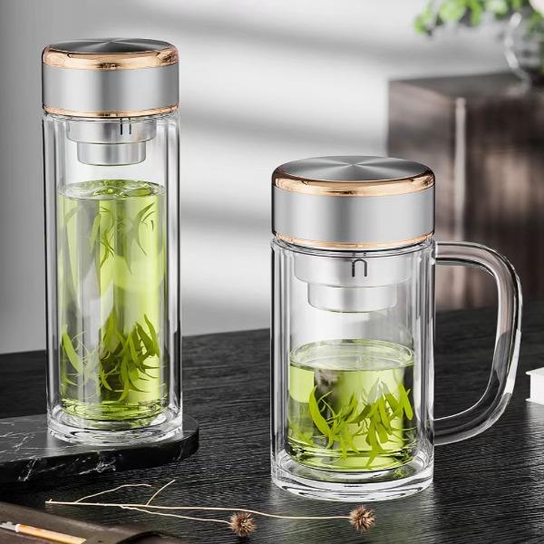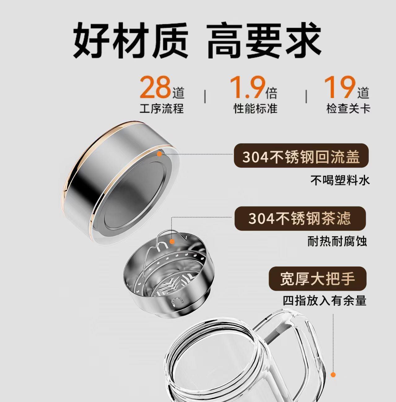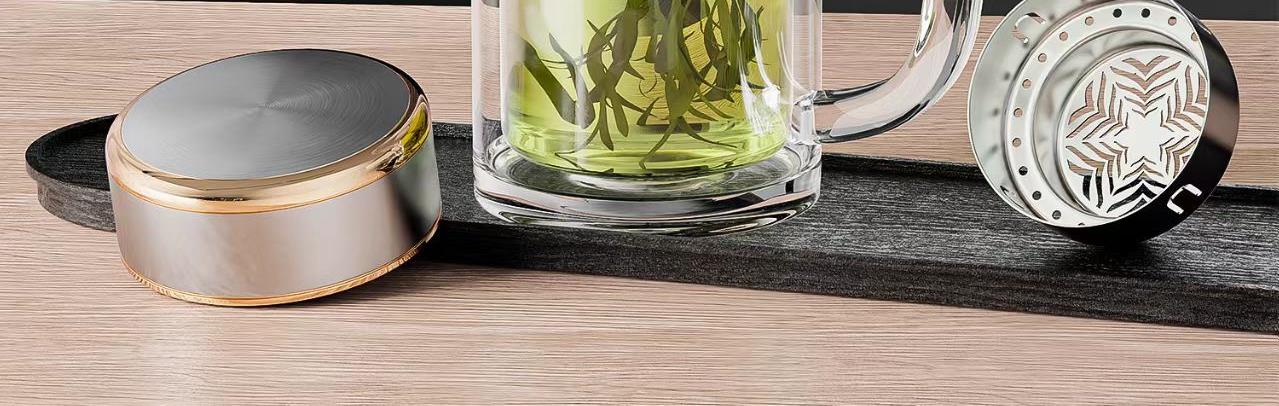 产品容量:300ML+3500ML 不锈钢亮光镀铜工艺组合盖, 气势磅礴,轻奢有度。 铂金级高硼硅玻璃杯身, 耐100°骤然温差,镇定自若。 双层高通透杯体,一体成型加厚杯底, 保温隔热,固若磐石。 304不锈钢独立下沉式滤网,滤出醇美茶汤。 两种杯形,家用办公两不误, 褪去浮华归本真与尔共赏。