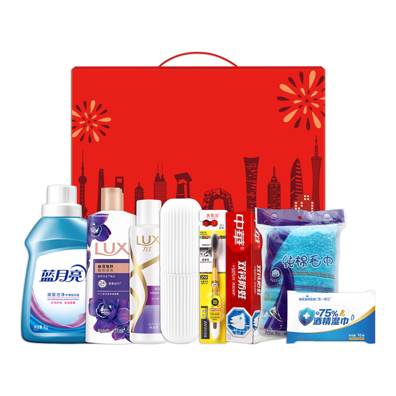 礼盒尺寸:32*8.5*24.5cm 包装尺寸:66*46.5*51CM 产品配置:(香型随机) 海氏海诺消毒湿巾10抽/包 蓝月亮洗衣液1kg 力士洗发水200ml 力士沐浴露350ml 中华牙膏90g 优思洁牙刷 纯棉毛巾73*33cm 洗漱杯