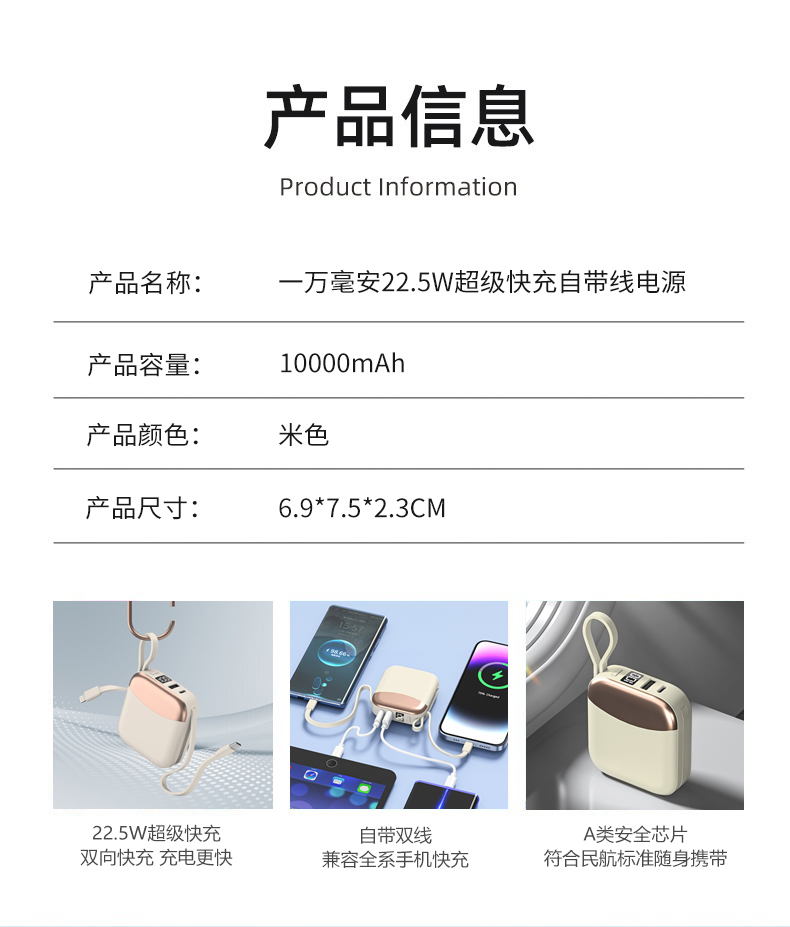 1、一万毫安22.5W超级快充内置线移动电源 22.5W超级快充,自带双线 数字电量显示 3C符合民航局标准,可随身携带 2、灵动环OWS夹耳式空气传导蓝牙耳机 云感夹耳设计 久戴不累 定向传音技术 智能通话降噪 触摸功能操作 数字屏电量