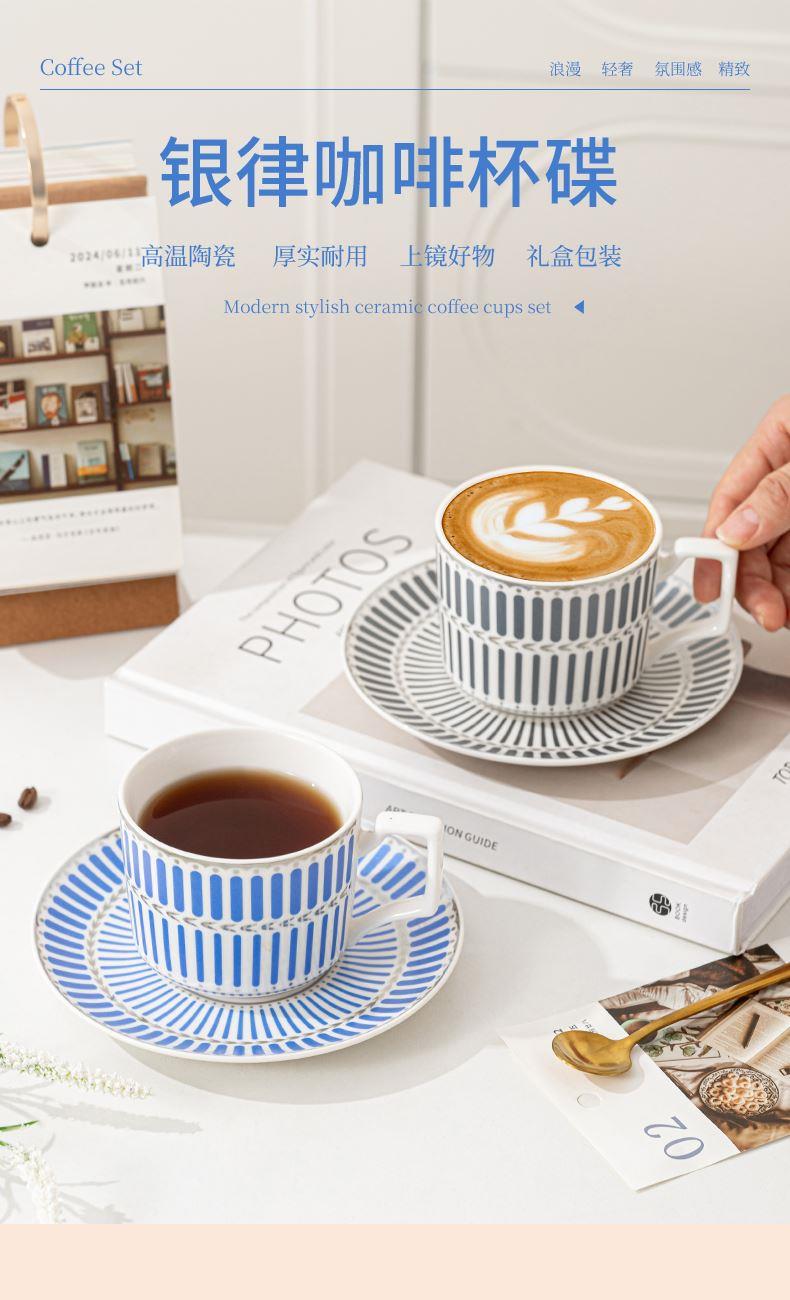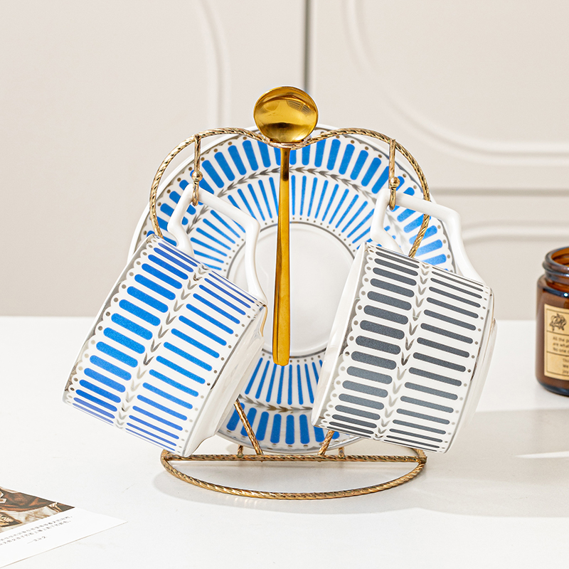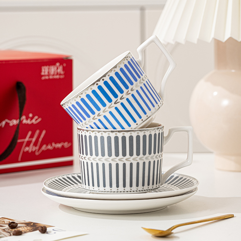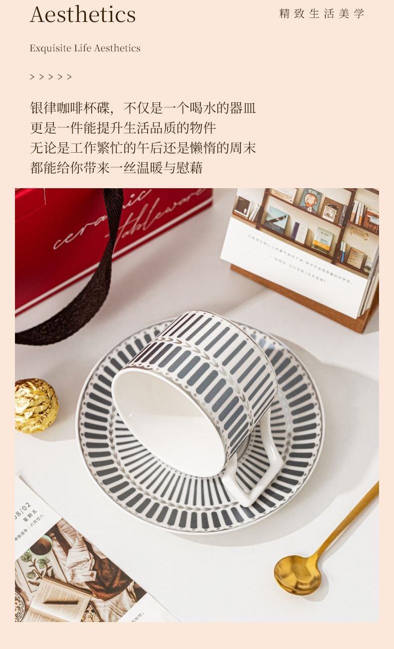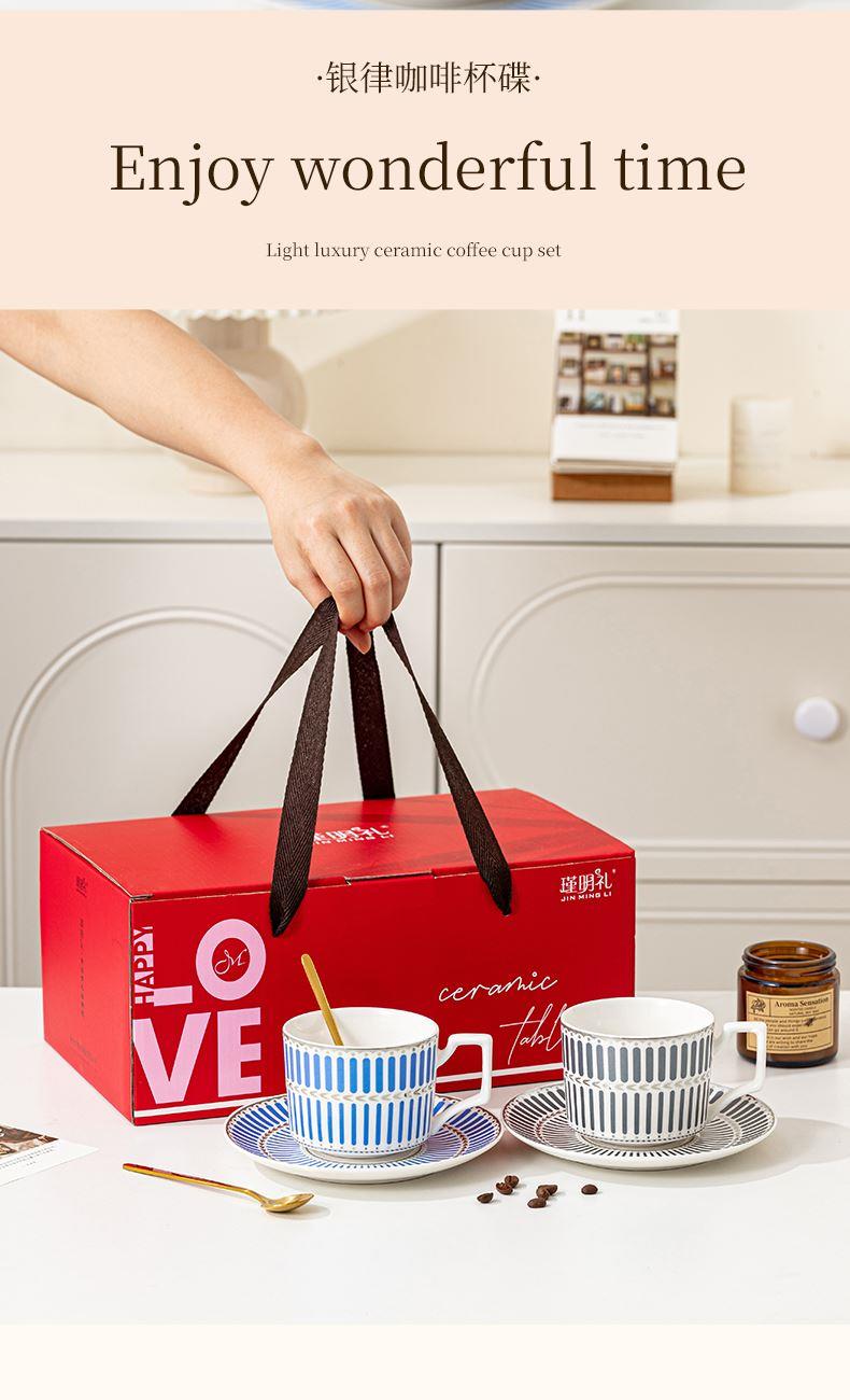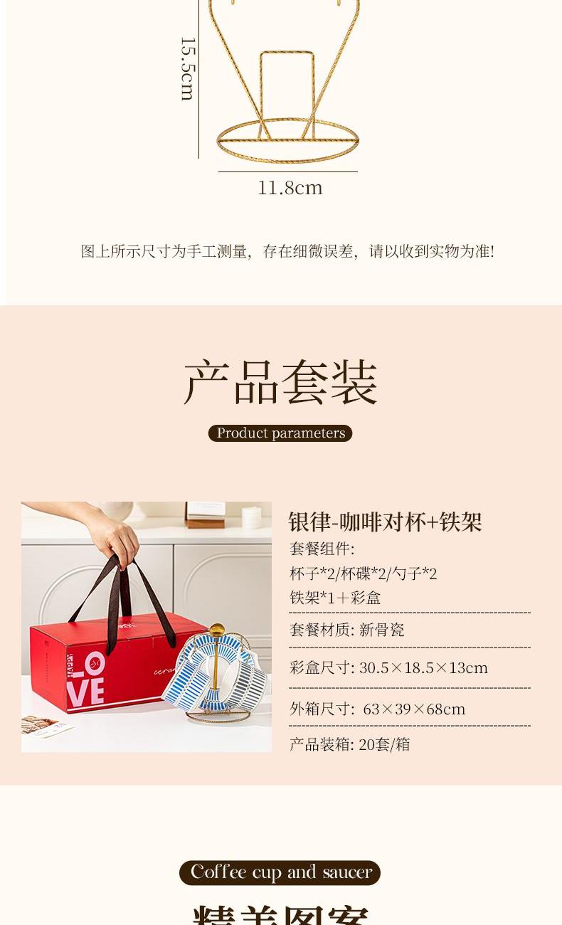 瑾明礼-银律咖啡对杯-2杯2碟2勺1铁架 - 产品组成:整套=2杯2碟2勺1铁架+彩盒 产品材质:新骨瓷 产品规格:咖啡杯=口径8.5cm,高度6.8cm,容量240ml;碟=直径15cm,高2cm;金勺=长度13cm;铁架=口径11.8cm,高度=15.5cm, 彩盒尺寸:30.5*18.5*13cm 产品毛重:1.3kg 整箱毛重:28kg 外箱尺寸:63*39*68cm - 线条和几何形状的设计往往带有一种抽象艺术的风格,能够满足消费者对于时尚和艺术的追求。这种设计不仅适合现代家居环境,还能成为时尚人士展示个性的单品。