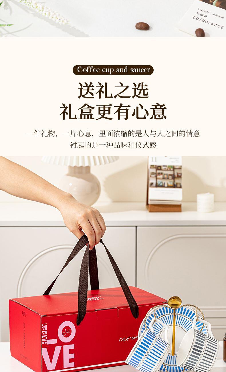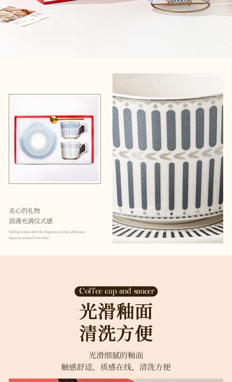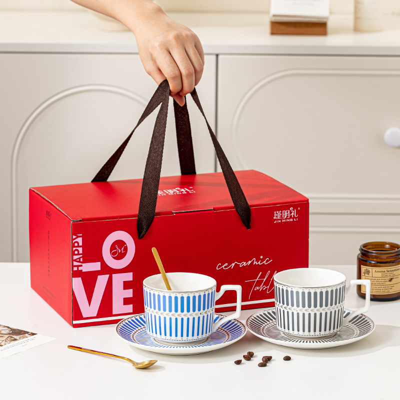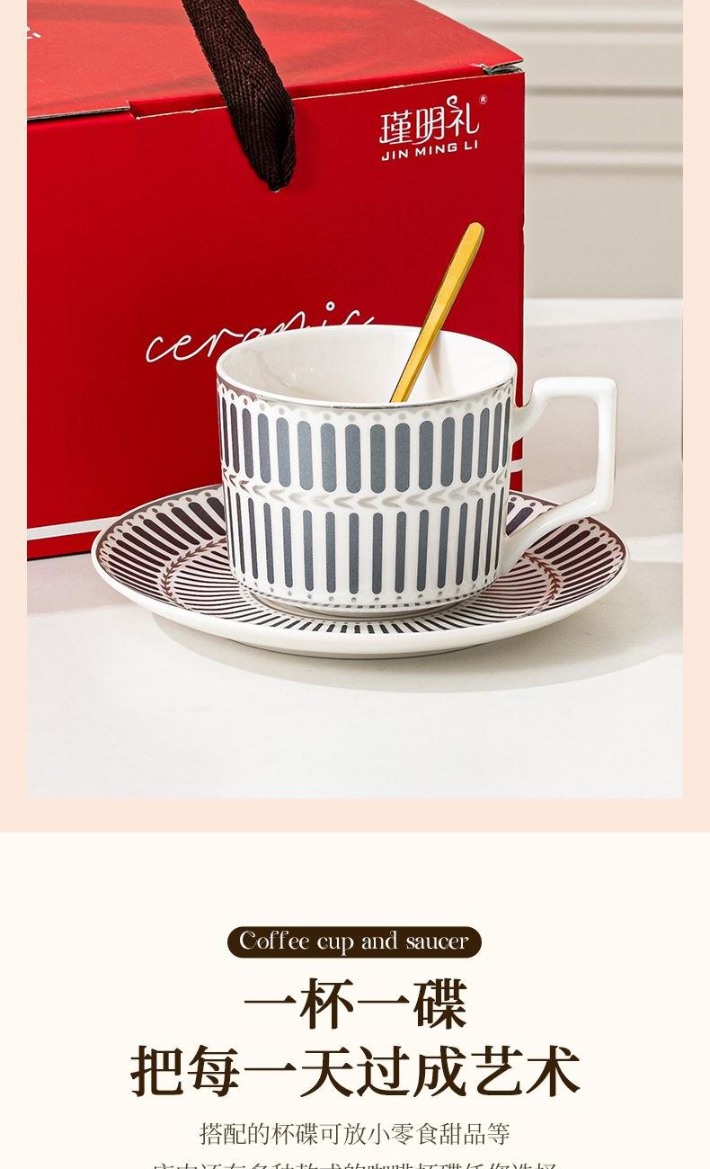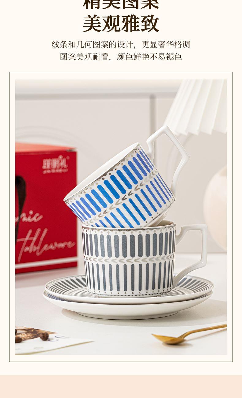 瑾明礼-银律咖啡对杯-2杯2碟2勺1铁架 - 产品组成:整套=2杯2碟2勺1铁架+彩盒 产品材质:新骨瓷 产品规格:咖啡杯=口径8.5cm,高度6.8cm,容量240ml;碟=直径15cm,高2cm;金勺=长度13cm;铁架=口径11.8cm,高度=15.5cm, 彩盒尺寸:30.5*18.5*13cm 产品毛重:1.3kg 整箱毛重:28kg 外箱尺寸:63*39*68cm - 线条和几何形状的设计往往带有一种抽象艺术的风格,能够满足消费者对于时尚和艺术的追求。这种设计不仅适合现代家居环境,还能成为时尚人士展示个性的单品。