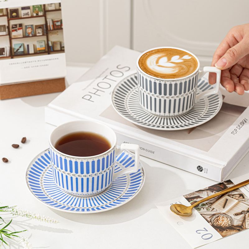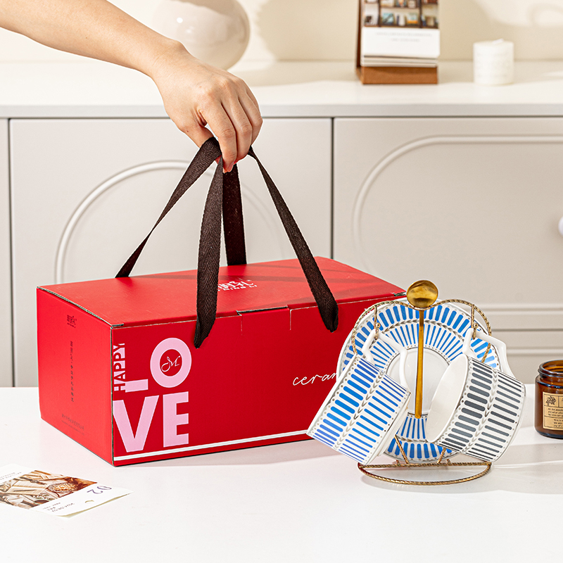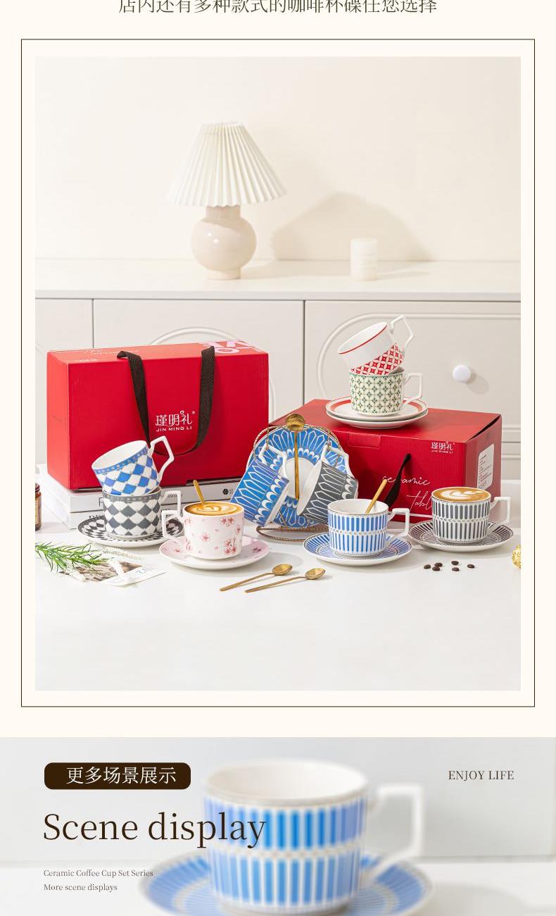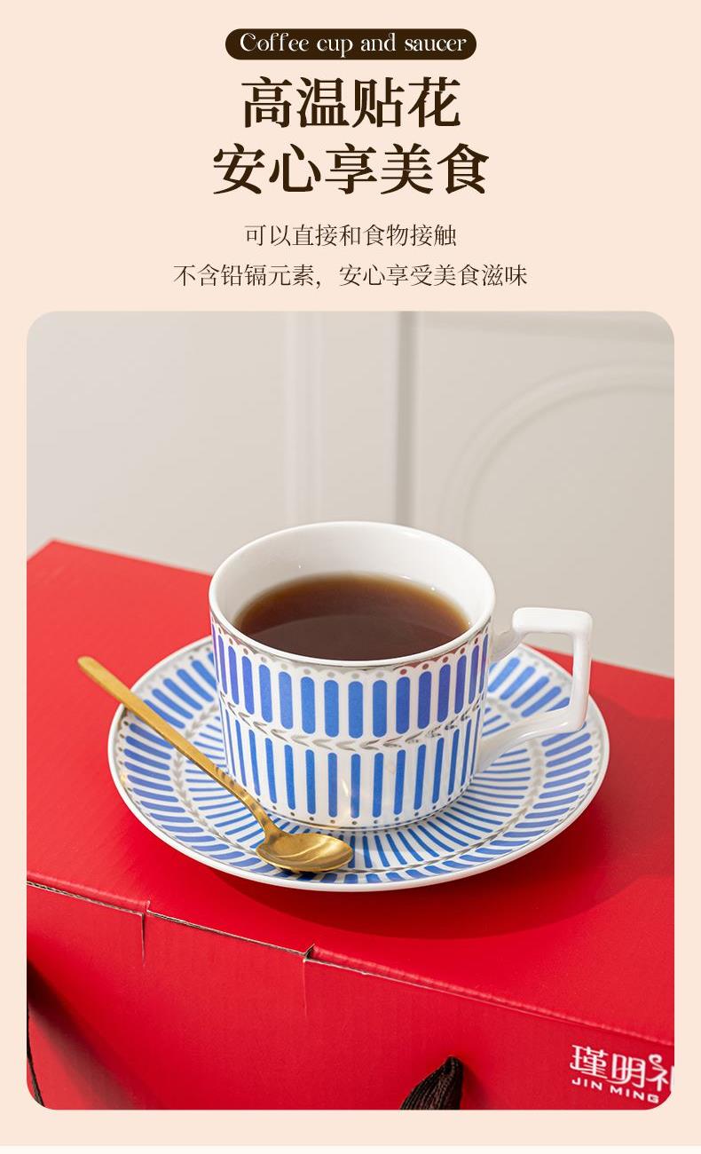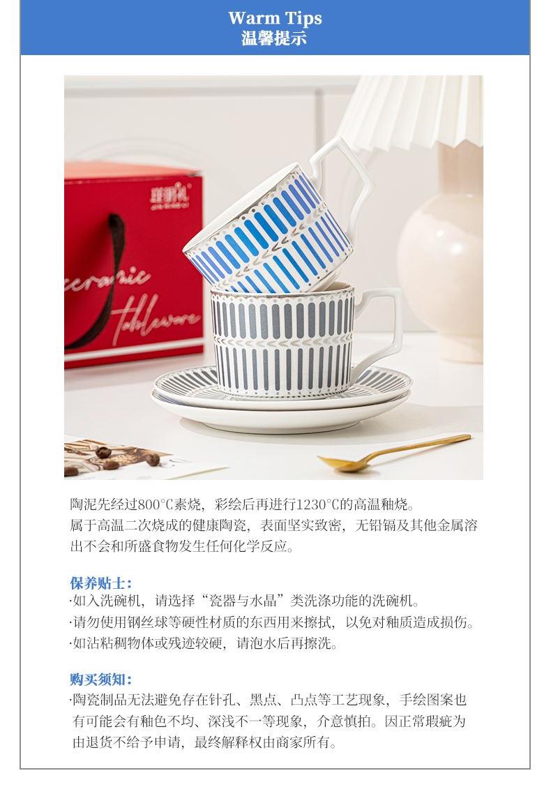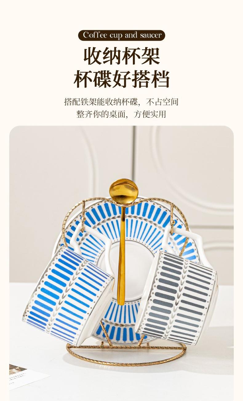 瑾明礼-银律咖啡对杯-2杯2碟2勺1铁架 - 产品组成:整套=2杯2碟2勺1铁架+彩盒 产品材质:新骨瓷 产品规格:咖啡杯=口径8.5cm,高度6.8cm,容量240ml;碟=直径15cm,高2cm;金勺=长度13cm;铁架=口径11.8cm,高度=15.5cm, 彩盒尺寸:30.5*18.5*13cm 产品毛重:1.3kg 整箱毛重:28kg 外箱尺寸:63*39*68cm - 线条和几何形状的设计往往带有一种抽象艺术的风格,能够满足消费者对于时尚和艺术的追求。这种设计不仅适合现代家居环境,还能成为时尚人士展示个性的单品。