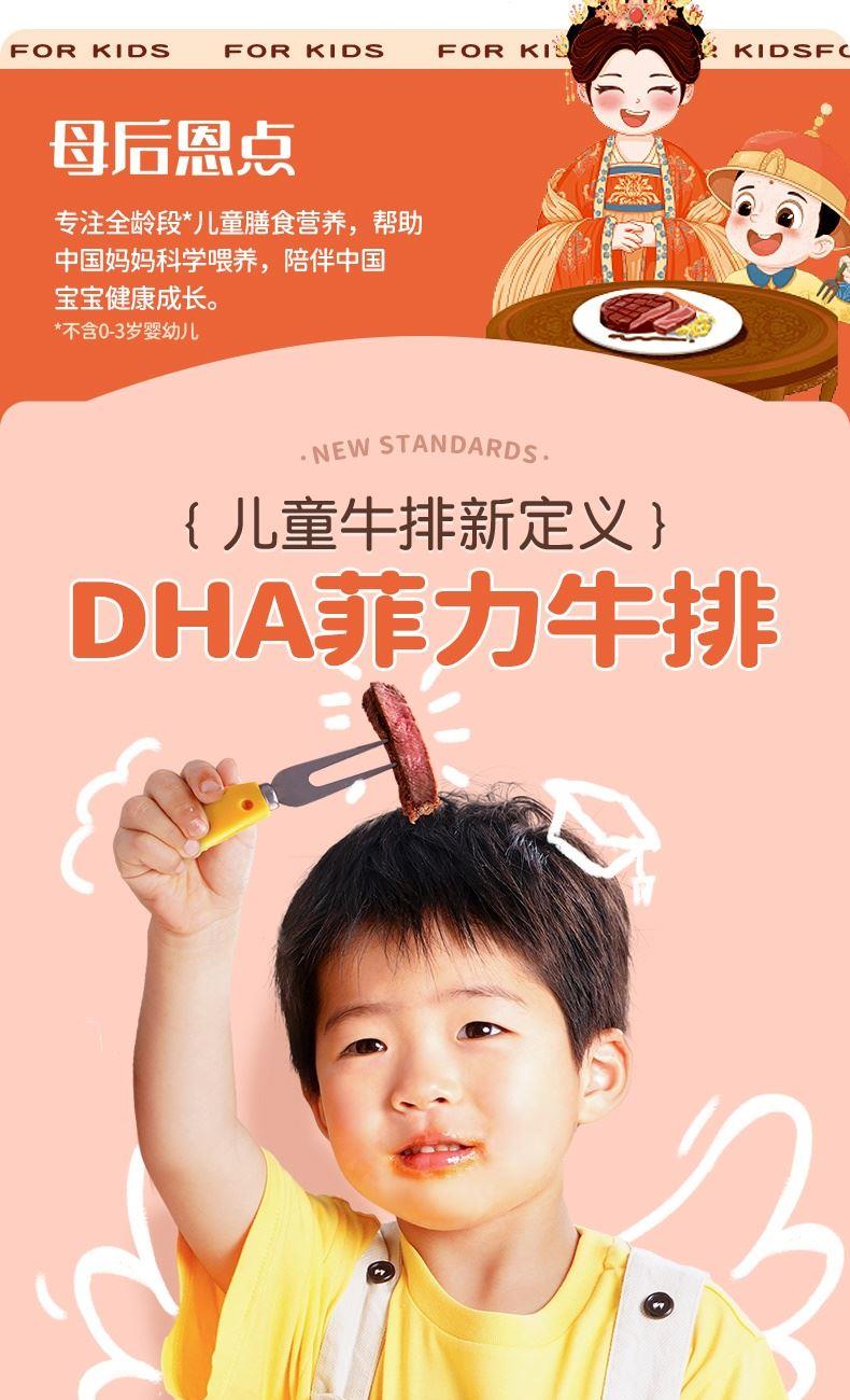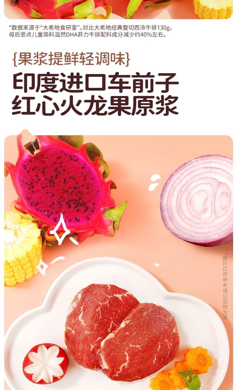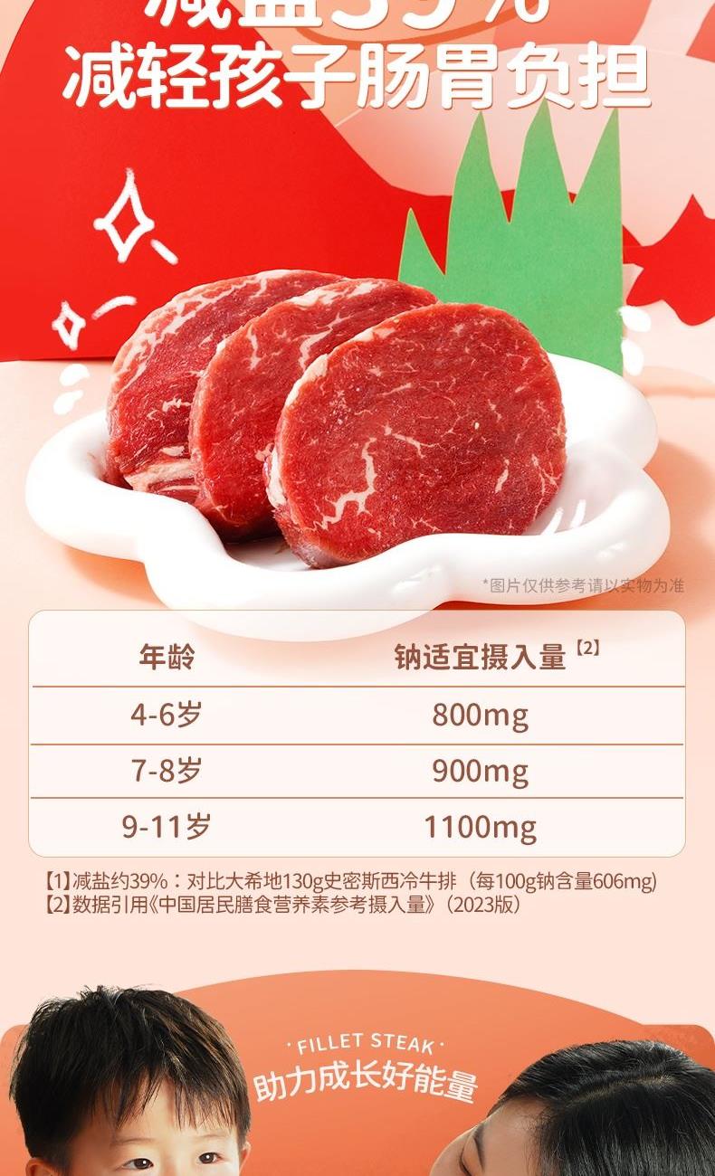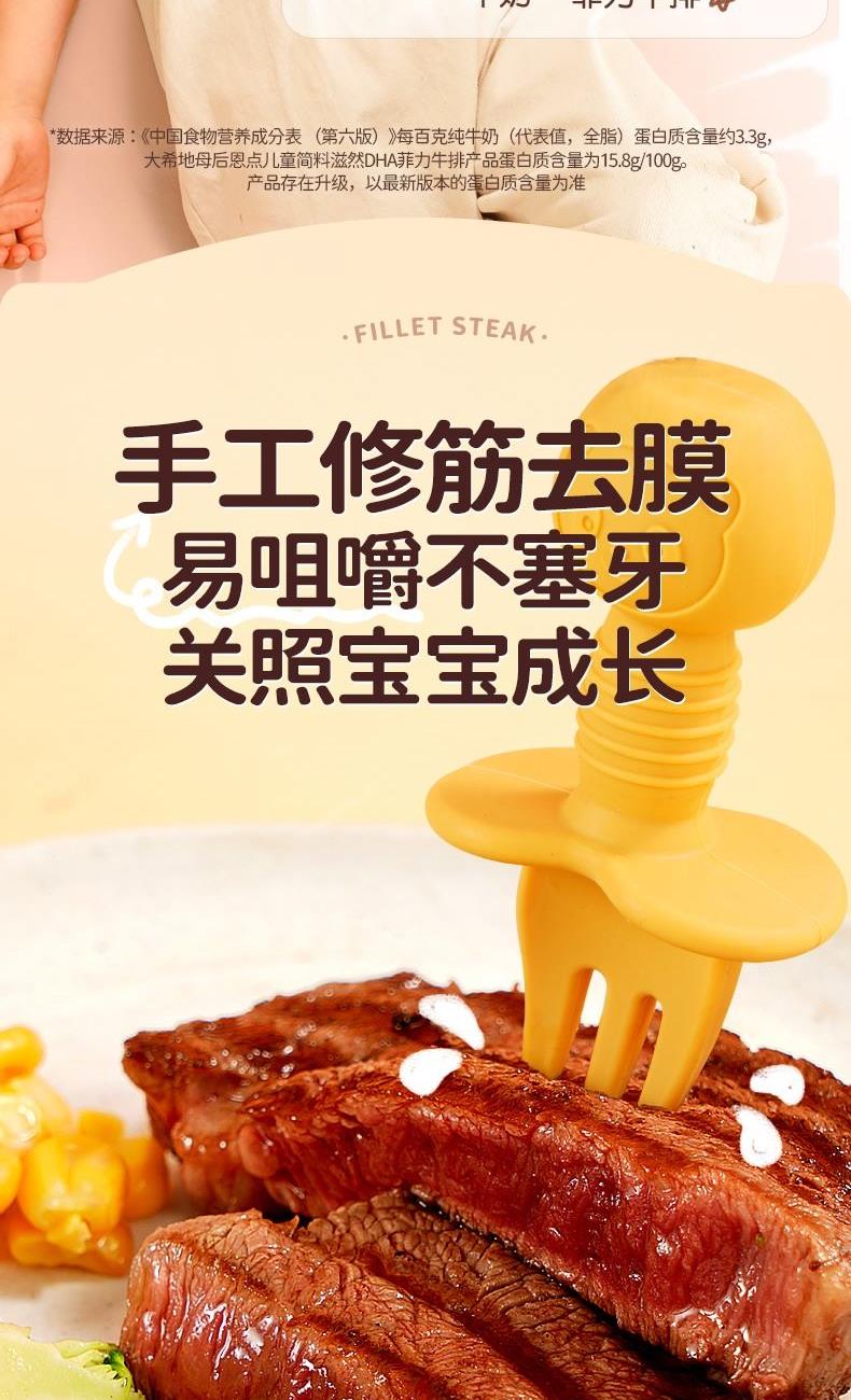 产品参数配置 母后恩点儿童整切菲力:400g / 份,共 2 份 赠品人生黑酱:160g / 份,共 1 份 赠品刀叉:1 副 产品卖点说明 儿童专属菲力,细嫩易嚼:选用整切菲力部位,肉质柔滑细嫩,适配儿童咀嚼能力,无复杂调味,家长更放心。 配套齐全,便捷备餐:含 2 份牛排 + 专属酱料 + 刀叉,无需额外采购,简单煎制即可完成儿童餐,省时省力。