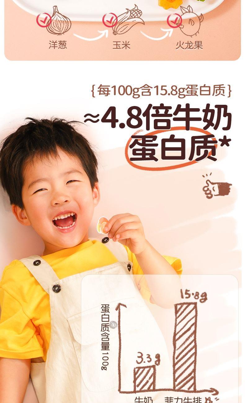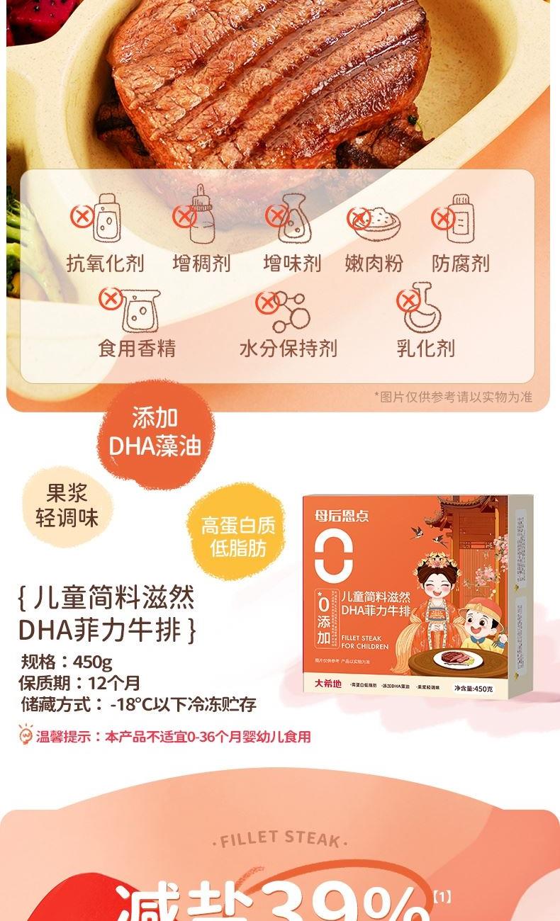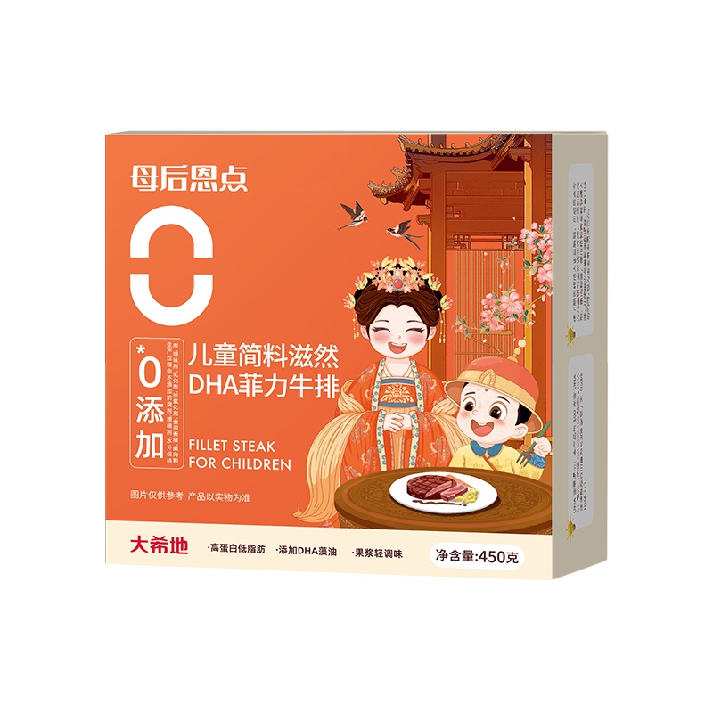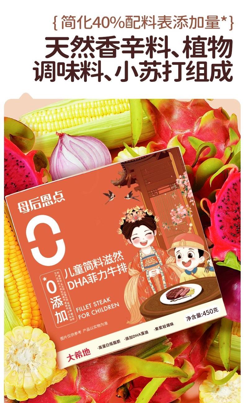 产品参数配置 母后恩点儿童整切菲力:400g / 份,共 2 份 赠品人生黑酱:160g / 份,共 1 份 赠品刀叉:1 副 产品卖点说明 儿童专属菲力,细嫩易嚼:选用整切菲力部位,肉质柔滑细嫩,适配儿童咀嚼能力,无复杂调味,家长更放心。 配套齐全,便捷备餐:含 2 份牛排 + 专属酱料 + 刀叉,无需额外采购,简单煎制即可完成儿童餐,省时省力。