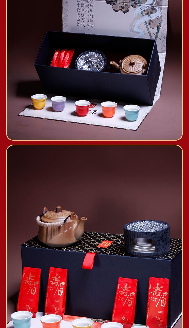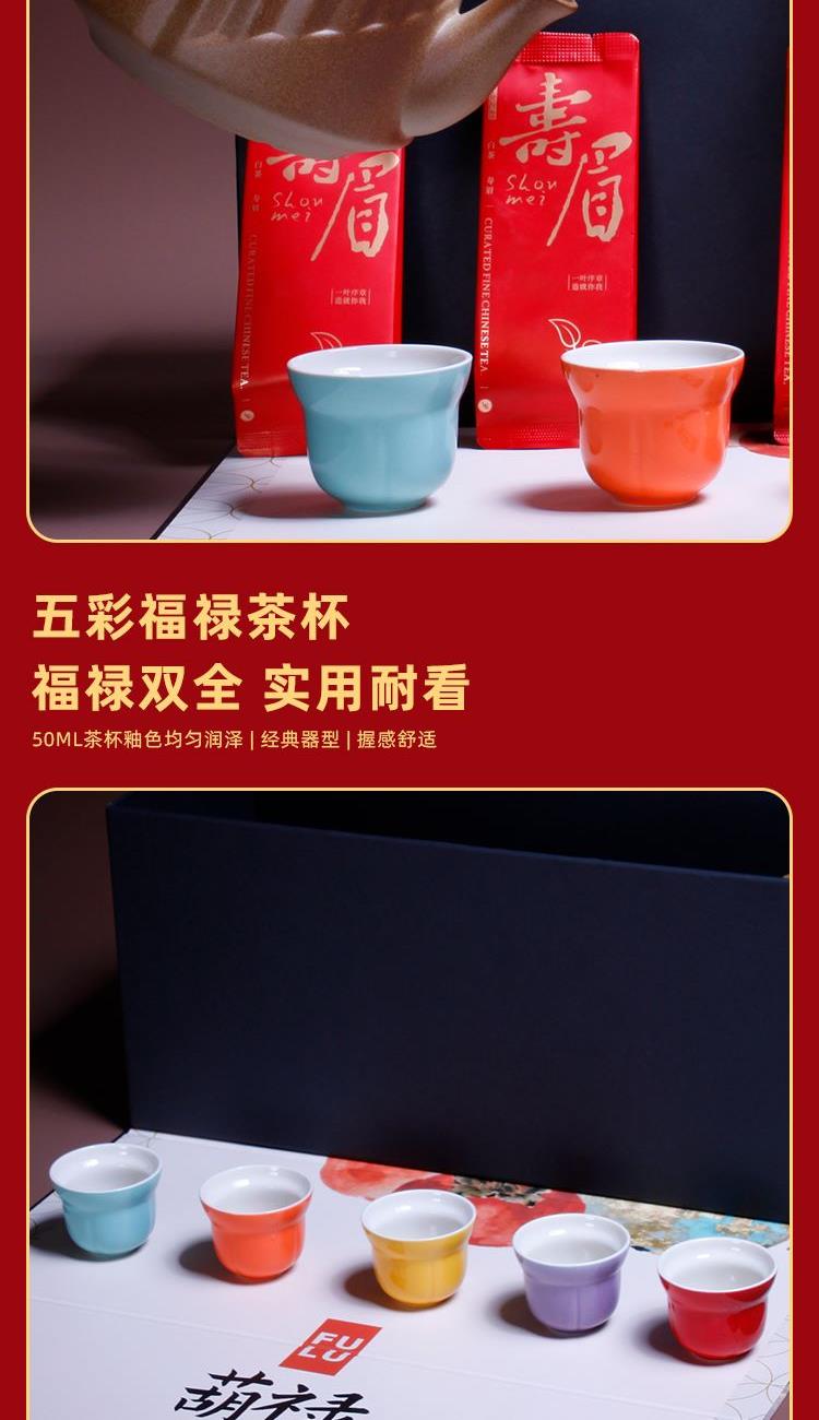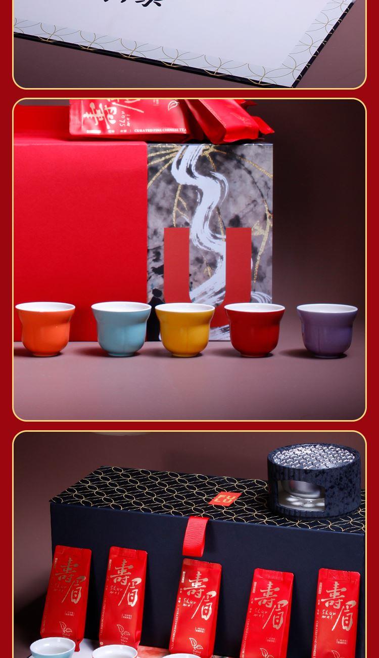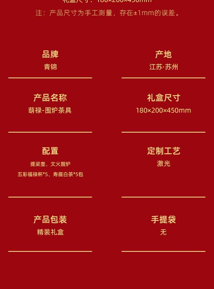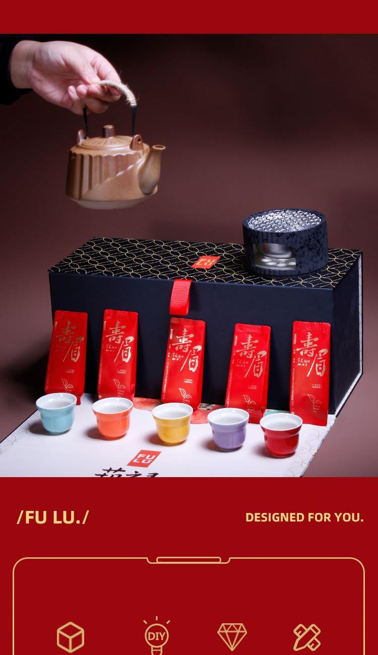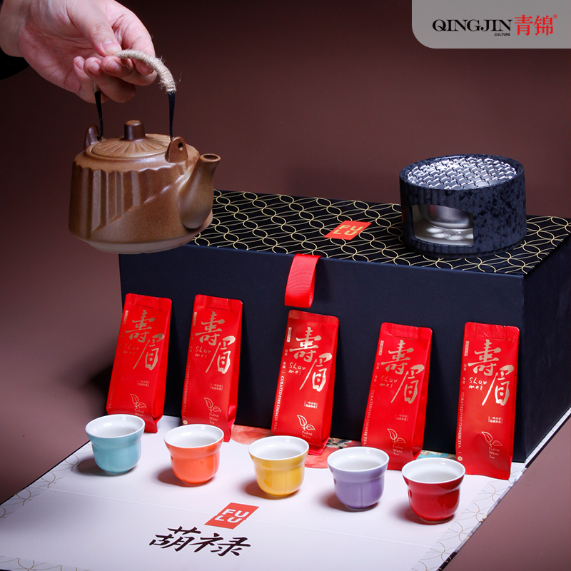 1-文火提梁壶*1 680ml 陶瓷材质 2-文火围炉*1 陶瓷 尺寸:11.5*9.3*6.5cm 3-五彩福禄杯*5 陶瓷 5.8*4.8cm 50ml 4-伯仲之叙寿眉白茶*5包 20克 5-精装实用性礼盒*1 多用途创意挂画礼盒 材质 洒金纸-触感纸 礼盒:18×20×45cm 馈赠重要伙伴彰显不凡品味;敬献至亲长辈,承载孝心与温情。在壶中沸腾,在墙上停驻。首批限量,诚邀品鉴。
