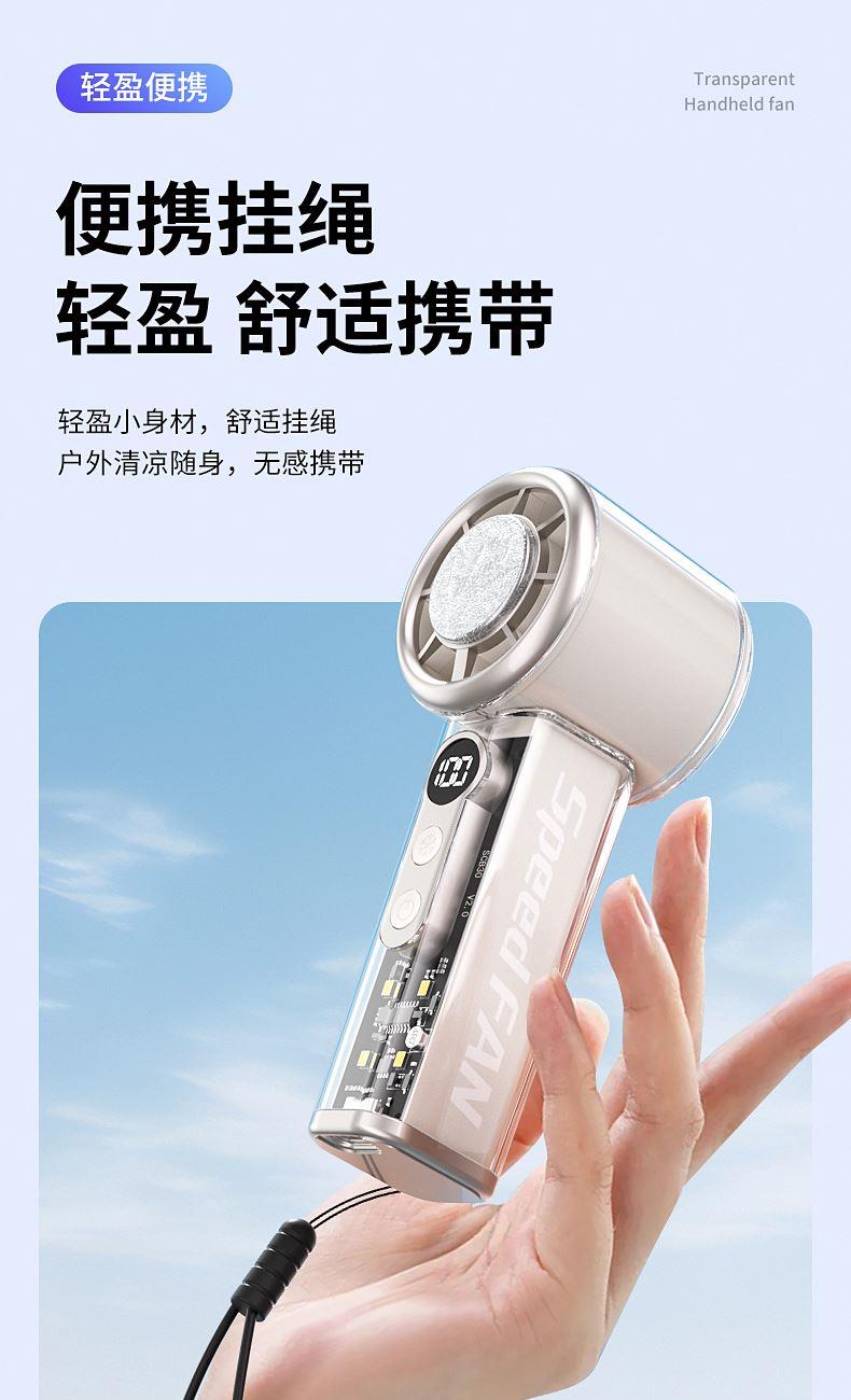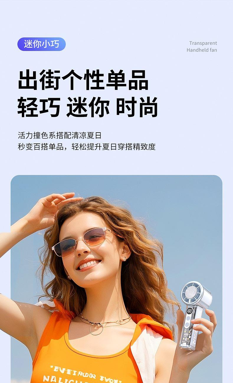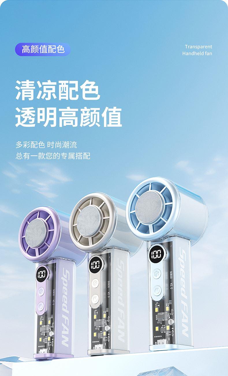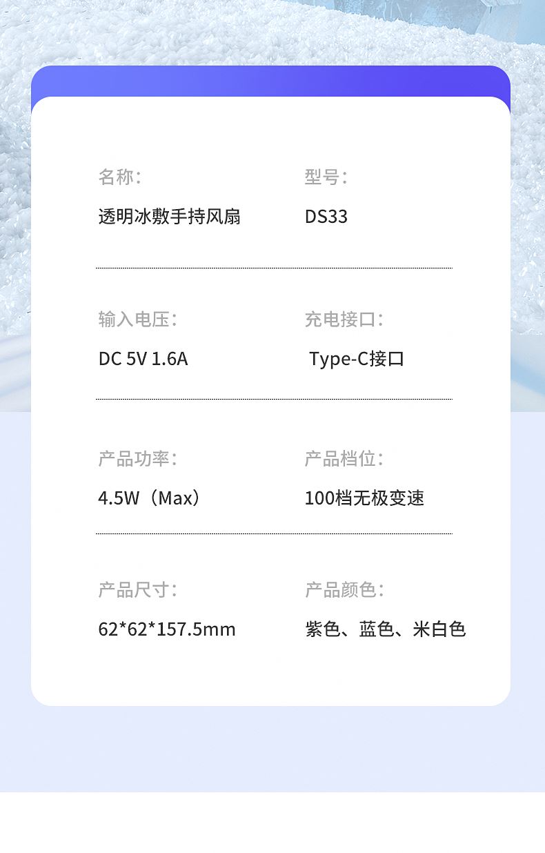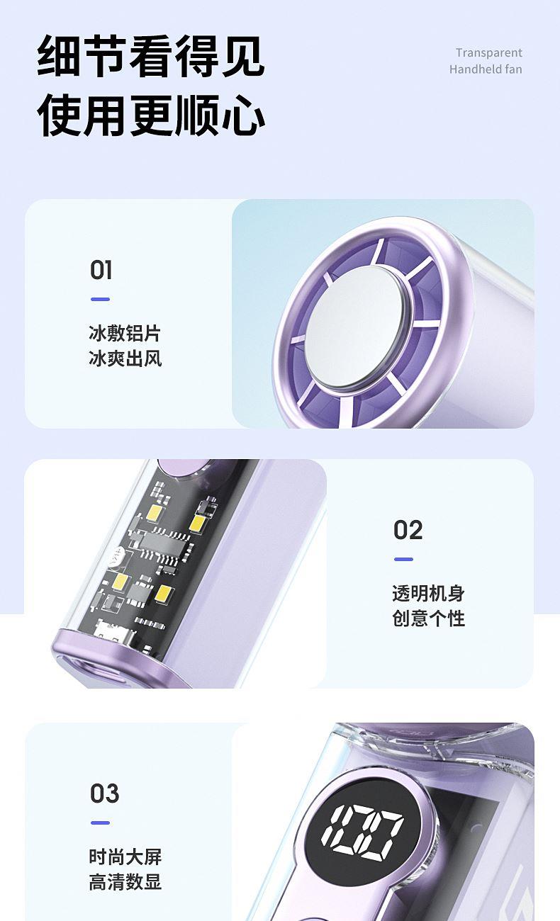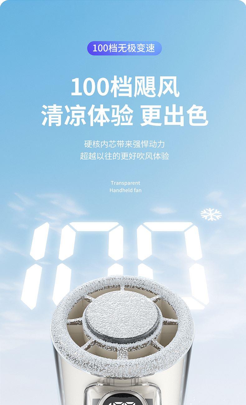 产品材质:ABS 产品功能:100档风力调节 产品容量:3000mAh 产品尺寸:62*62*157.5mm 产品颜色:白色 ,蓝色,紫色 100档调节,风力随心选;智能数显外屏,档位清晰可见;手持桌面一体化。小巧设计,方便携带;LED照明,户外也很实用。