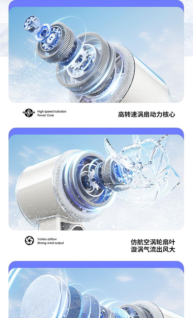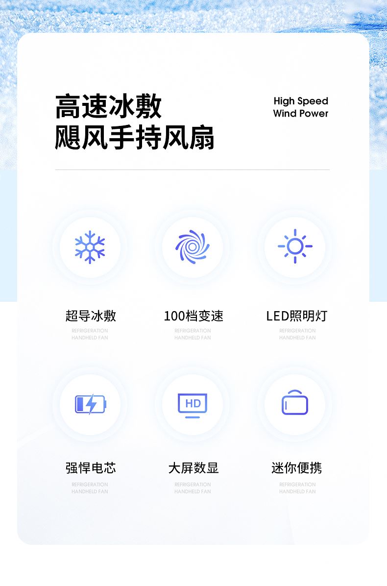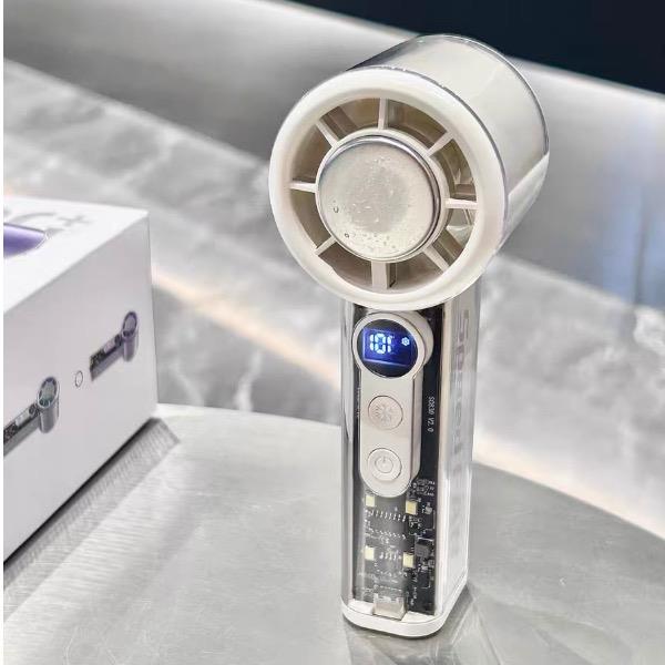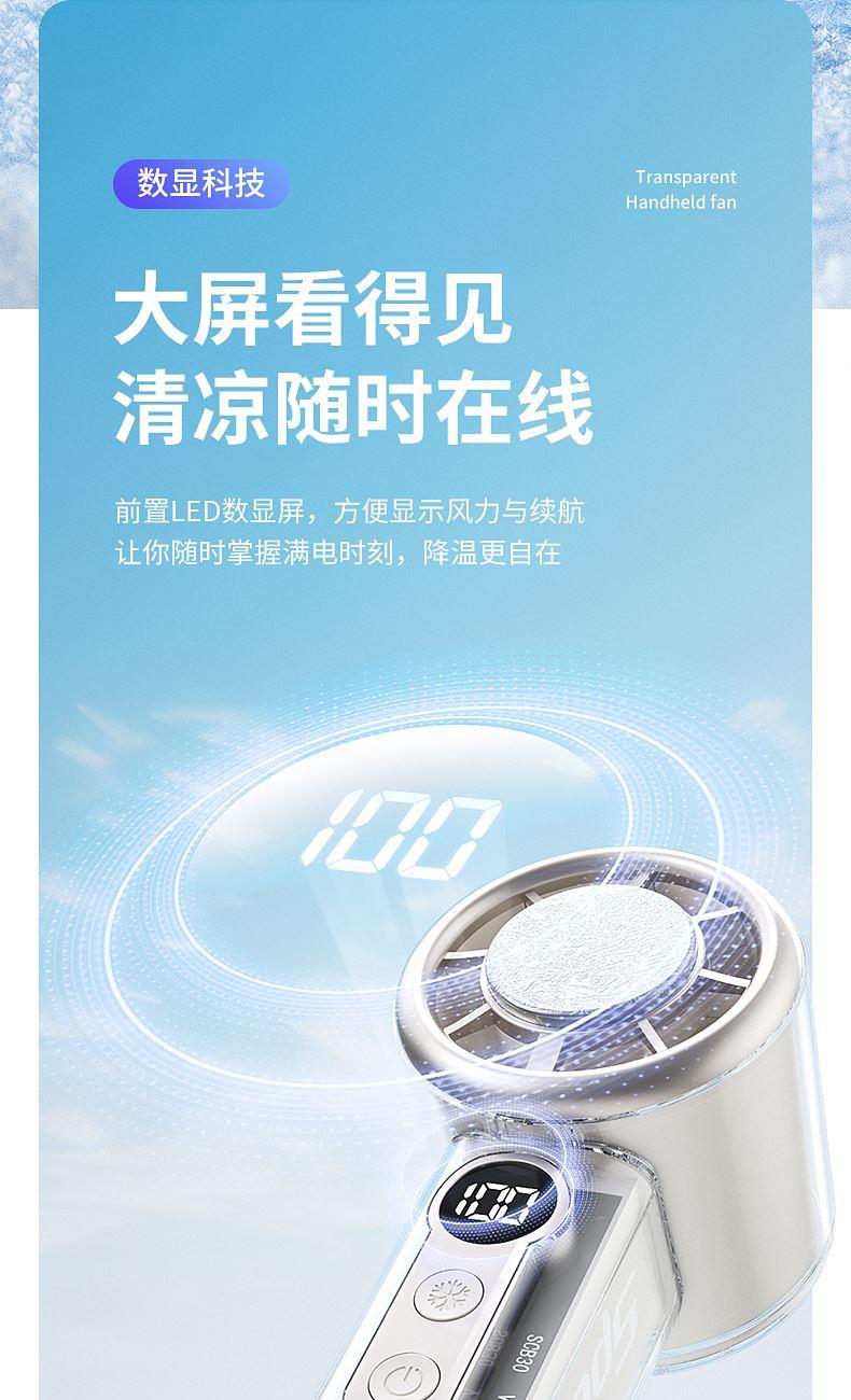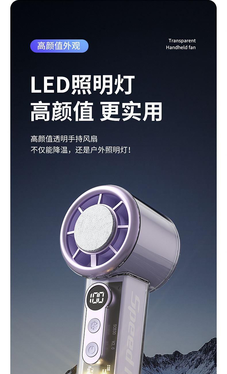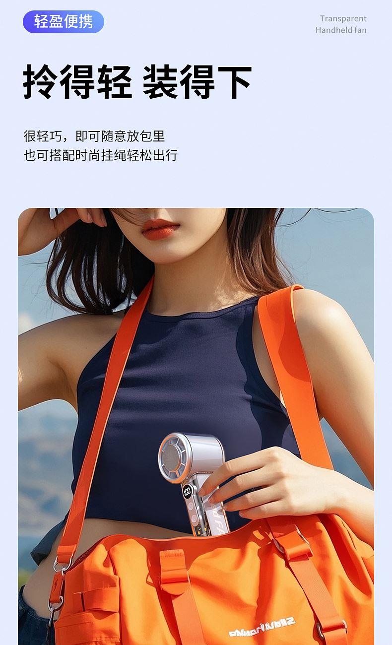 产品材质:ABS 产品功能:100档风力调节 产品容量:3000mAh 产品尺寸:62*62*157.5mm 产品颜色:白色 ,蓝色,紫色 100档调节,风力随心选;智能数显外屏,档位清晰可见;手持桌面一体化。小巧设计,方便携带;LED照明,户外也很实用。