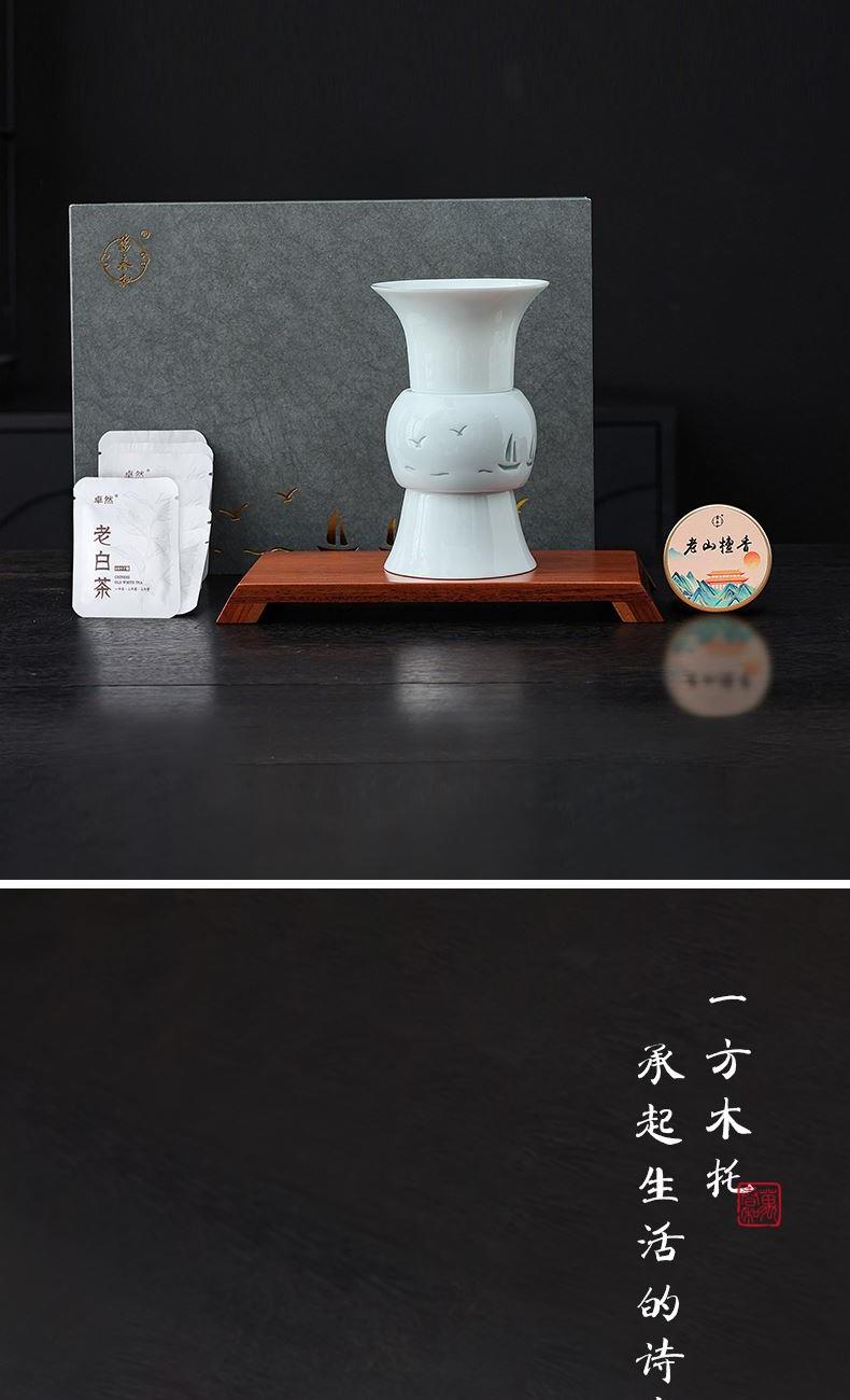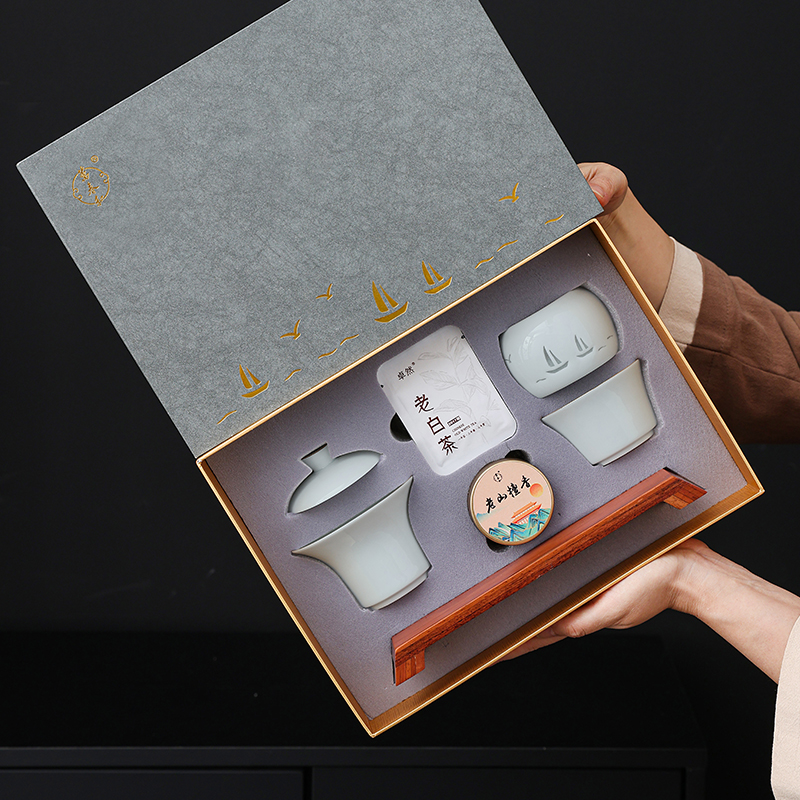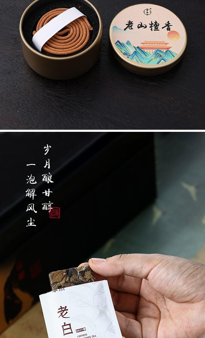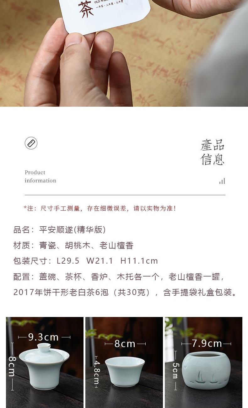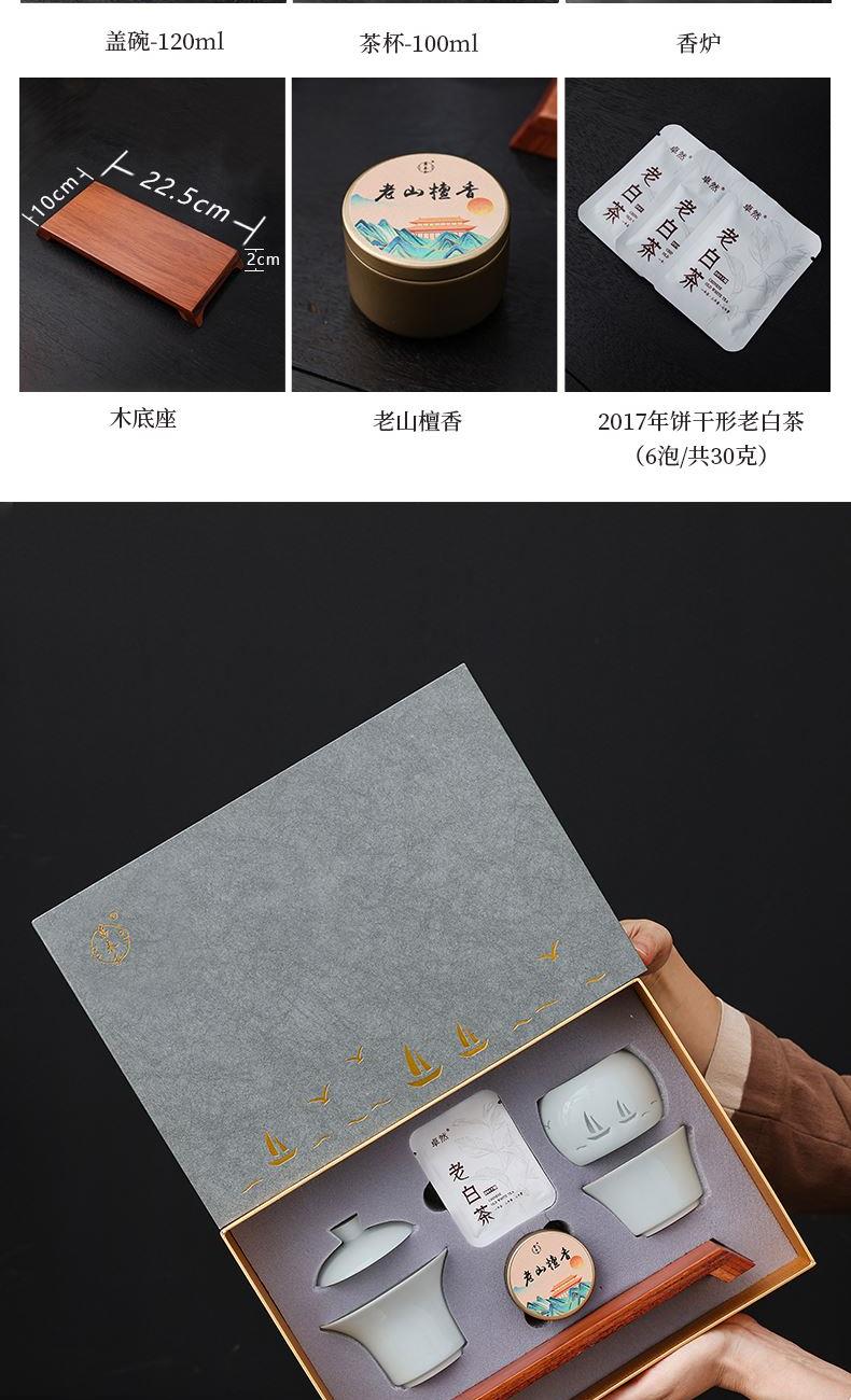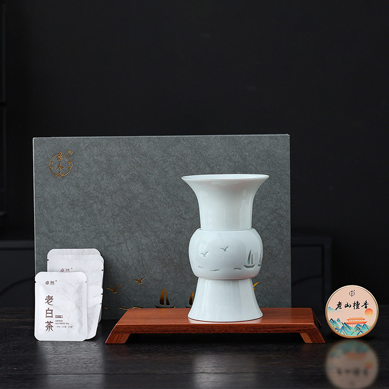 材 质:青瓷、胡桃木、老山檀香 容 量:盖碗120ml、茶杯100ml 包装尺寸:L29.5  W21.1  H11.1cm 配 置:盖碗、茶杯、香炉、木托各一个,老山檀香一罐,2017年饼干形老白茶6泡(共30克),含手提袋礼盒包装。 1.以东方经典花觚为灵感,巧妙的融合盖碗、茶杯、香炉于一体,一器满足品茶与焚香的雅致需求,仪式感拉满。 2.花瓶寓平安,香炉刻帆船海鸥,象征顺遂吉祥,让美好祝愿伴日常茶事。 3.配 2017 年饼干老白茶与老山檀香,品醇厚茶汤、闻袅袅清香,开启视觉、嗅觉、味觉于一体的沉浸式体验。 4.从花觚造型的创意设计,到茶、香、木托的配套,尽显东方美学,不止是器物,更是案头一方美学小景。