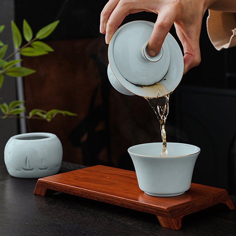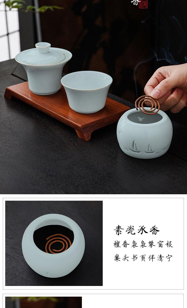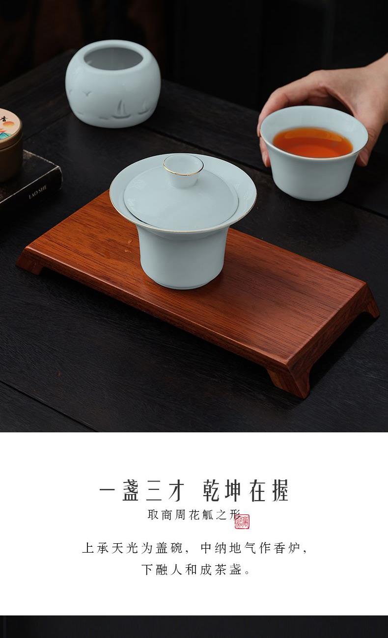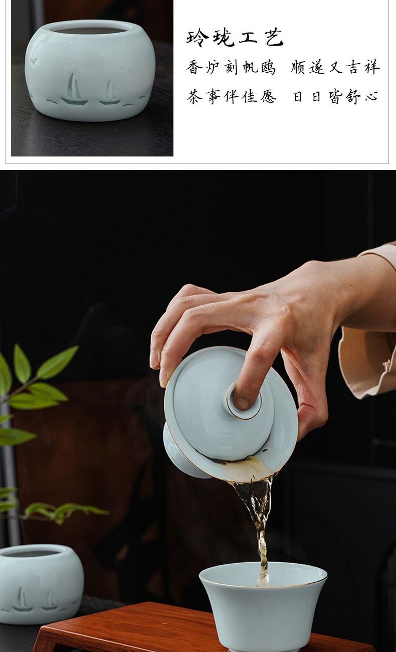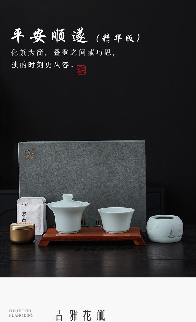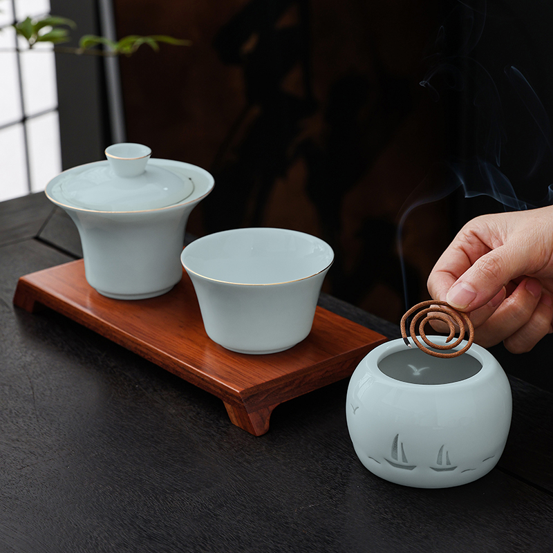材 质:青瓷、胡桃木、老山檀香 容 量:盖碗120ml、茶杯100ml 包装尺寸:L29.5  W21.1  H11.1cm 配 置:盖碗、茶杯、香炉、木托各一个,老山檀香一罐,2017年饼干形老白茶6泡(共30克),含手提袋礼盒包装。 1.以东方经典花觚为灵感,巧妙的融合盖碗、茶杯、香炉于一体,一器满足品茶与焚香的雅致需求,仪式感拉满。 2.花瓶寓平安,香炉刻帆船海鸥,象征顺遂吉祥,让美好祝愿伴日常茶事。 3.配 2017 年饼干老白茶与老山檀香,品醇厚茶汤、闻袅袅清香,开启视觉、嗅觉、味觉于一体的沉浸式体验。 4.从花觚造型的创意设计,到茶、香、木托的配套,尽显东方美学,不止是器物,更是案头一方美学小景。