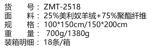 货 号 :ZMT-2518 面 料 :25%美利奴羊绒+75%聚酯纤维 规 格 :150*200cm 重 量 :1380g 装 箱明细 :18条/箱 1、澳洲美利奴羊绒,材质柔软亲肤不起球;双层毯复合,保暖不臃肿,随 时随地尽显优雅 2、简约轻奢花型,三角针锁边,凸显匠心工艺 3、多场景使用,居家 办公室,车内都可以使用 。 4、烫金精致包装,自用送礼皆可 。