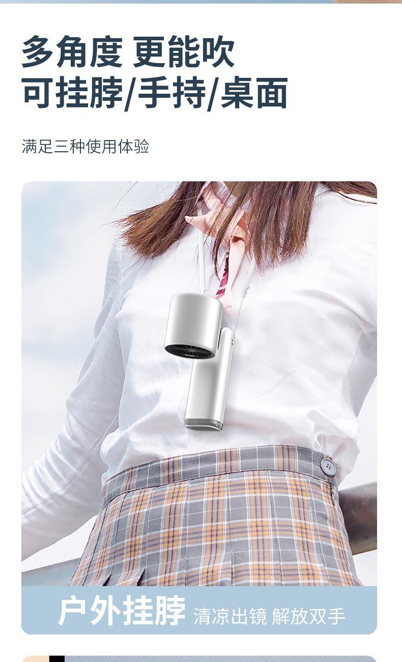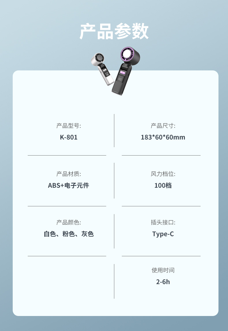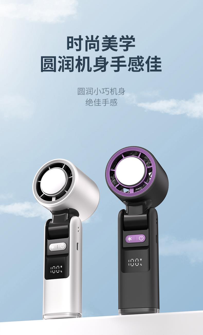 产品功能: *高速降温、强劲风力、大屏数显 *4000mAh、小巧便携、可折叠、可挂脖 * 支持小批量定制LOGO 产品参数: *材质:ABS/电子元件 *产品尺寸:183*60*60MM *产品重量:224g/315g *包装盒:186*63*63mm *外箱尺寸:402*334*390MM *整箱重量:20KG *颜色:黑色、白色、粉色 *标配:主机*1、数据线*1、说明书*1