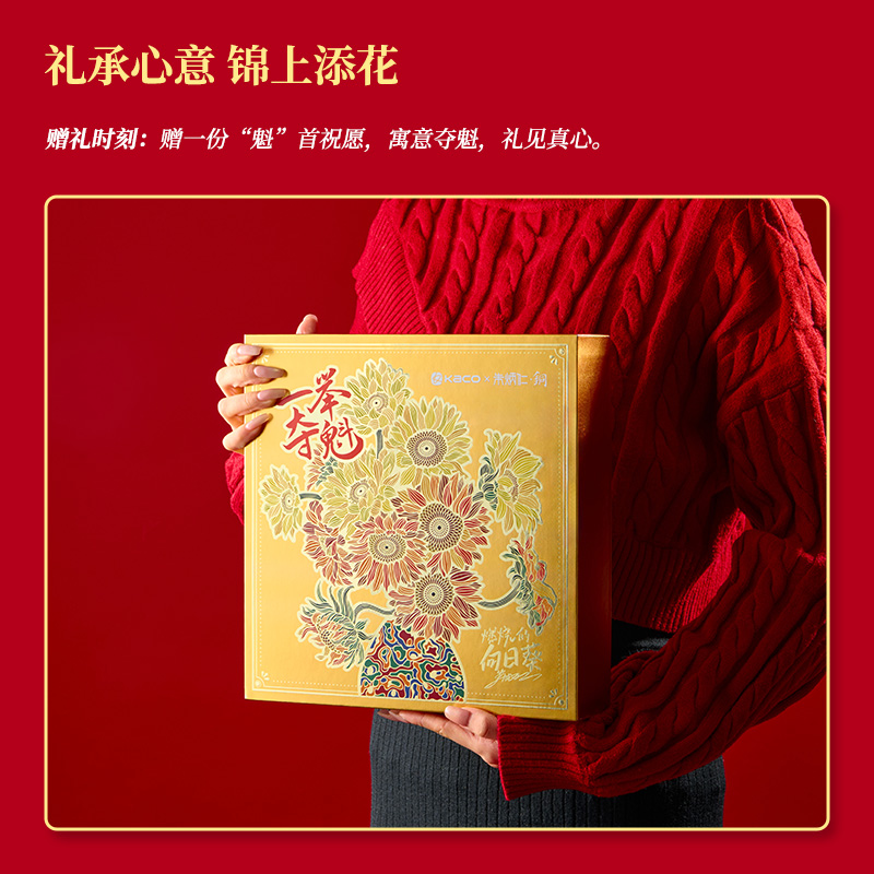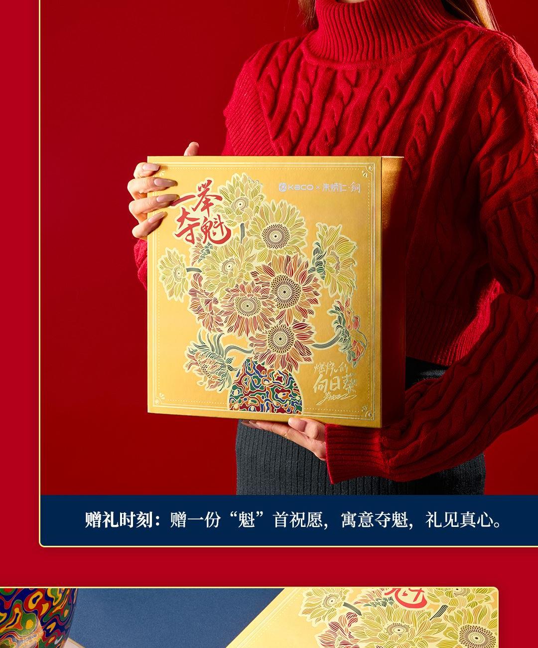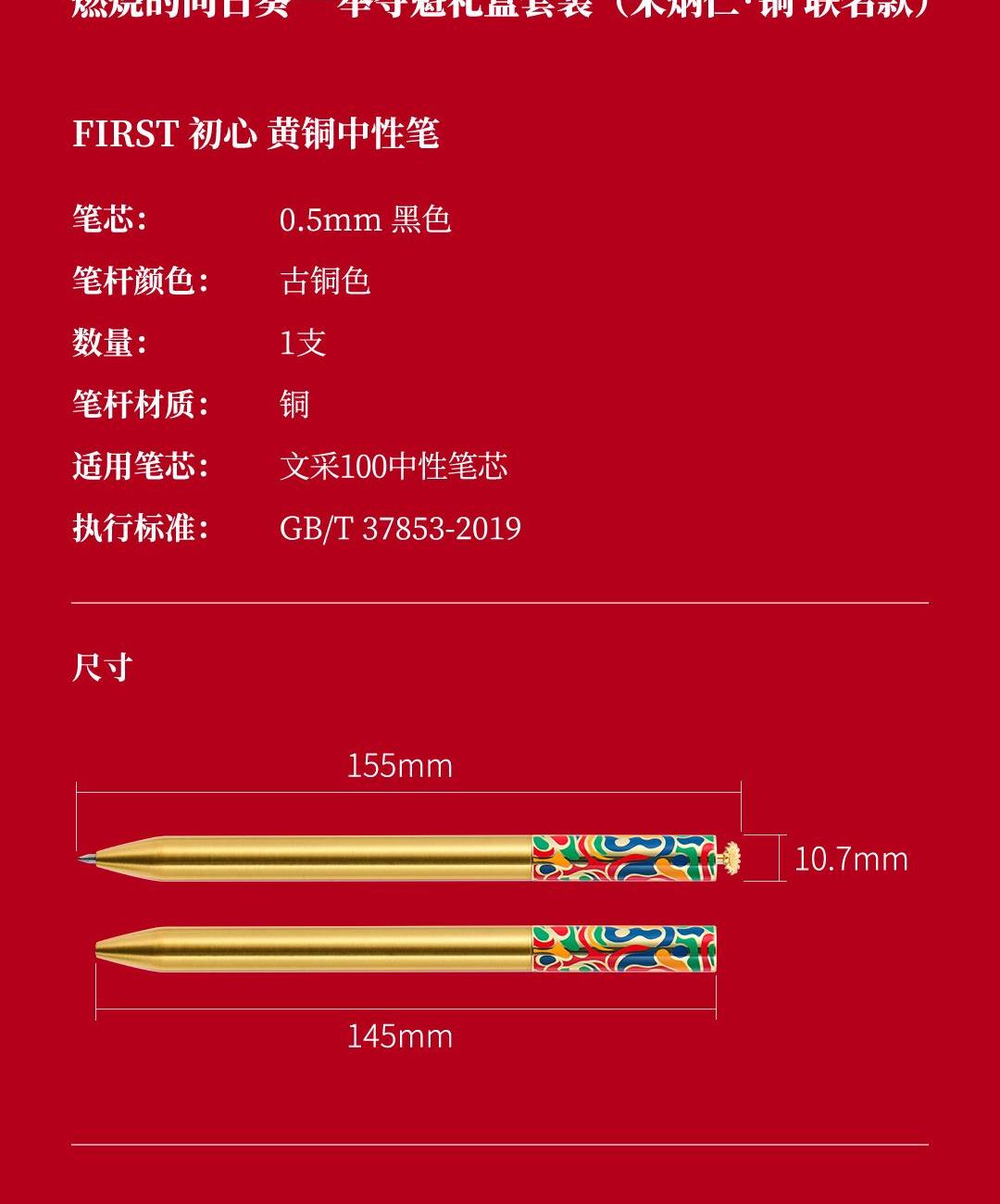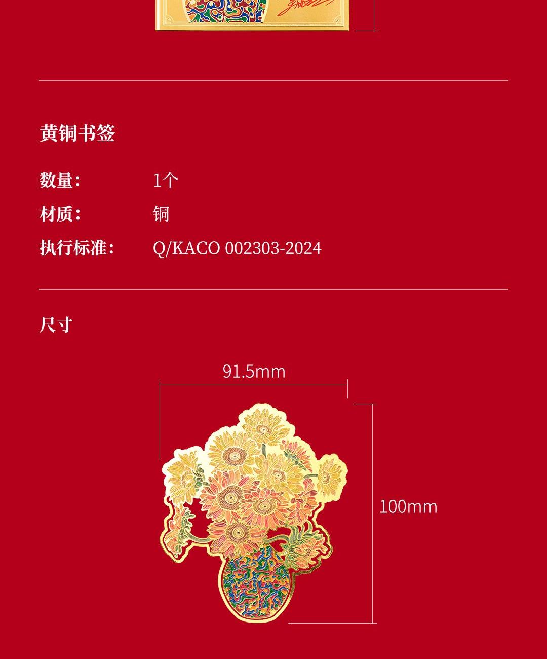 尺 寸:单套(含手提袋,约860g) 材 质:铜(笔杆、书签、出芯向日葵),纸卡·(笔记本封面),80g道林纸(内页) 外观颜色:金色 1、将《燃烧的向日葵》的艺术精髓与视觉意象,融入书写艺术。 2、内置礼盒,外附雅袋,节日送礼、商务馈赠的精致之选。 金葵书签*1,纯铜镂刻,勾勒向阳姿态。 3、FIRST 初心 签字笔*1,寓意金葵盛放 向阳而生而生。 4、配套笔记本*1,封面复刻熔铜肌理,烫金葵花璀璨。 包装方式:礼盒配一个手提袋