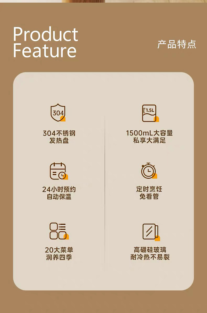 1.20大菜单:20大智能菜单,一键即享,花样润养。 2.畅饮容量:1.5L 畅饮容量,多人享皆满足。 3.炖煮可视:高硼硅玻璃,炖煮过程可视,无惧骤冷骤热。 4.火力全开:800W大功率,聚能加热快,24H智能预约,炖煮不久等。
