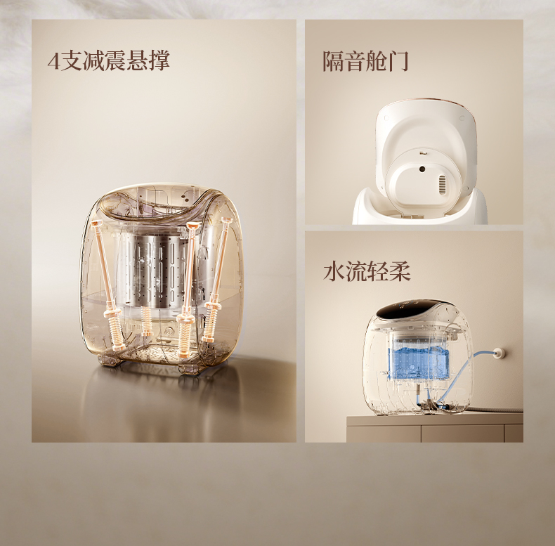 主要材质:ABS+PP+304 电压:220V 功率:洗涤40W+脱水30W+加热600W 容量:7L 颜色:里米尼白 自动进水、排水、脱水,洗脱一体机 水位自感知,防缠绕流线型波轮、360度水流洗 可中途添衣,随添随洗,一键续洗 双盖设计,升级无刷电机,有效减少噪音 360度水流洗,去渍无死角那 高温加热洗,加强污渍清洗 开盖报警,盖上盖子可续洗 内有4条减震吊杆稳固支撑保障甩干的同时无异响、不晃动、不移位
