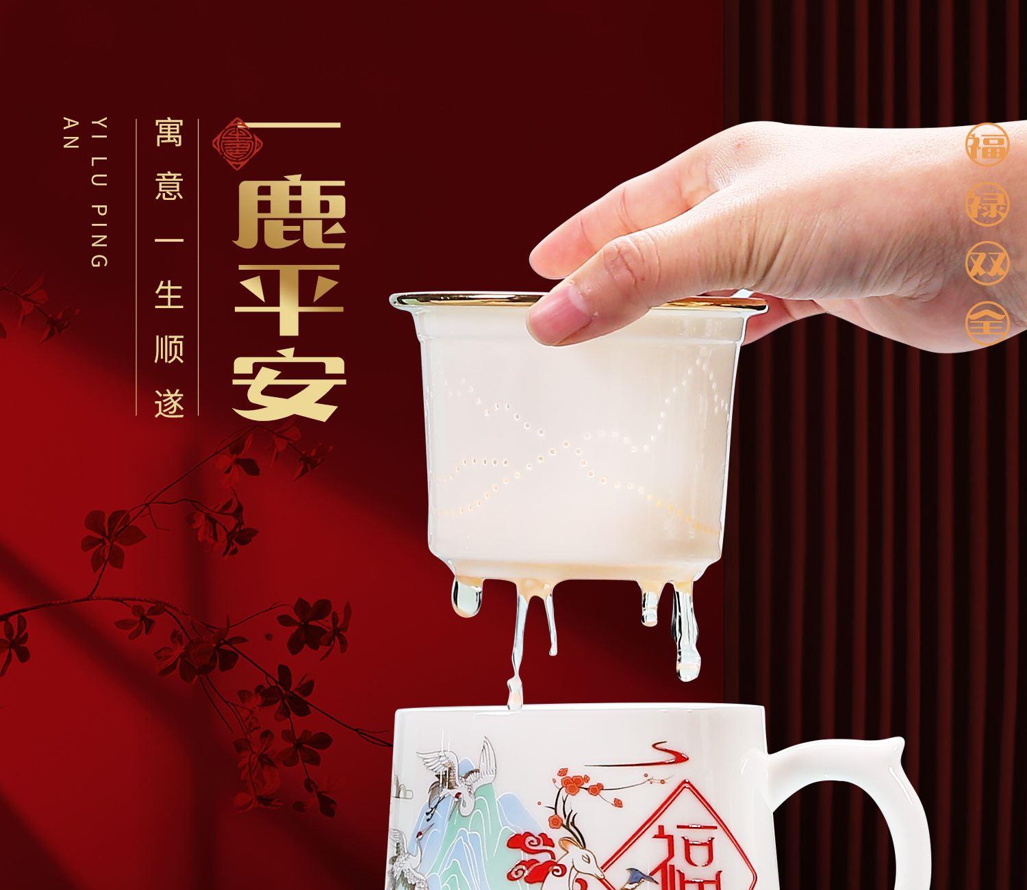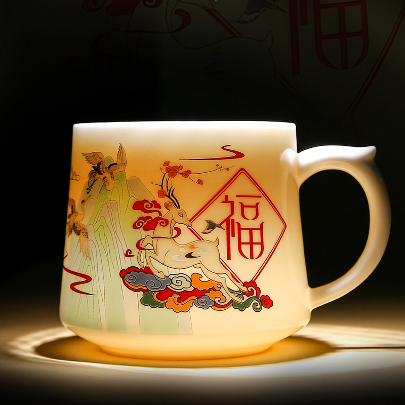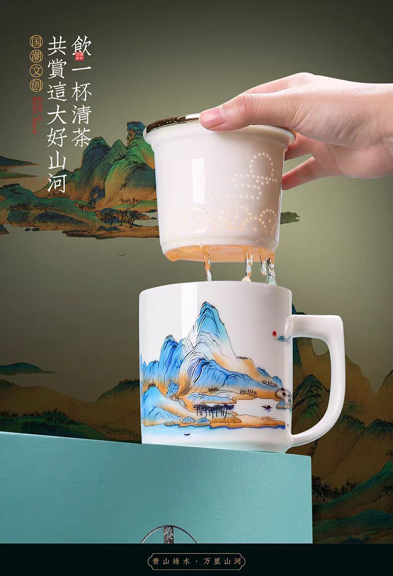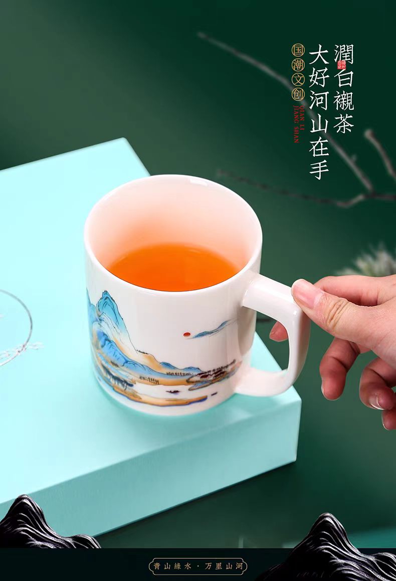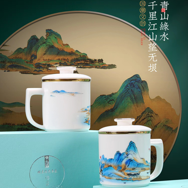 鹏翼羊脂玉瓷福禄同行、千里江山办公杯