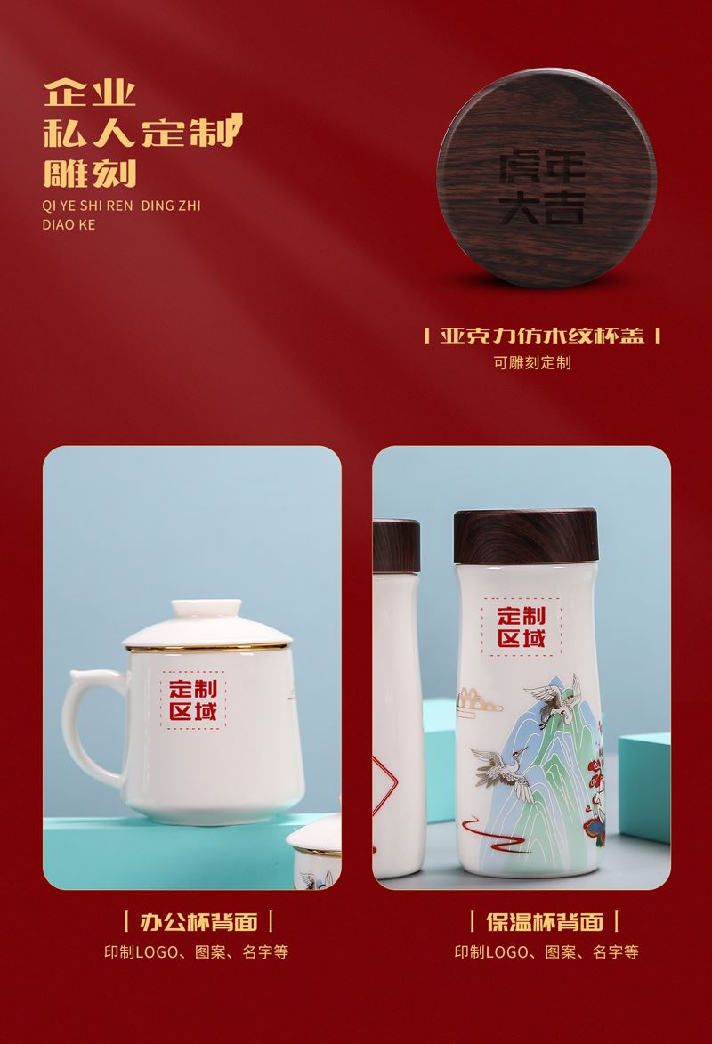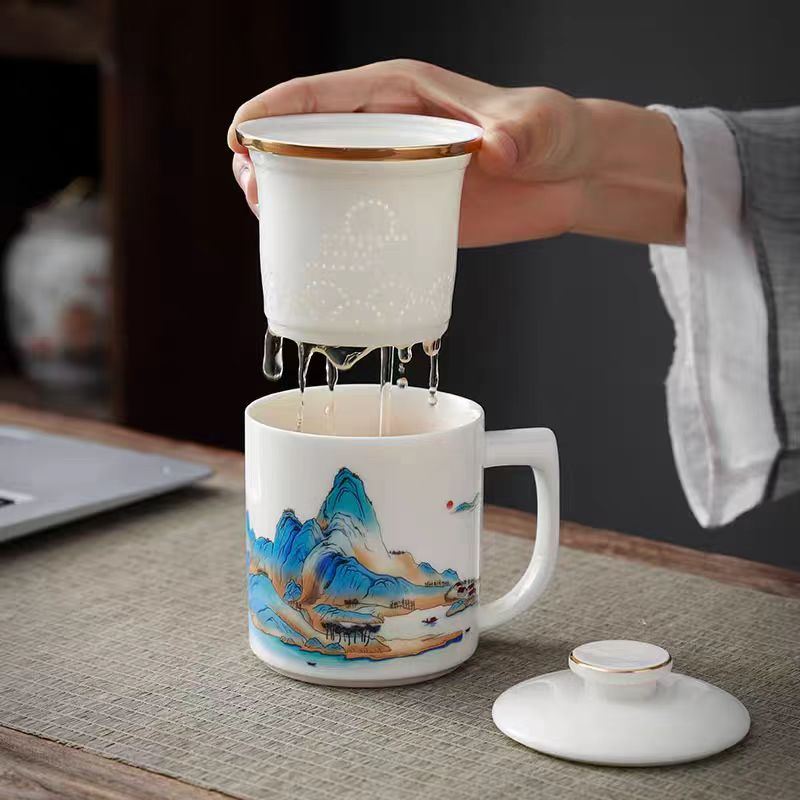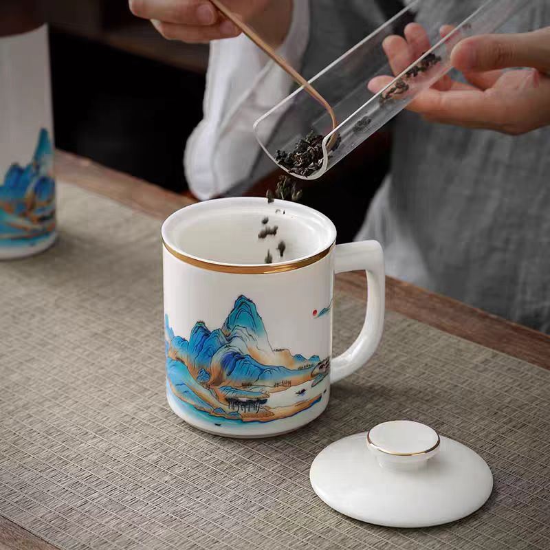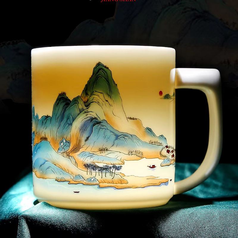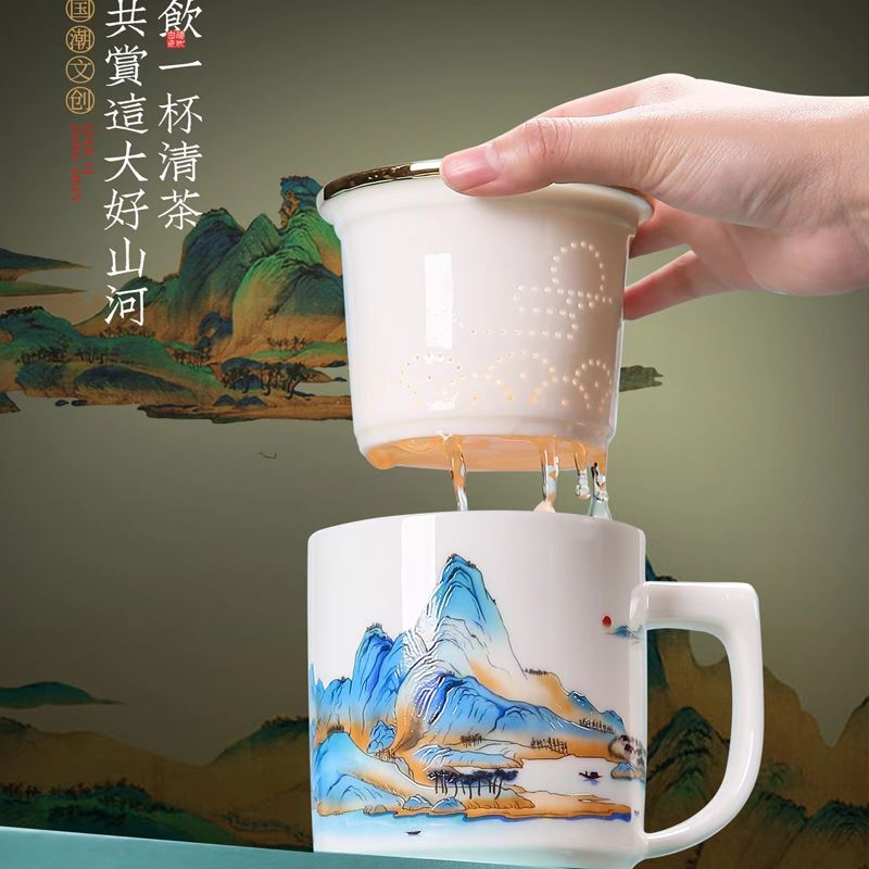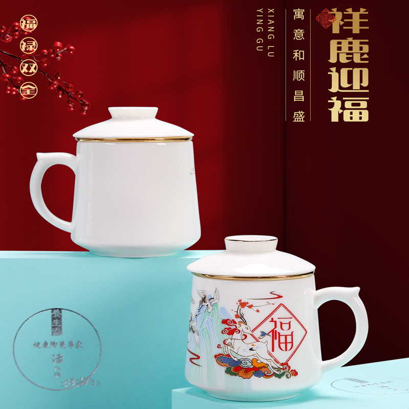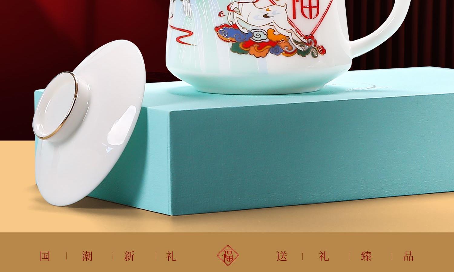 鹏翼羊脂玉瓷福禄同行、千里江山办公杯