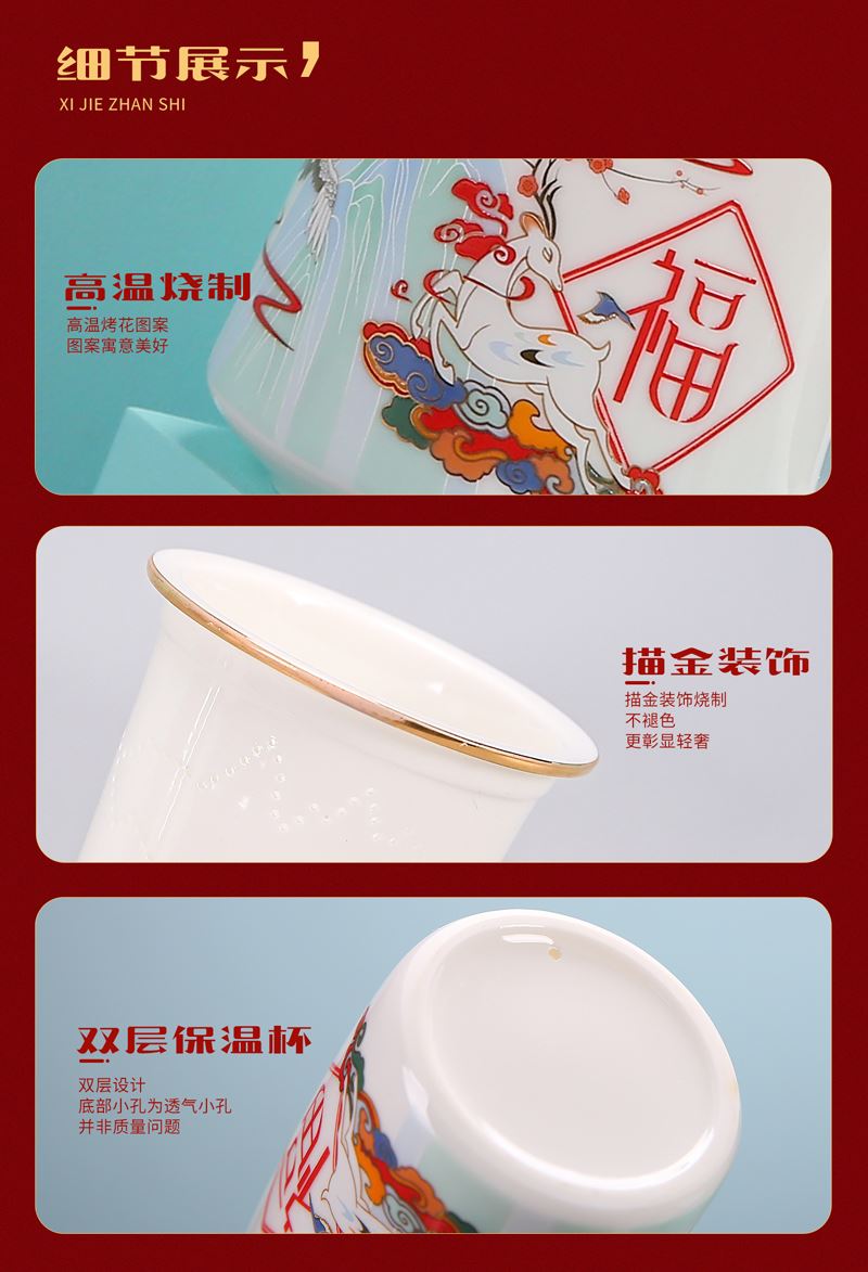 配 制: 1杯 1盖 1茶漏 1礼盒手提袋 规格:高办公杯:14.5*11.5cm 材质:羊脂玉瓷 描24K真金 珐琅彩立体花面 推荐说明:羊脂玉瓷,精选优质高价瓷土 ,瓷质细腻润滑,似凝脂,如美玉。在阳光照射下,呈半透明羊油状,洁白滋润,故称羊脂玉,乃瓷中佳品。做工精细,一丝不苟,儒雅内敛,浑身散发着出凡托俗的高贵气质。