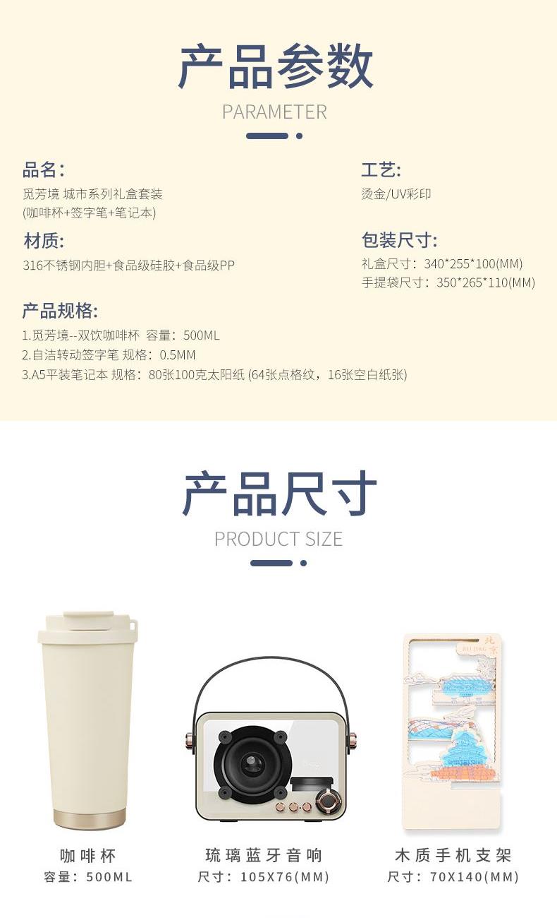 1.觅芳境--双饮咖啡杯 容量:500ml 内胆:316 外壳:304 杯盖:食品级PP 吸管:食品级硅胶 吸嘴:食品级PP 密封圈:食品级硅胶 2.自洁转动签字笔 规格:0.5mm 3.A5平装笔记本 规格:80张100克太阳纸 (64张点格纹,16张空白纸张) 礼盒尺寸:340*255*100(MM) 手提袋尺寸:350*265*110(MM)