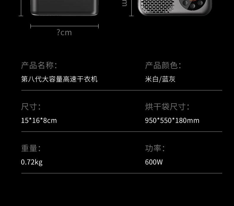 1.内置烘衣袋,即开即用无需安装 2.立体循环热风,360º急速烘干 3.容量提升,一次可烘7件左右 4.5小时超长定时,满足不同烘衣需求 5.LED数码显示 6.炫彩灯光 7.ECO节能模式,低功耗低噪音 8.内置NTC环境温度检测功能,当环境温度过高时机器自动转到ECO模式,功率降低 9.体积小巧,便于携带 产品尺寸: 150×163×80(mm) 产品净重: 724.5g 功率:600W 产品颜色:浅咖色、星空灰 电源线长度:2m