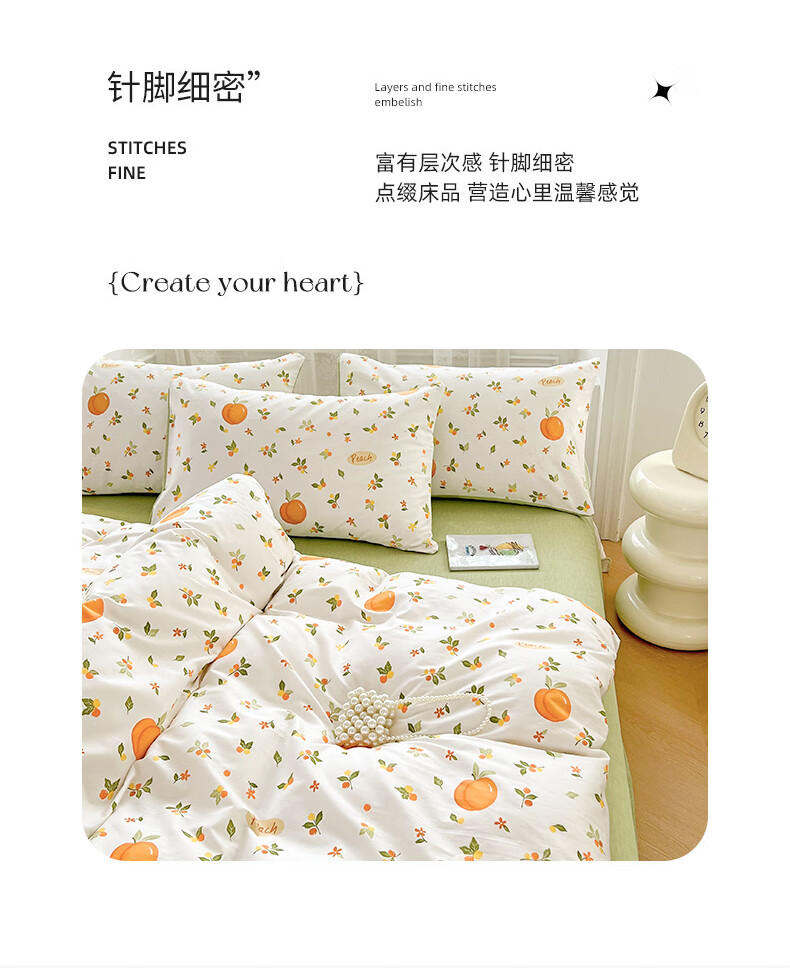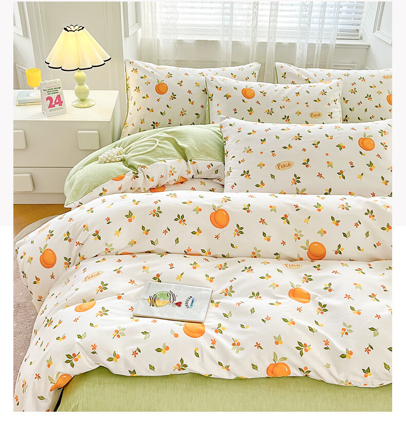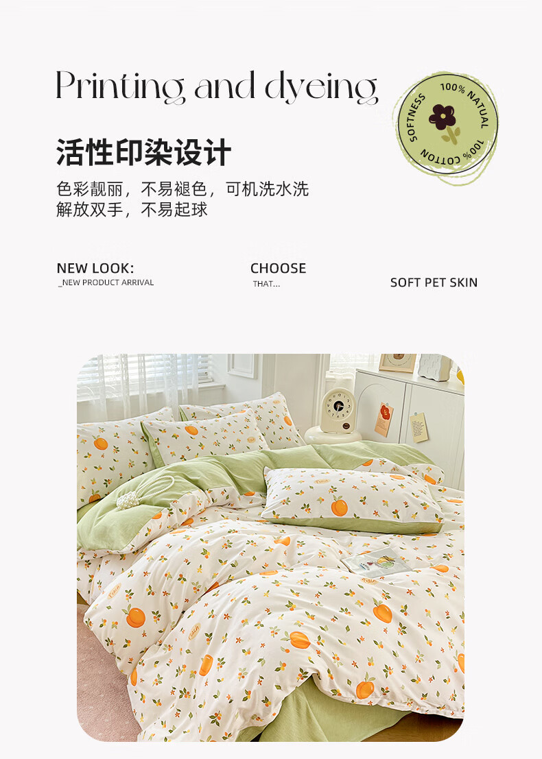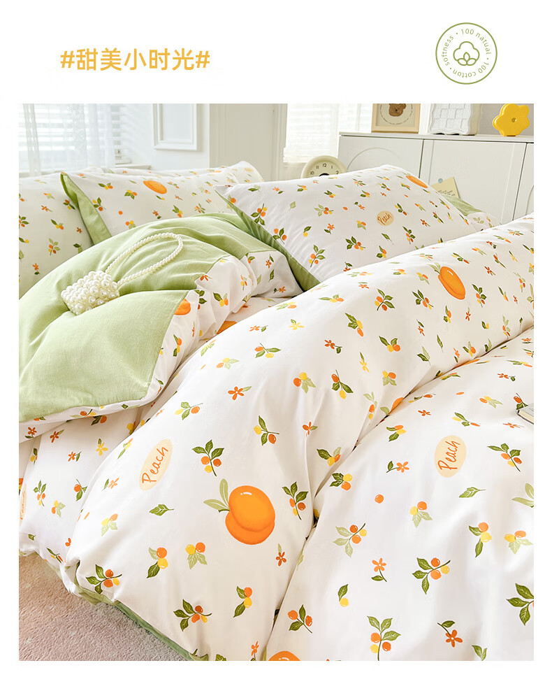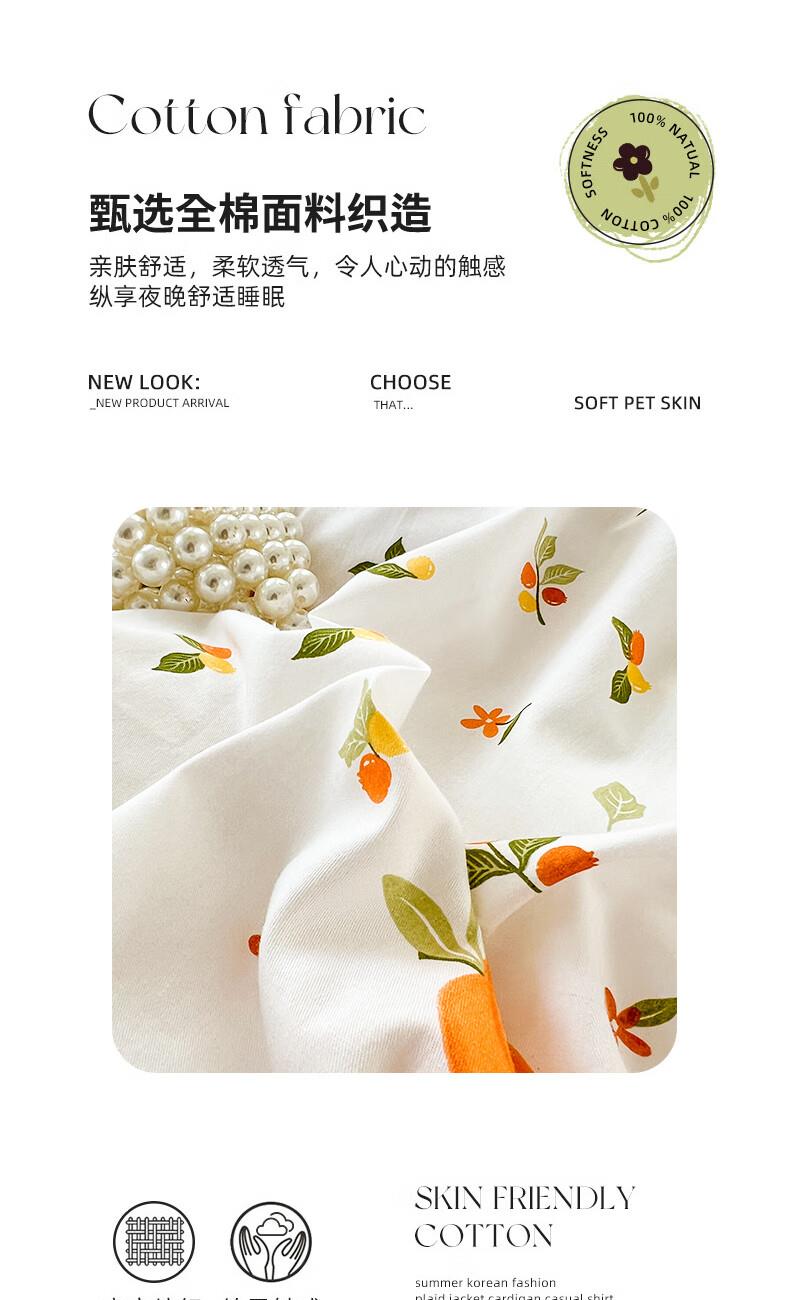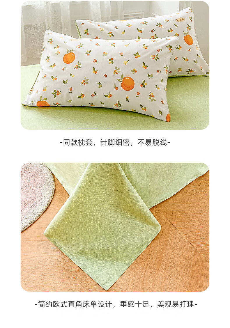 品 名:橘子 规 格:1.5米/1.8米床通用 被 套:200*230cm 床 单:230*230cm 枕 套:48*74cm*2 克 重:1.86kg 面 料:棉 40S