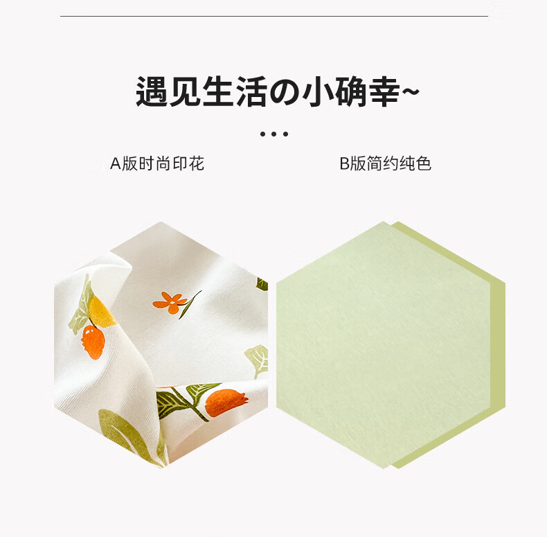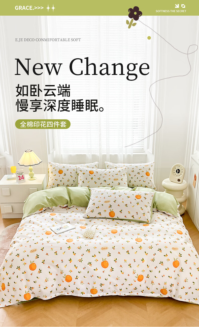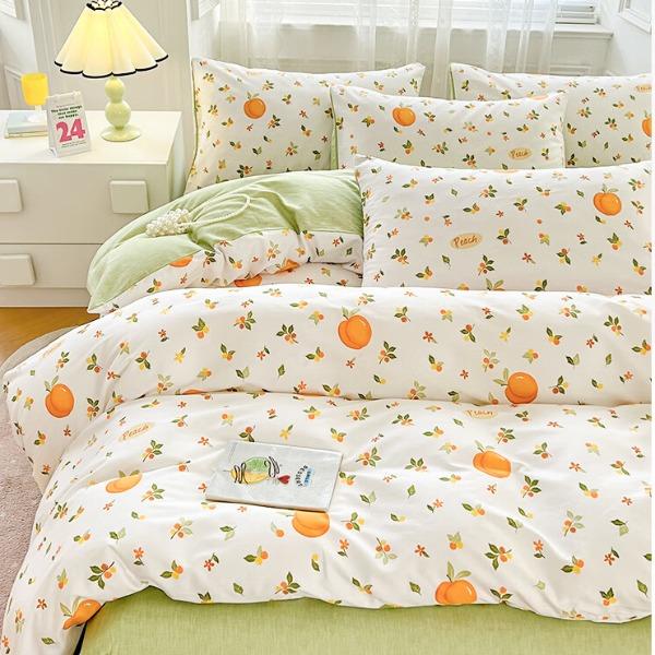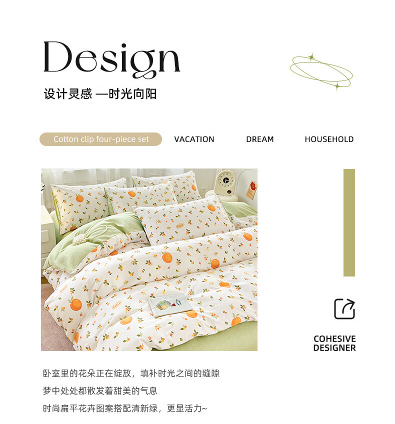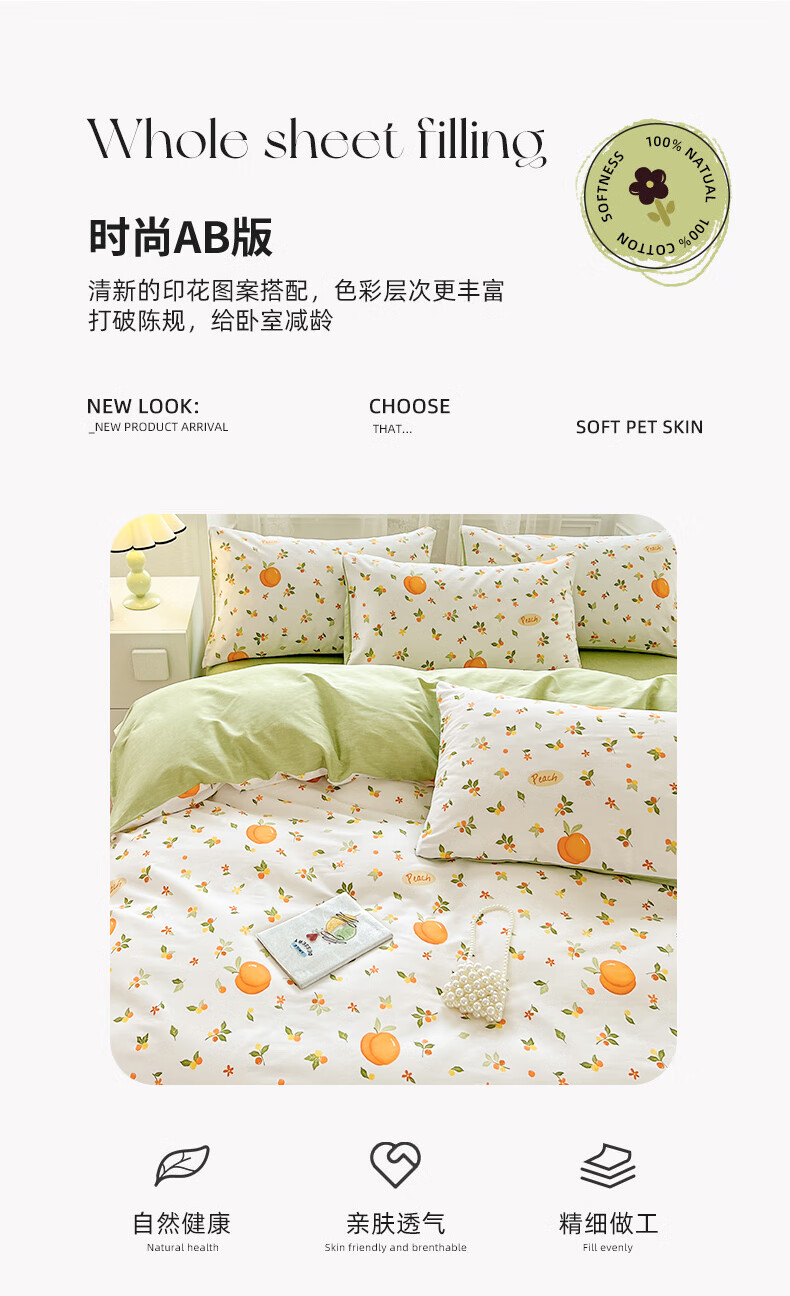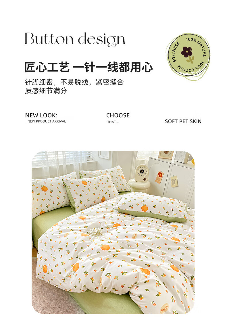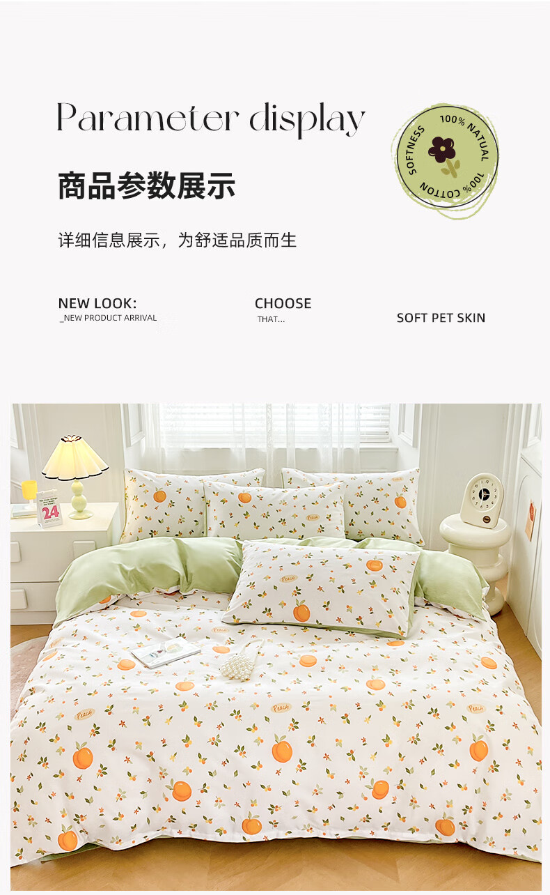 品 名:橘子 规 格:1.5米/1.8米床通用 被 套:200*230cm 床 单:230*230cm 枕 套:48*74cm*2 克 重:1.86kg 面 料:棉 40S