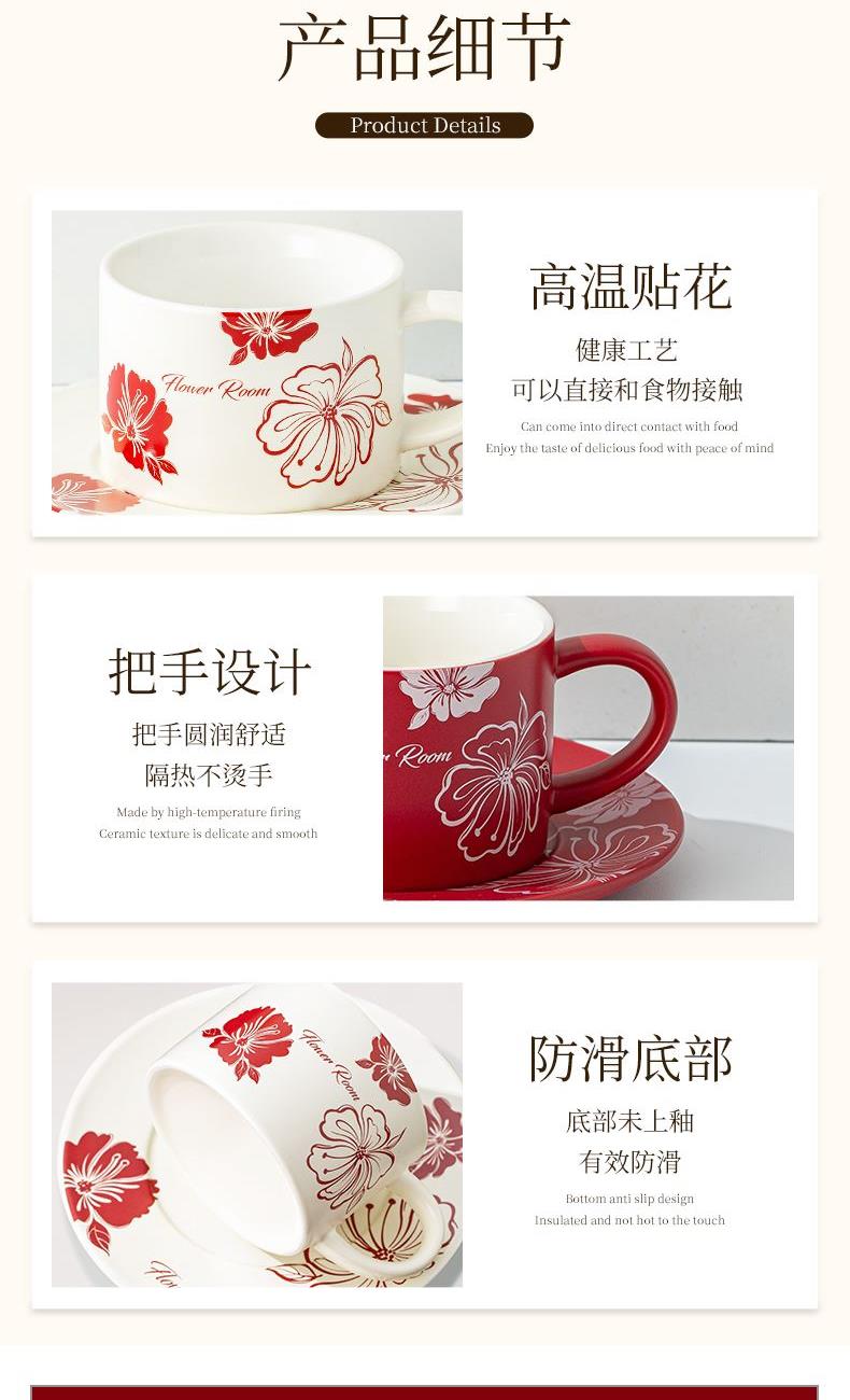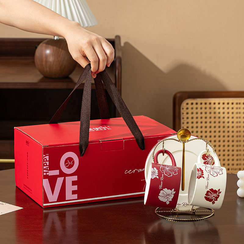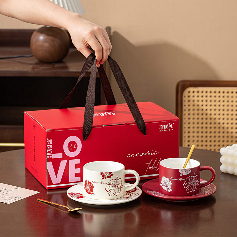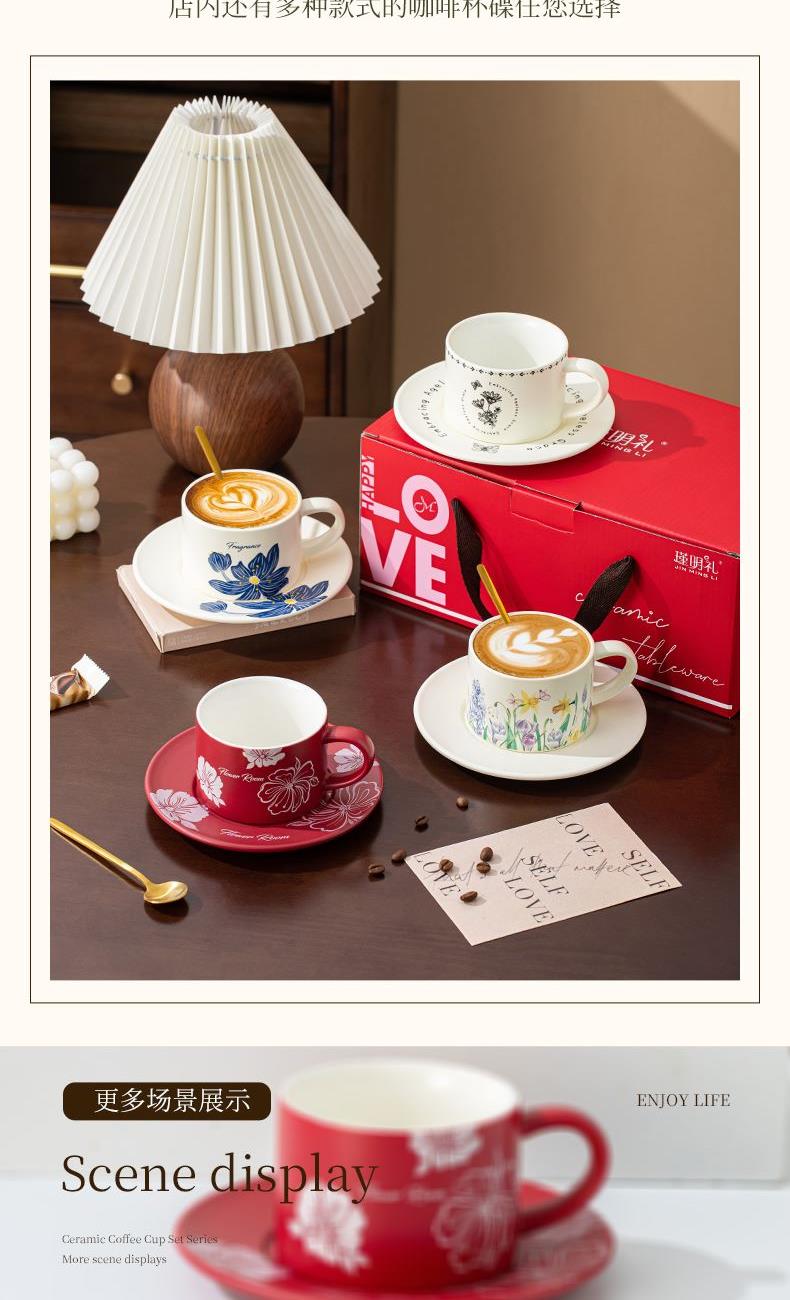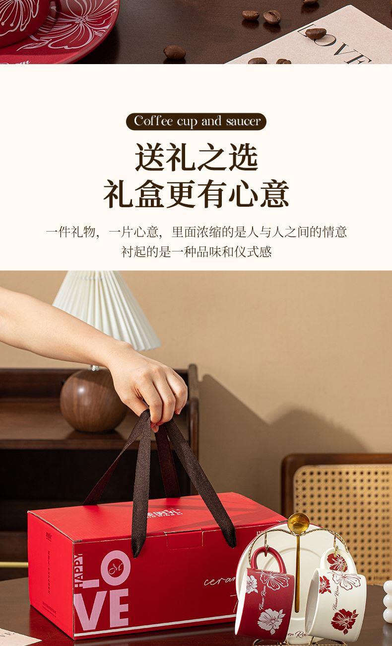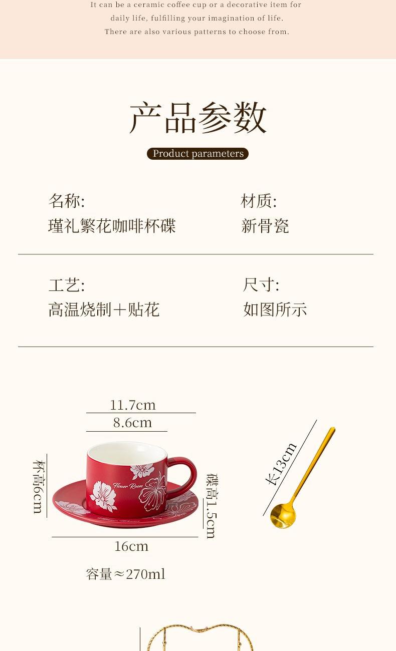 瑾礼繁花-咖啡杯碟-2杯2碟2勺1铁架 - 产品组成:整套=2杯2碟2勺1铁架+彩盒 产品材质:新骨瓷 容量:270ml 产品规格:杯=口径8.6cm,高度=6cm;碟=长度16cm,金勺=长13cm;铁架=口径11.8cm,高度=15.5cm, 彩盒尺寸:30.5*18.5*13cm 产品毛重:1.3kg 整箱毛重:28.3kg 外箱尺寸:63*39*68cm - 花朵和植物图案的咖啡杯碟通常具有很好的搭配性,可以与其他风格的餐具一起使用,形成统一而和谐的餐桌布置,消费者在使用花朵和植物图案的咖啡杯碟时,往往会因为其美观而拍照打卡,并分享到社交媒体上。这种分享行为能够为产品带来更多的曝光和口碑传播。