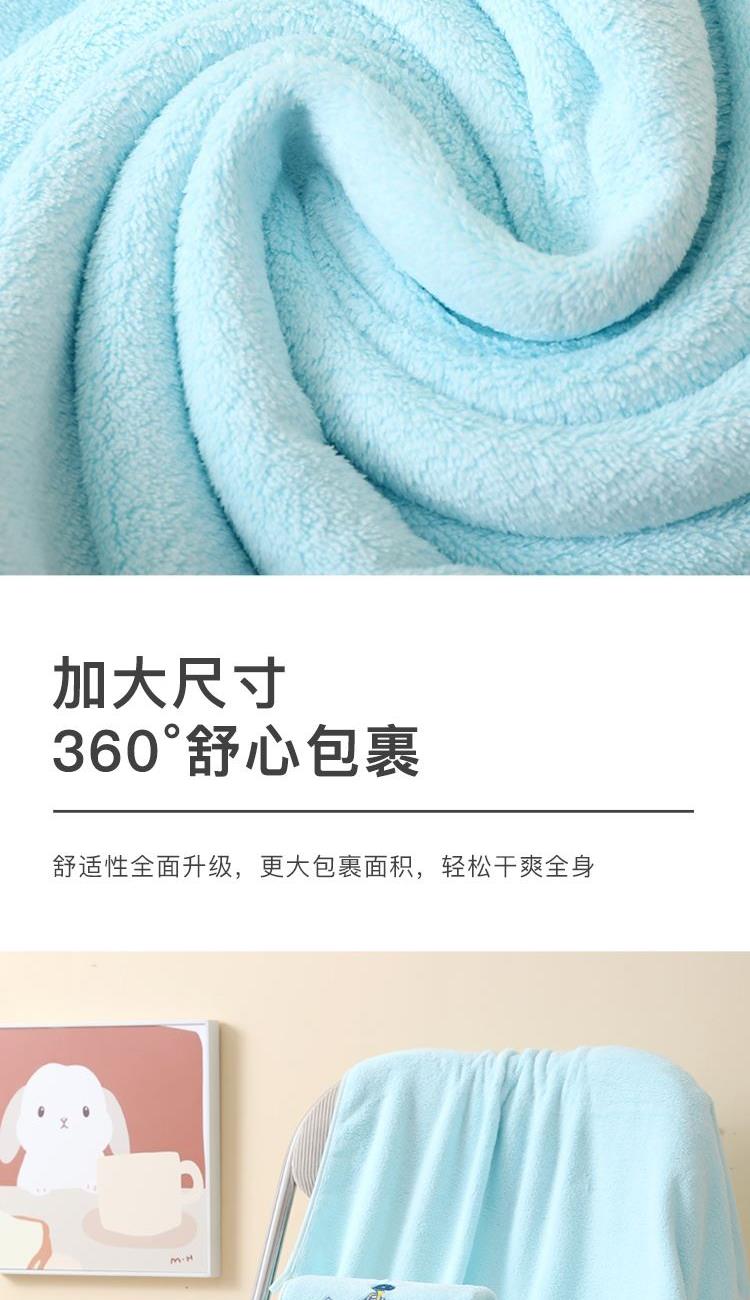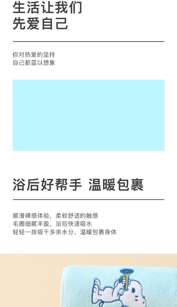 商品货号:SBT21 商品面料:底纱聚酯纤维 绒毛纱聚酯/聚酰胺复合纤维 商品颜色:蓝 精细纤维 纹理织造 绵柔吸水 亲肤细腻 加大尺寸 舒心包裹 用料更足 吸水更强 一巾多用 可用可裹 方便实用 活性印染 色牢度高 多次洗涤也不易破坏纱线结构 易洗易干 越洗越柔软 平整包边 精致细节 彰显品质