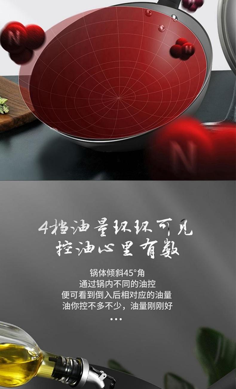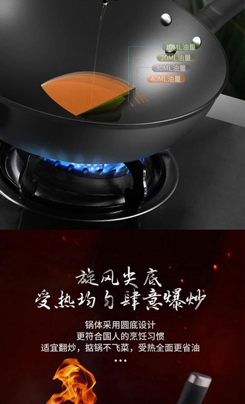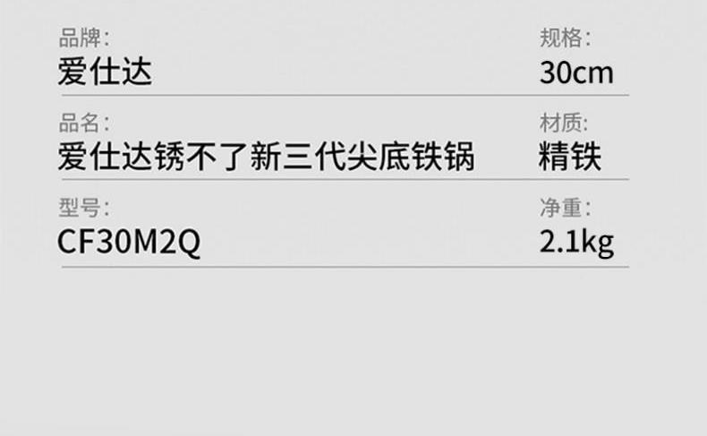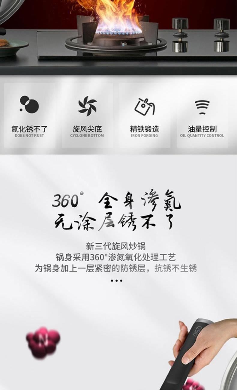 产品型号:CF30M2Q 产品规格:30cm 彩盒尺寸:510*330*168 净重:2.33kg 1、氮化锈不了,旋风尖底,精铁锻造,油量控制。 2、新三代旋风炒锅锅身采用360°渗氮氧化处理工艺为锅身加上一层紧密的防锈层,抗锈不生锈。 3、锅体倾斜45°角通过锅内不同的油控便可看到倒入后相对应的油量油你控不多不少,油量刚刚好。 4、锅体采用圆底设计更符合国人的烹饪习惯适宜翻炒,掂锅不飞菜,受热全面更省油。 5、坚固铆钉铆接一次成型,平滑牢固。