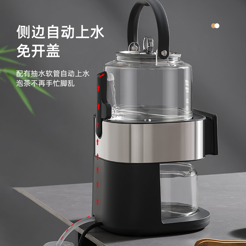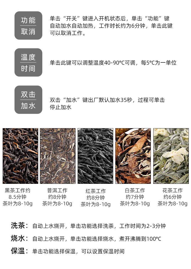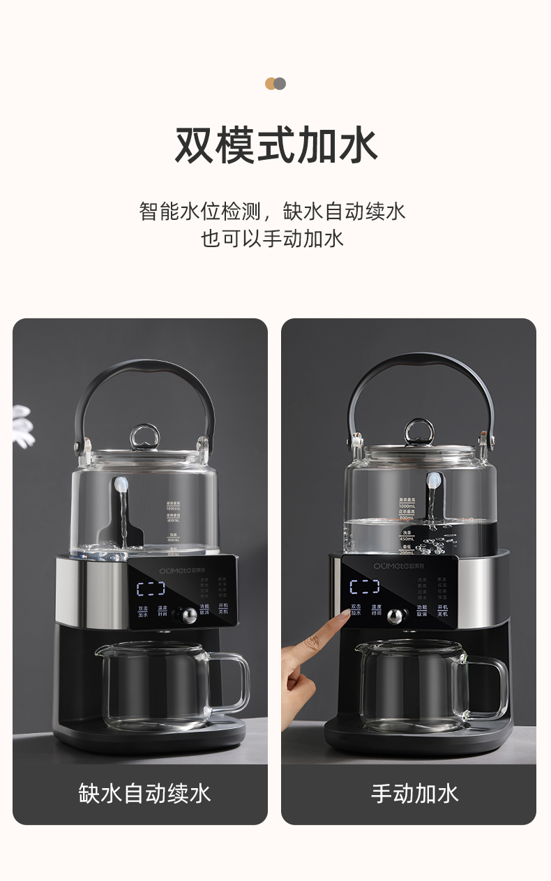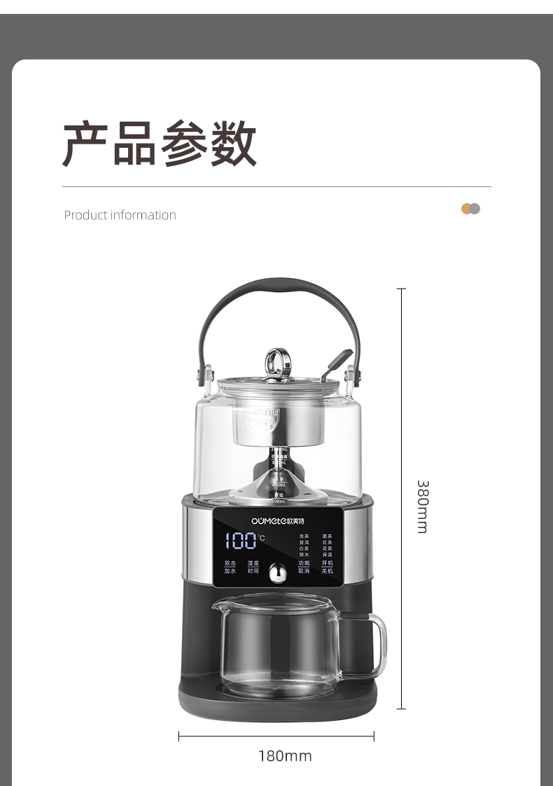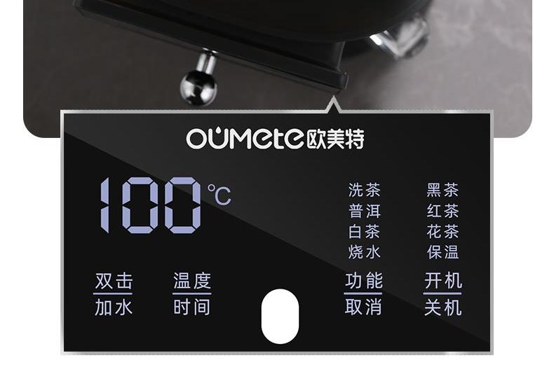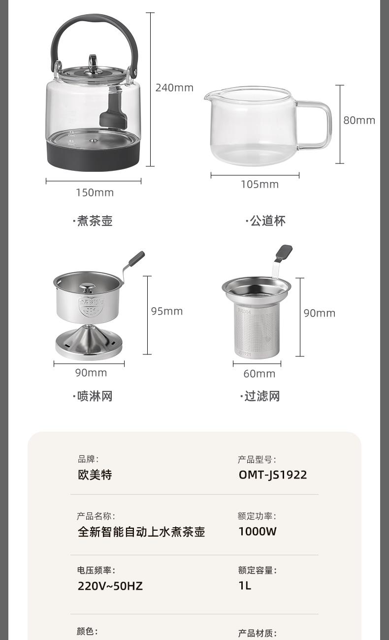 全新智能自动上水煮茶壶 型号:OMT-JS1922 功率:1000W 容量:1升 按键功能:洗茶、黑茶、普洱、红茶、白茶、花茶、烧水、保温、加水、调温 大屏幕设计更美观,操作更方便,更时尚 多重安全设计,无水自动保护,过热自动保护 耐热玻璃杯体,骤冷骤热不爆裂,使用放心 双网配置,多功能设计煮茶、烧水、花茶。 侧面上水设计,使用更方便,水路畅通不堵塞 按压式开关,使用更方便,更易操作 大提梁设计,使用更方便,外观更精致