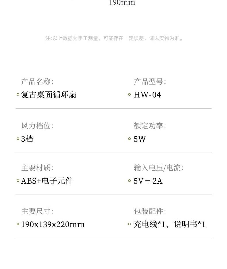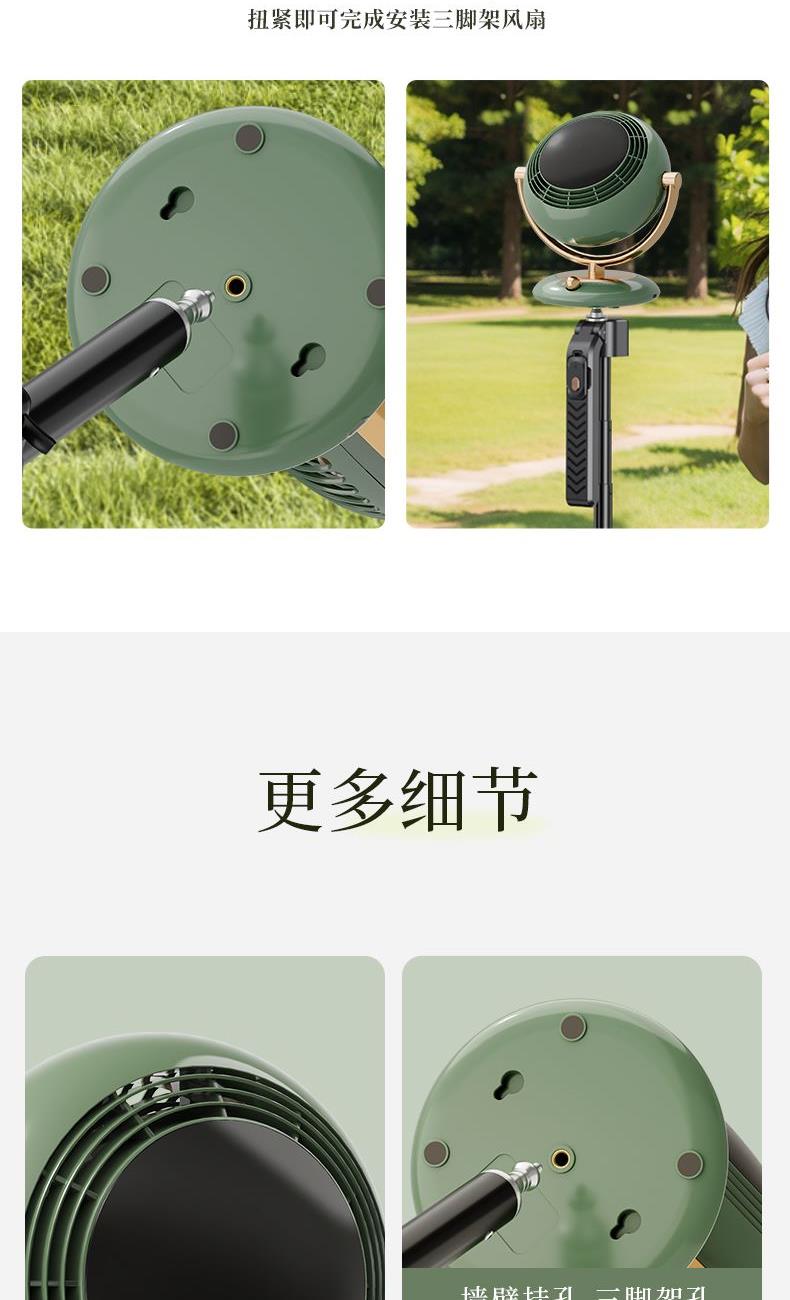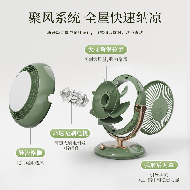 风力档位:3档 输入电压/电流:5V-2A 电池容量:2000mA 主要材质:ABS+电子元件 产品颜色:墨绿 产品尺寸:195*139*216mm 包装尺寸:160*1145*225mm 净重:580g 毛重:700g 包装内含:主机|充电线|说明书 风力强劲:无刷电机 , 3档风速调节 ,升级版循环扇叶强劲送风。 温馨夜灯照明三档可调节 ,1档强光 2档白光 3档弱光 节能环保 :低耗能 ,低噪音运行 ,仿自然风设计促进室内空气流动 , 改善空气质量 , 减少人体危害。 多功能: 可调节出风口 ,满足各种场景应用, 可挂式底座 ,分分钟秒变吊扇。