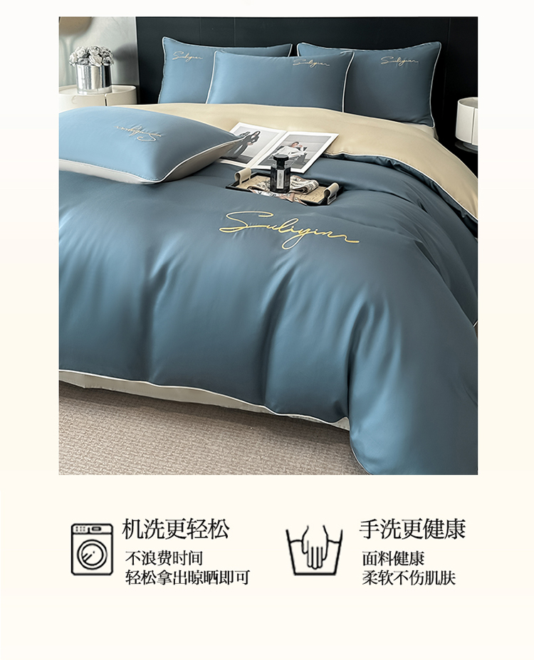 1:打造高颜值空间:享受浪漫生活: 水洗冰丝刺绣四件套系列 2:柔软与舒适兼得宠爱加倍 生活需要浪漫需要爱更需要那份从容不迫的优雅 尺寸:被套:200*230cm*1 床单:230*245cm*1 枕套:48*74cm*2 包装:彩盒