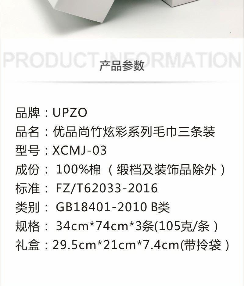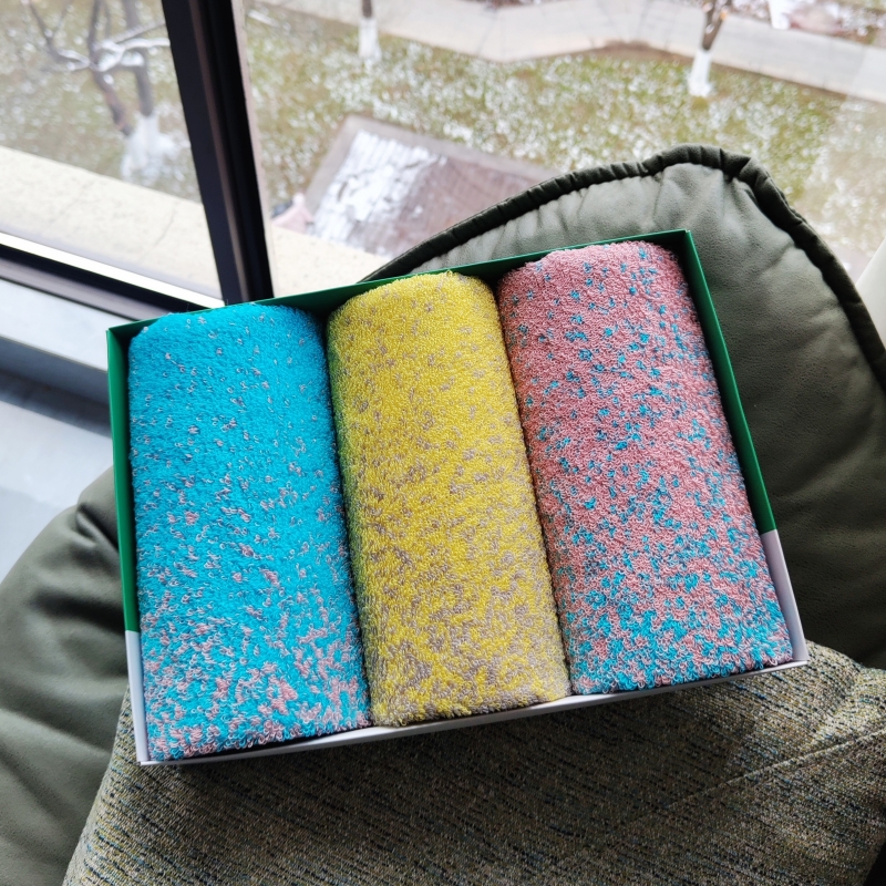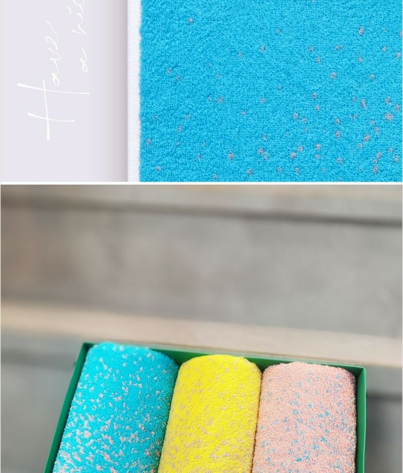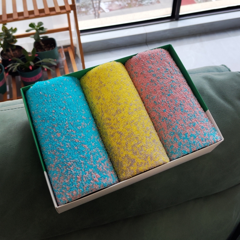 成份: 精梳棉 标准: FZ/T62033-2016 类别: GB18401-2010 B类 规格: 34CM*74CM *3 条 (105g每条) 礼盒: 29.5×21×7.4cm 天地盖+拎袋 时尚靓丽外观设计 采用优质精梳棉 先染色后提花织造而成 集外观美丽和优良品质为一体 两个颜色的设计取星空与原野为元素。