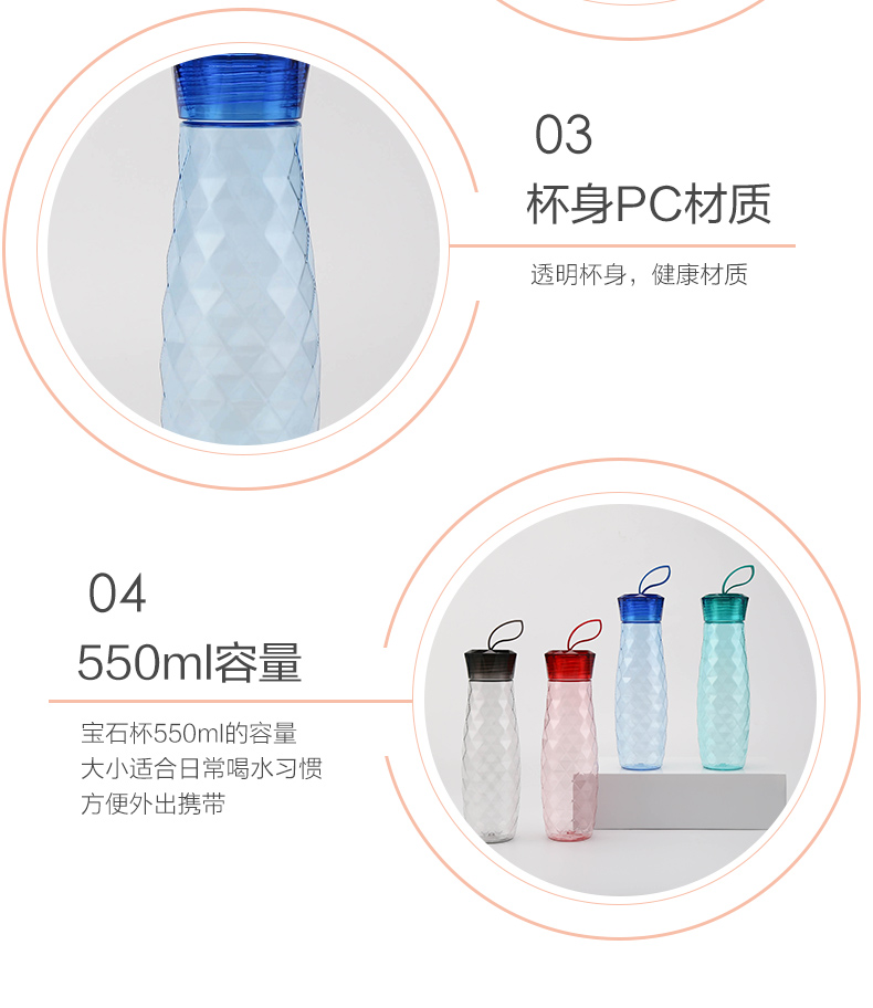 材质:瓶体-PC 毫升:550ml 产品颜色:红色 健康PC材质 宝石杯杯身采用了放心的PC材质,健康安心。 曲线杯身设计,手感舒适,适合多种场合使用。 可以拆卸食品用硅胶密封圈,采用的是硅胶成分,可以拆卸下来,方便清洗。 三款颜色多种选择