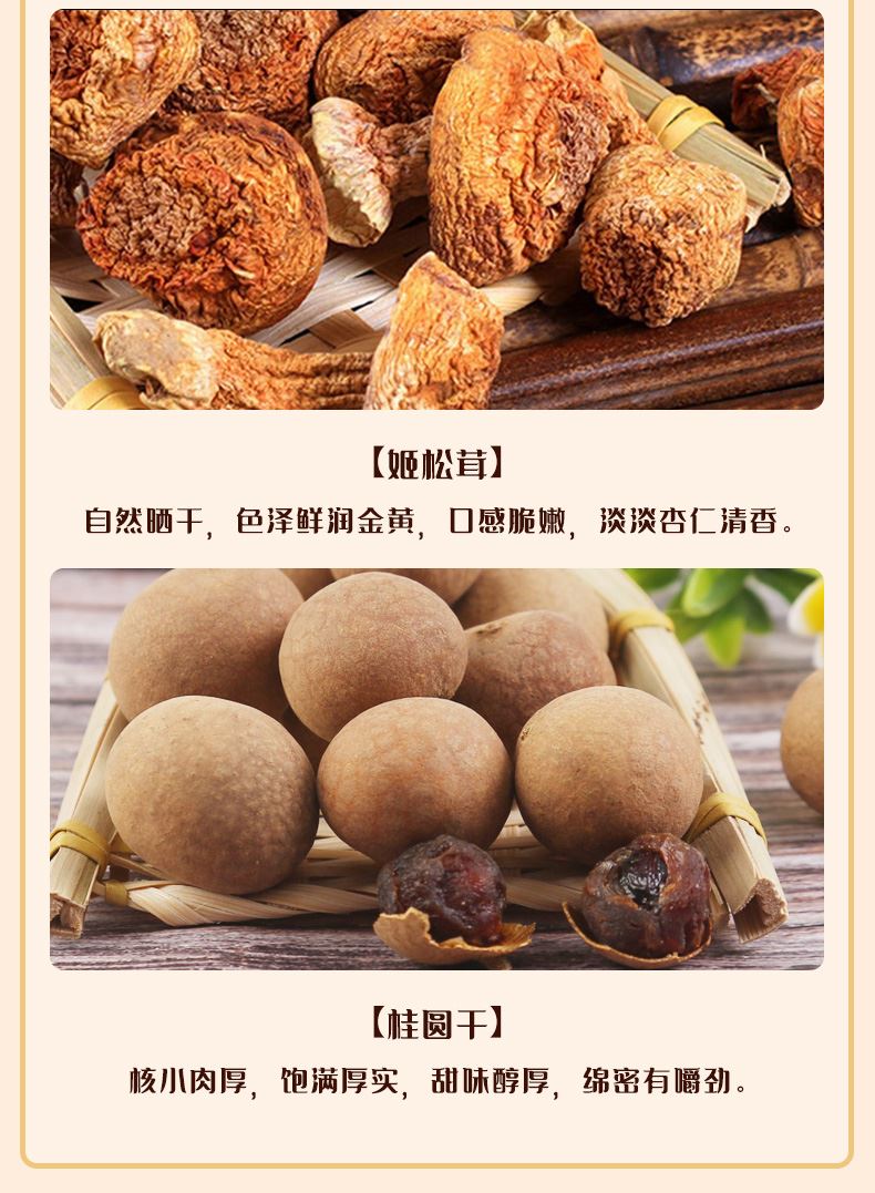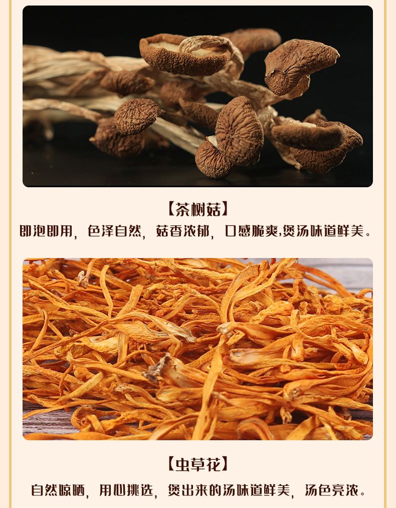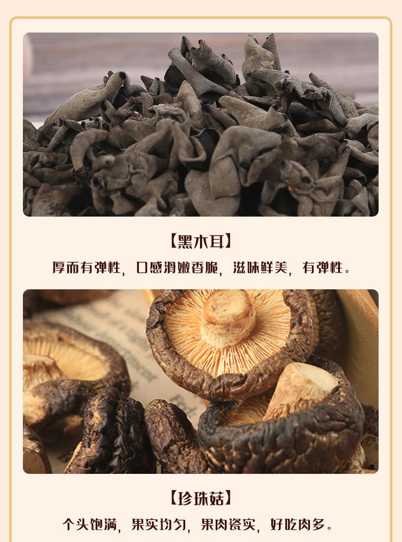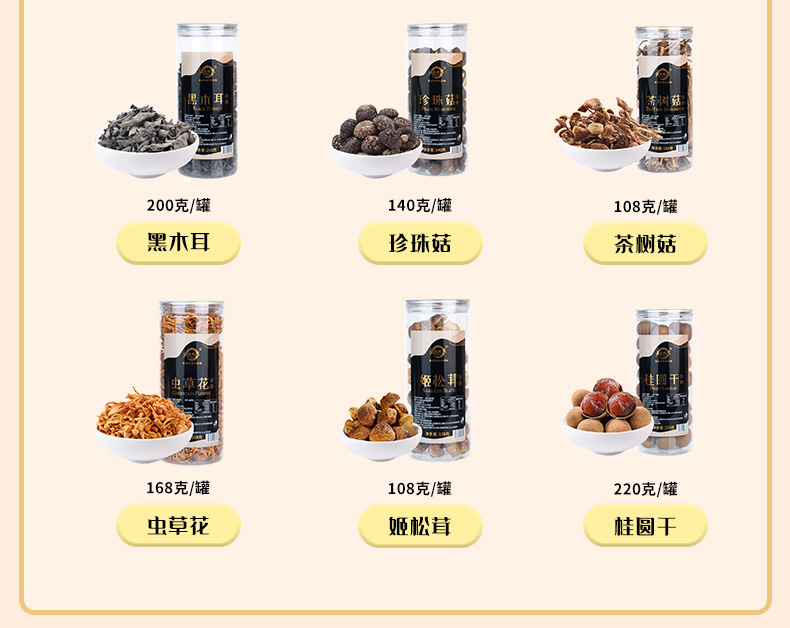 彩盒尺寸:450*100*360mm 产品规格:944克 内配: 1.姬松茸108克 2.黑木耳200克 3.虫草花168克 4.珍珠菇140克 5.茶树菇108克 6.桂圆干220克