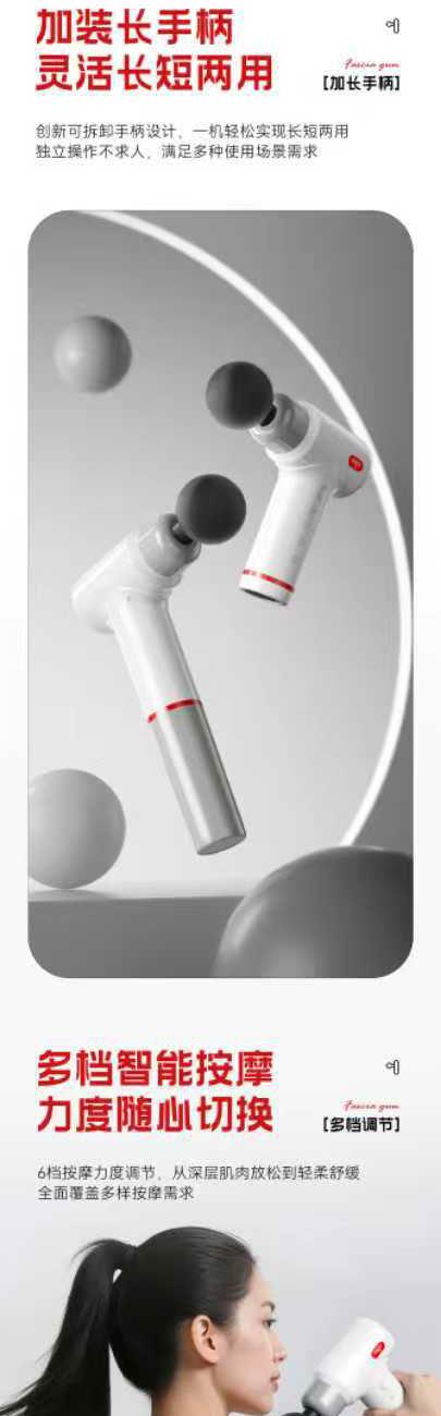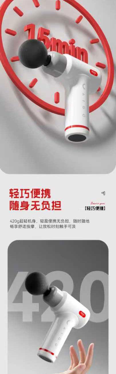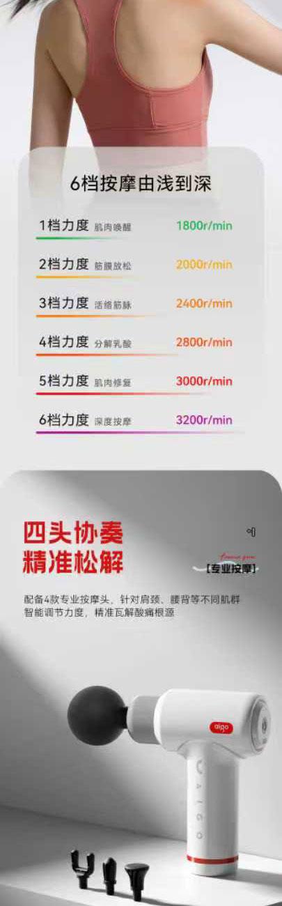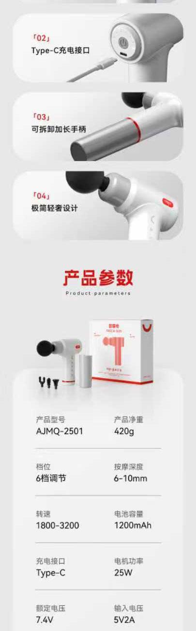 4个按摩头+Type-C充电 15分钟定时,自动关机 久持不累手,加长手柄可拆卸,轻松按摩死角 噪音45-50db,低噪音运行 6kg推力,6-10mm科学冲程 彩色幻彩呼吸灯带 420g轻巧机身 功率:25w 包装尺寸:210*195*63mm 按键款档位:1-6档 产品毛重:600g 包装方式:彩邮外 电池容量:1200毫安