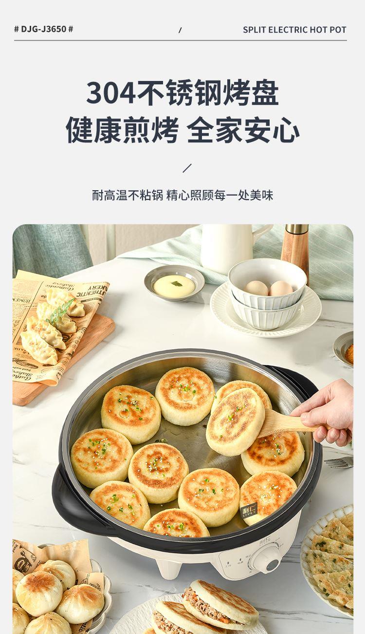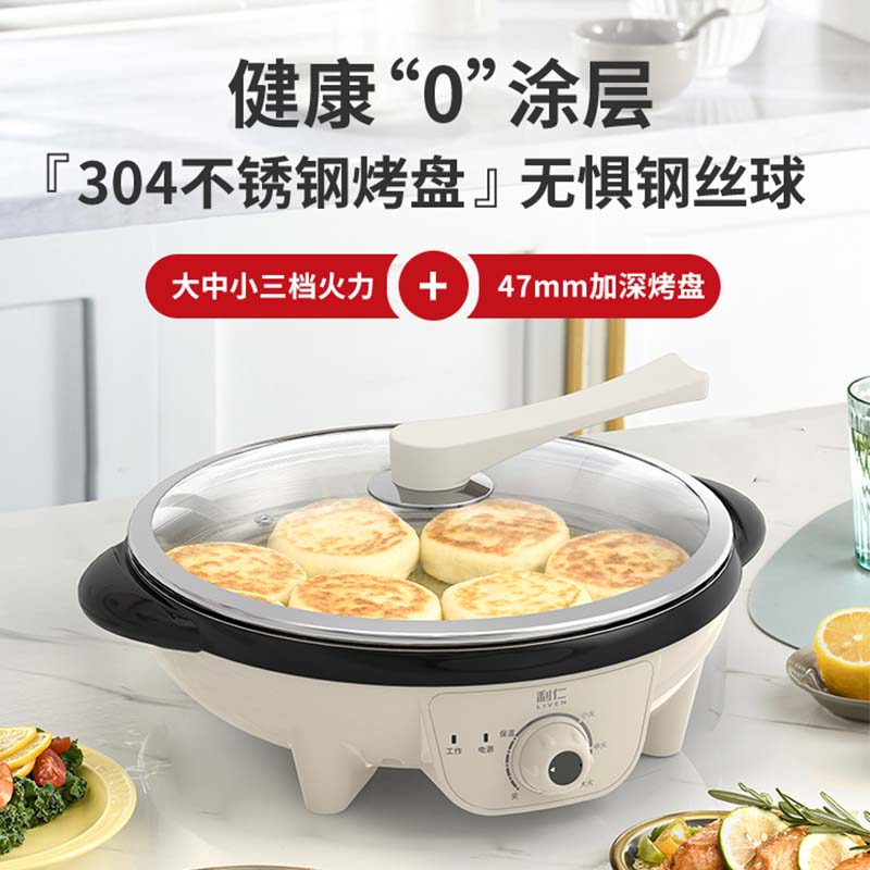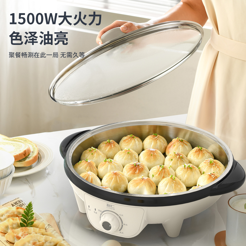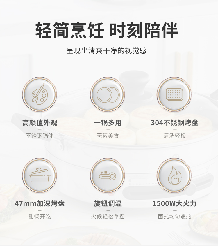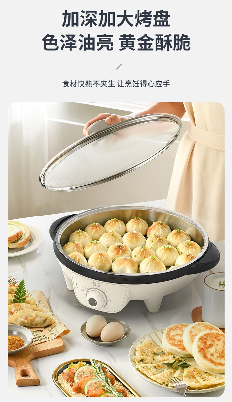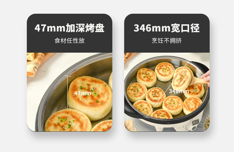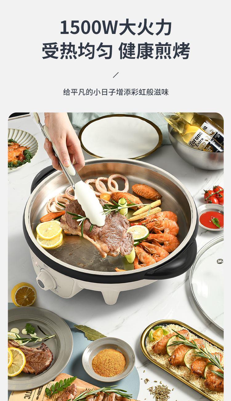 304不锈钢烤盘,耐高温不粘锅 1500W大火力,受热均匀 健康煎烤 47mm加深烤盘,让烹饪得心应手 346mm宽口径,烹饪不拥挤 旋钮三档控温,满足不同烹饪火力调节