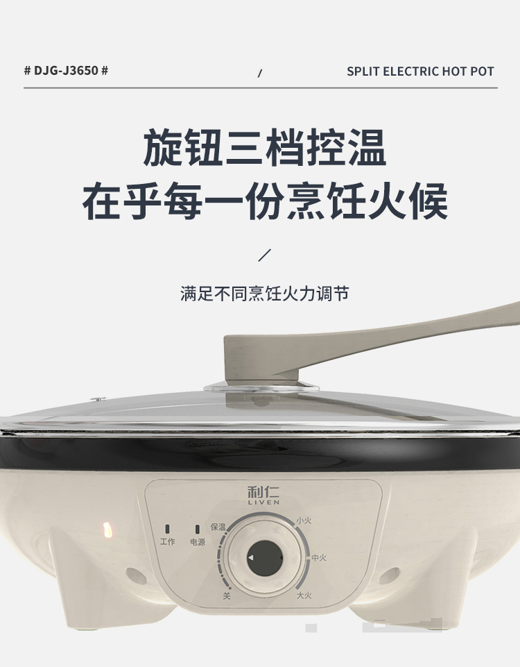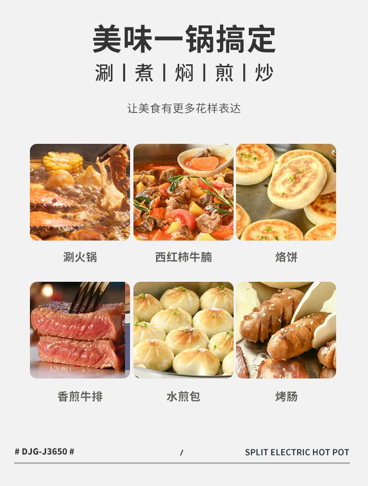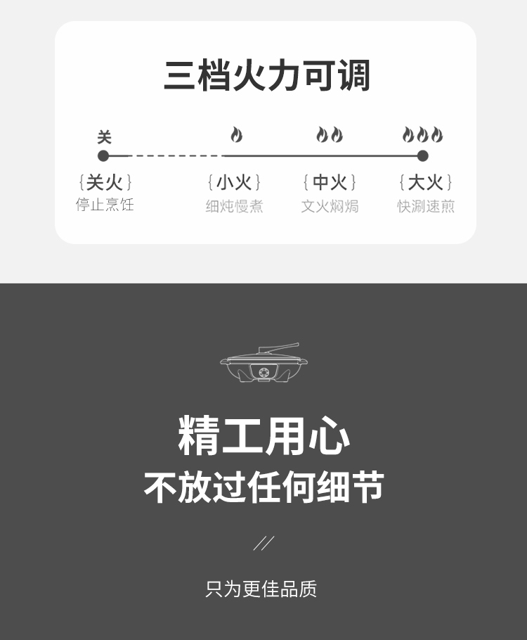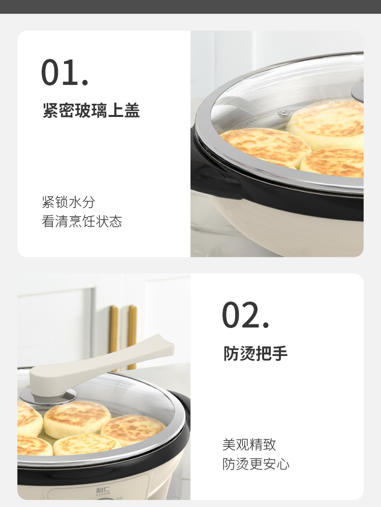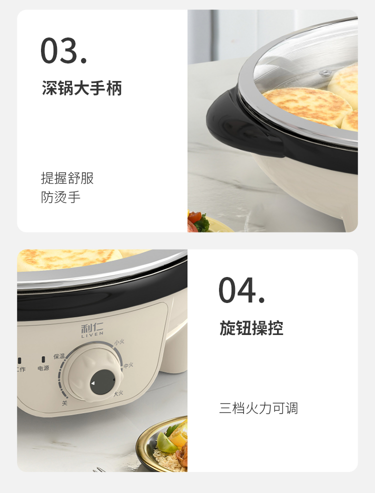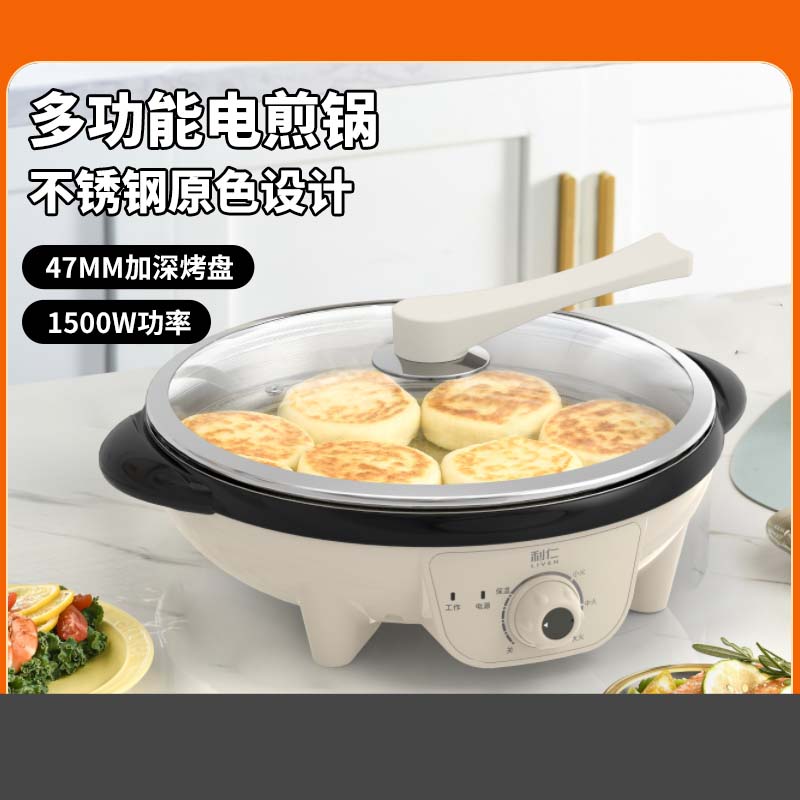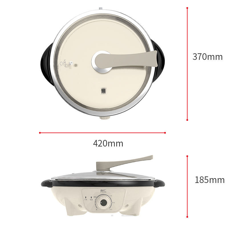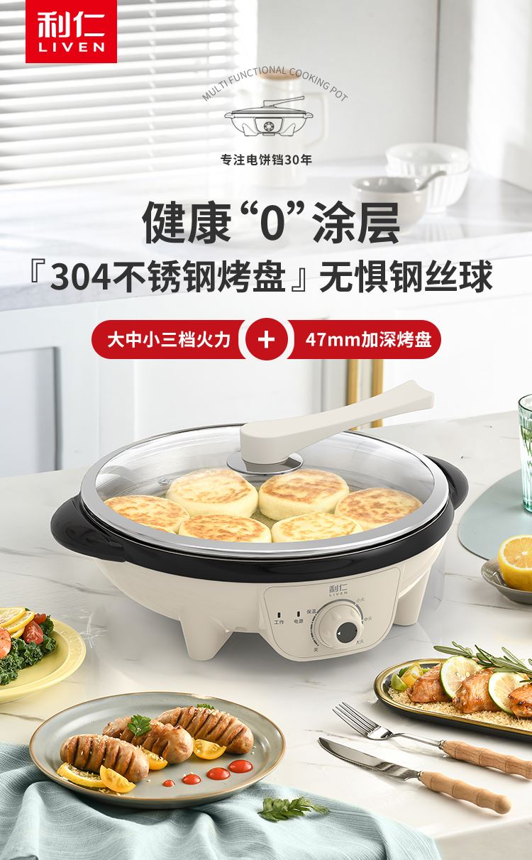 304不锈钢烤盘,耐高温不粘锅 1500W大火力,受热均匀 健康煎烤 47mm加深烤盘,让烹饪得心应手 346mm宽口径,烹饪不拥挤 旋钮三档控温,满足不同烹饪火力调节