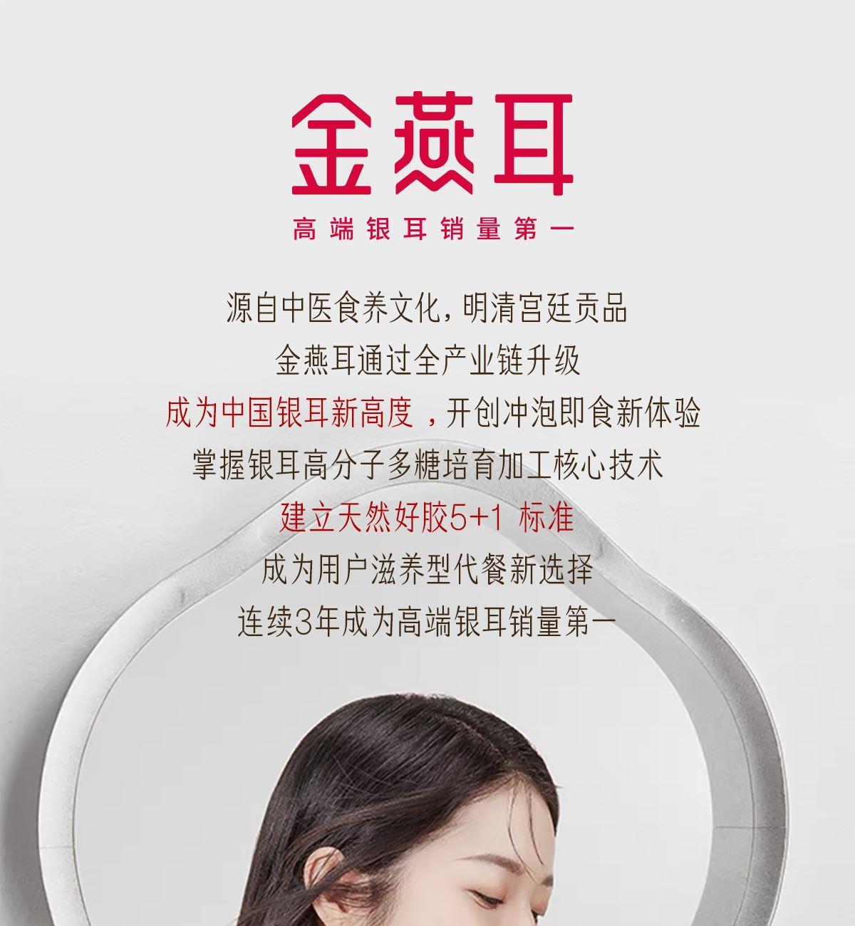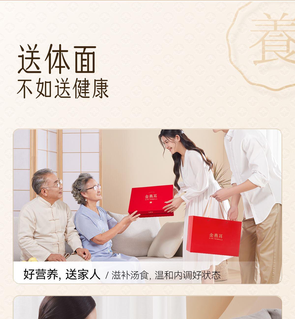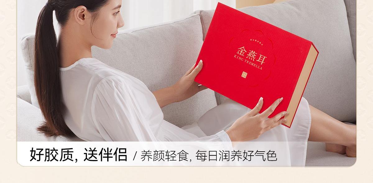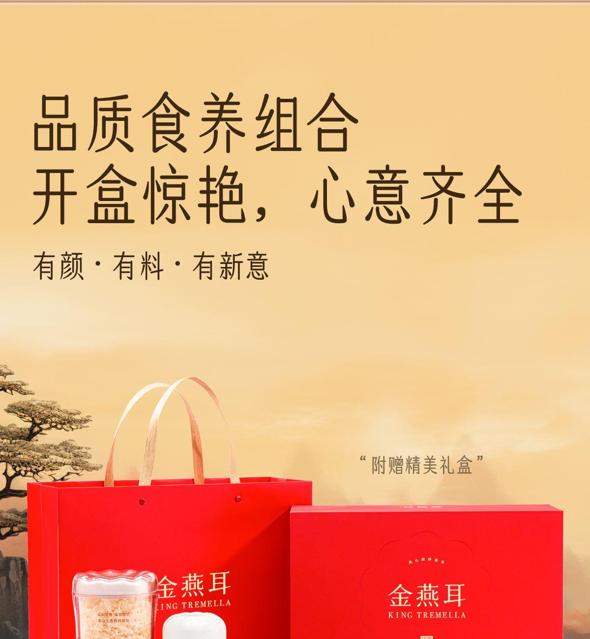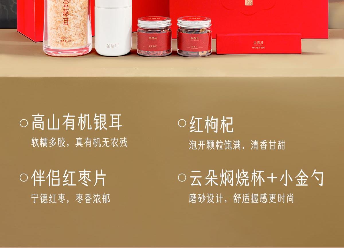 内含:纯萃80g*1、红枣片40g*1、枸杞60g*1、小金勺*1、焖烧杯*1、手提袋*1 净含量:180g 礼盒尺寸:32.5*23*11cm 保质期:12个月 推荐理由: 精选三分之一的优质耳瓣,13朵鲜银耳=一罐80克银耳干品 营养价值含量高,20+种营养成分,胶养活性高分子含量为84%-93%,是普通银耳的3-4倍 免洗免泡发,煮10分钟、焖20分钟即食 胶质浓稠,口感爽滑,鲜香软糯 红色礼盒,轻奢美观,年节拜访礼赠佳品