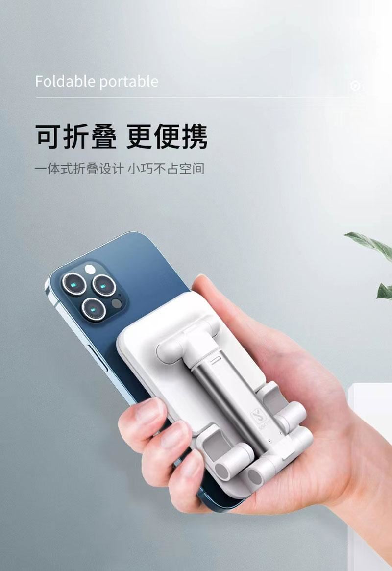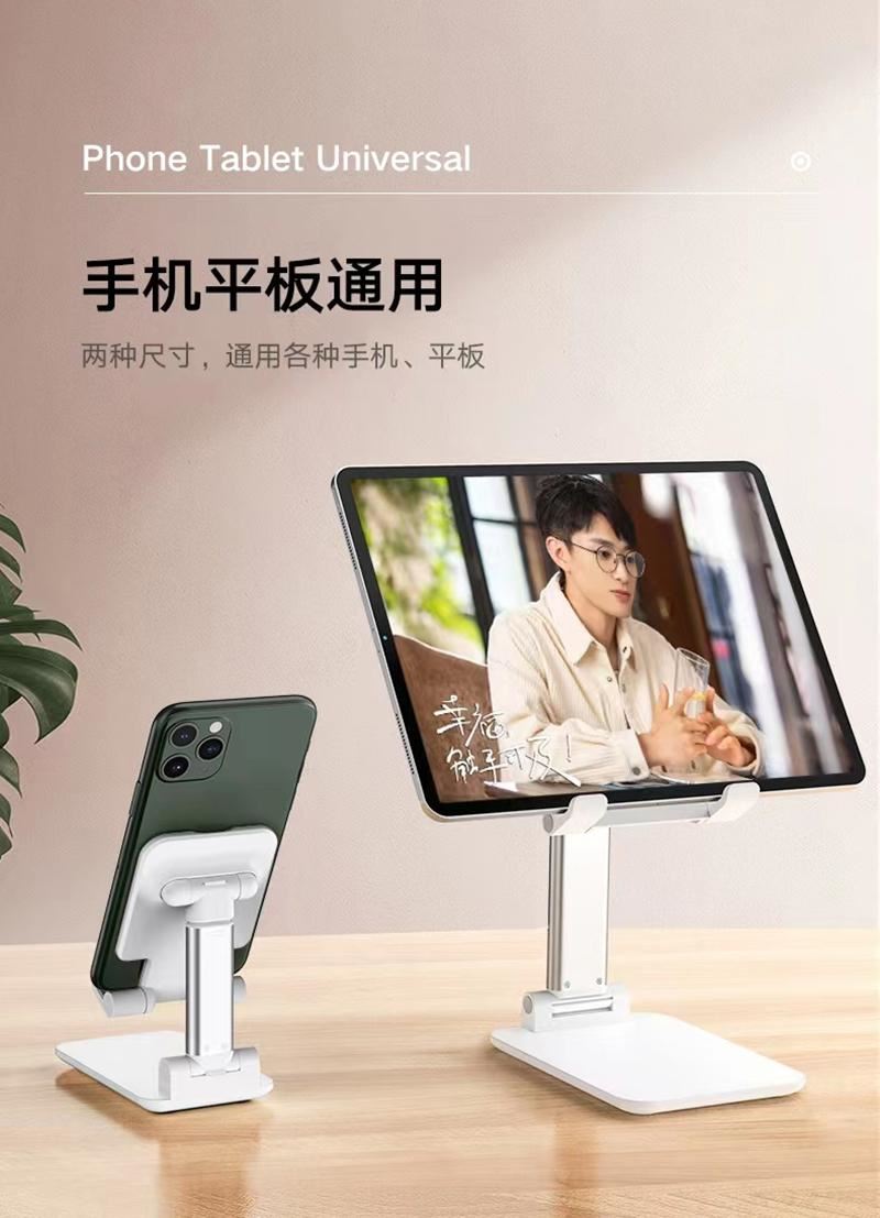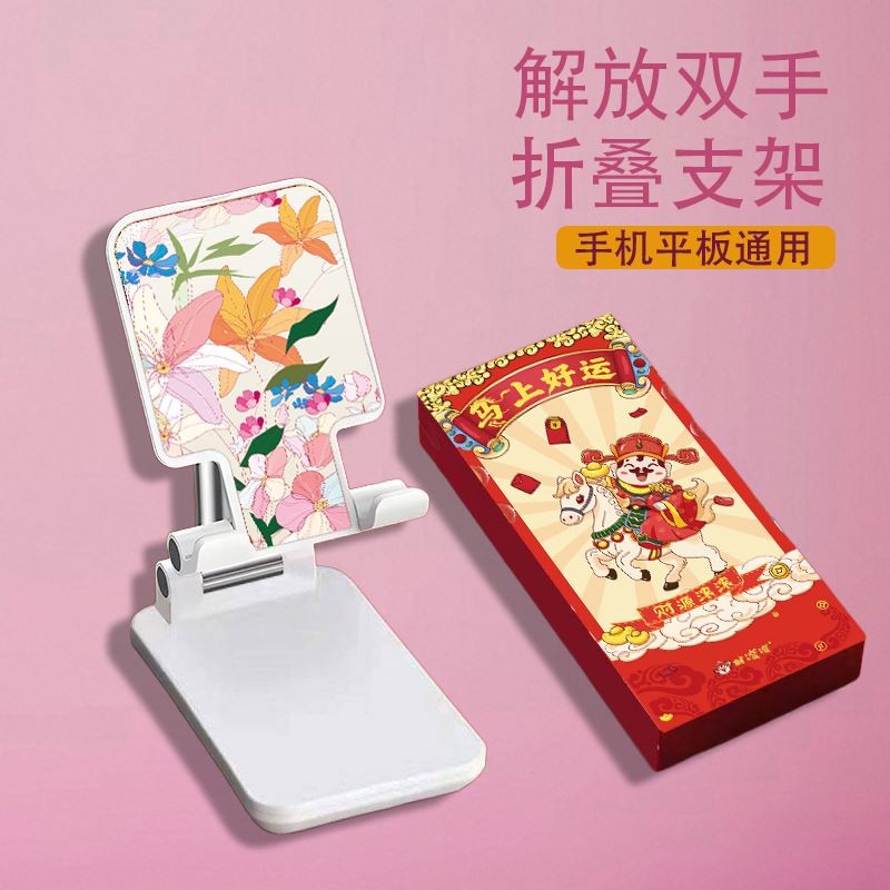 材质:ABS原料+铝合金属漆杆; 颜色:白色 产品尺寸(折叠后):112*68*28mm 国潮包装尺寸:18*8*2.8cm • 可伸缩折叠手机支架, • 自由伸缩高度可调,手机平板通用,稳固防滑不晃动 • 可定制logo