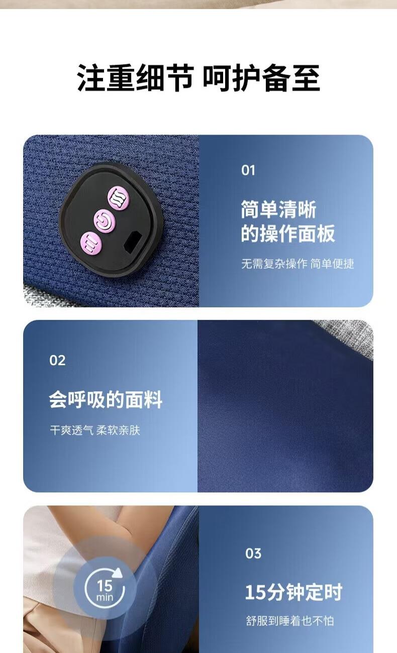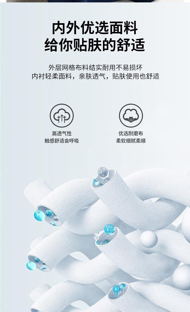5. 贴心细节拉满,使用安全又舒适:外层网格布料结实耐用、不易损坏,内衬轻柔面料亲肤透气,贴肤使用无不适感;15分钟智能定时功能,到点自动关机,有效防止过度按摩损伤肌肉,安全更省心;低噪运行设计,办公、居家使用不扰人。