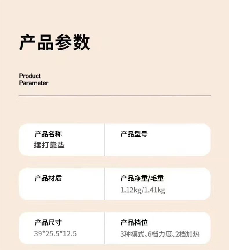 3. 3大模式+6档力度,适配全人群需求:预设3种捶打模式,快慢有序、轻重有度;6档力度可自由调节,无论是老人需要的轻柔放松,还是久坐人群需要的深度释压,都能匹配,全家老少都能找到适合自己的按摩节奏。