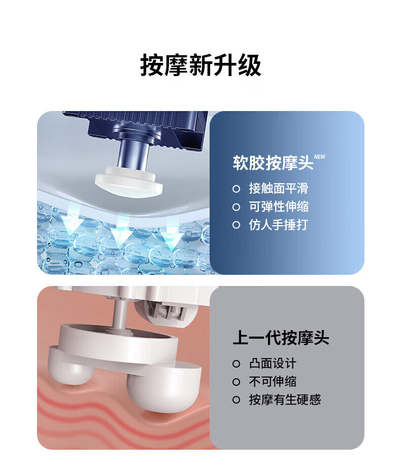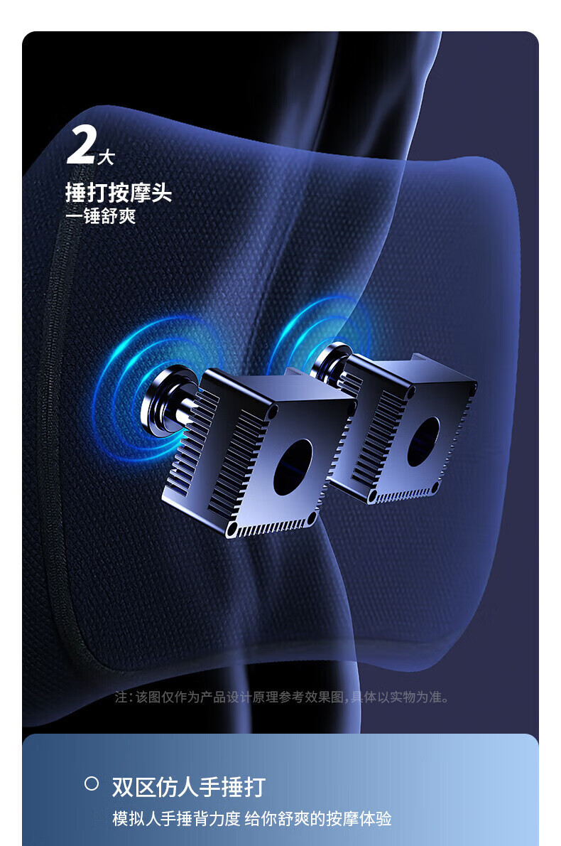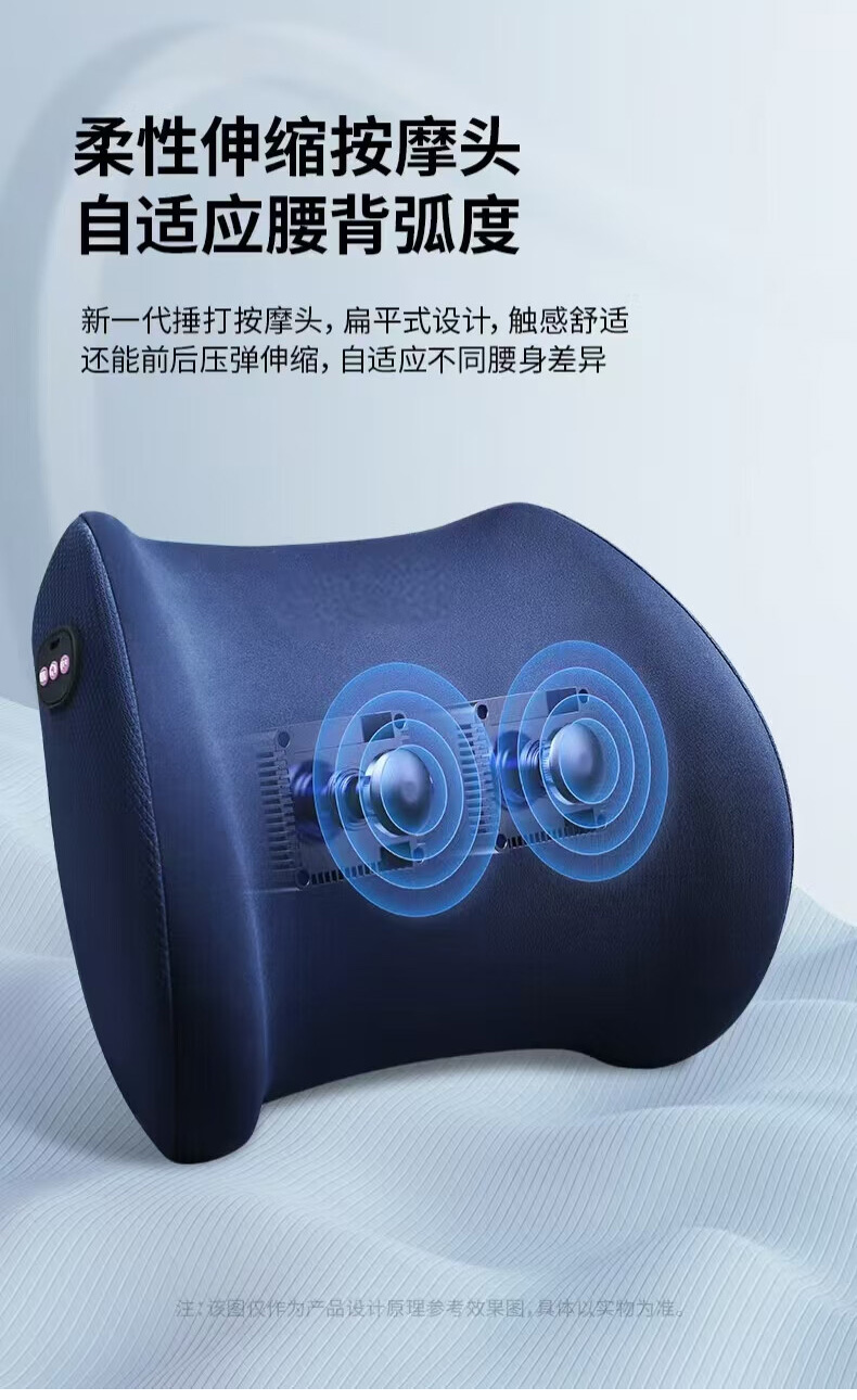 2. 双区仿生捶打,还原真人捶背爽感:双区同步捶打设计,搭配新一代扁平式柔性软胶按摩头,可弹性伸缩、前后压弹,能自适应不同腰身差异,曲线紧密贴合腰部。智能芯片调控,手法如专业按摩匠人,不乱打不生硬,触感舒适不硌肉,真正还原真实捶背的舒适力道。